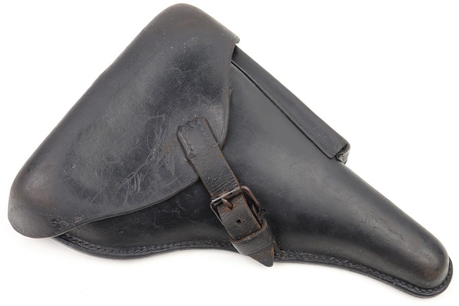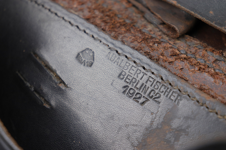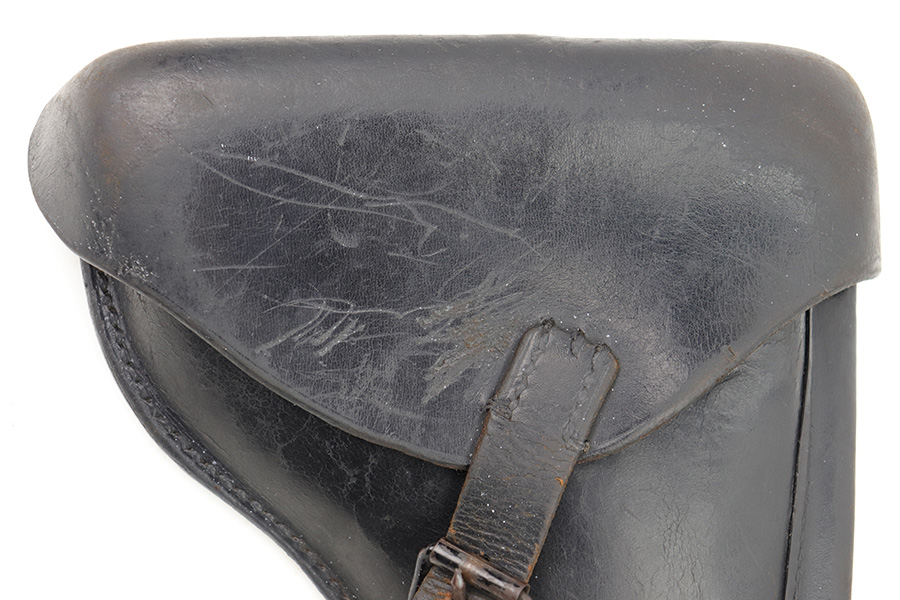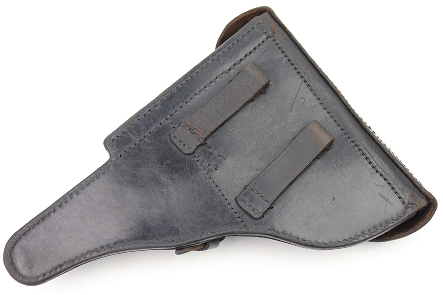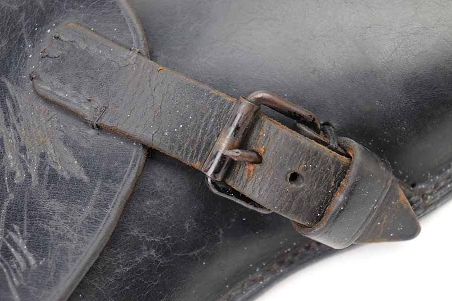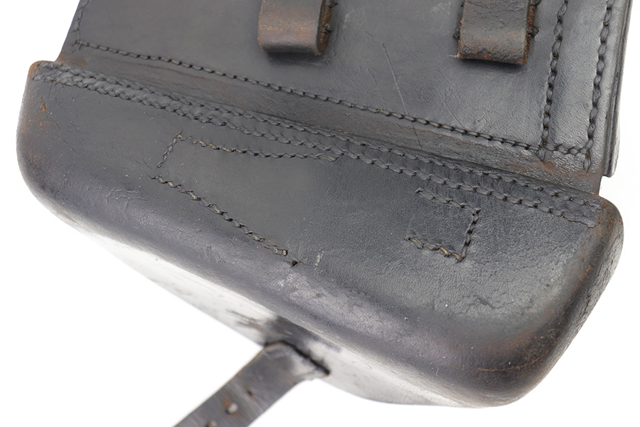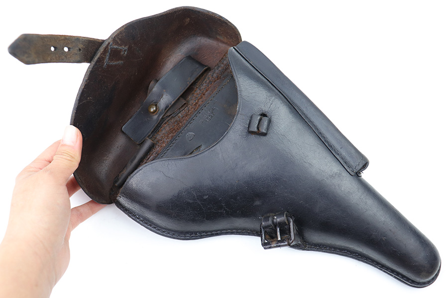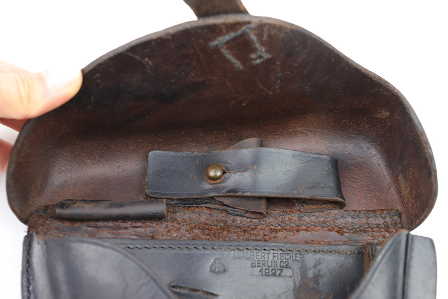 3/14/23 – This is an original and rare variation Luger holster from 1927. There are very few holsters made and offered today from the 1920s as Germany was not allowed to have a military. Simson was one of the only manufacturers for Lugers during this time, and not many were made. This holster is a great example as it has a crisp, clear maker and date stamp on the interior leather. There’s also a Weimar eagle proof stamp, indicating this was one of the very few holsters allowed to be issued to police or military guard of some sort. Also interesting, this holster has a K-Date style interior cleaning rod and tool pouch. The leather is in great condition despite some surface scratches near the closure strap on the front lid. The rest of the leather has mild pliability and no major issues. All original stitching intact as well and a fairly clean interior leather.