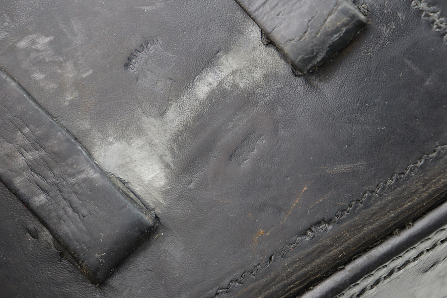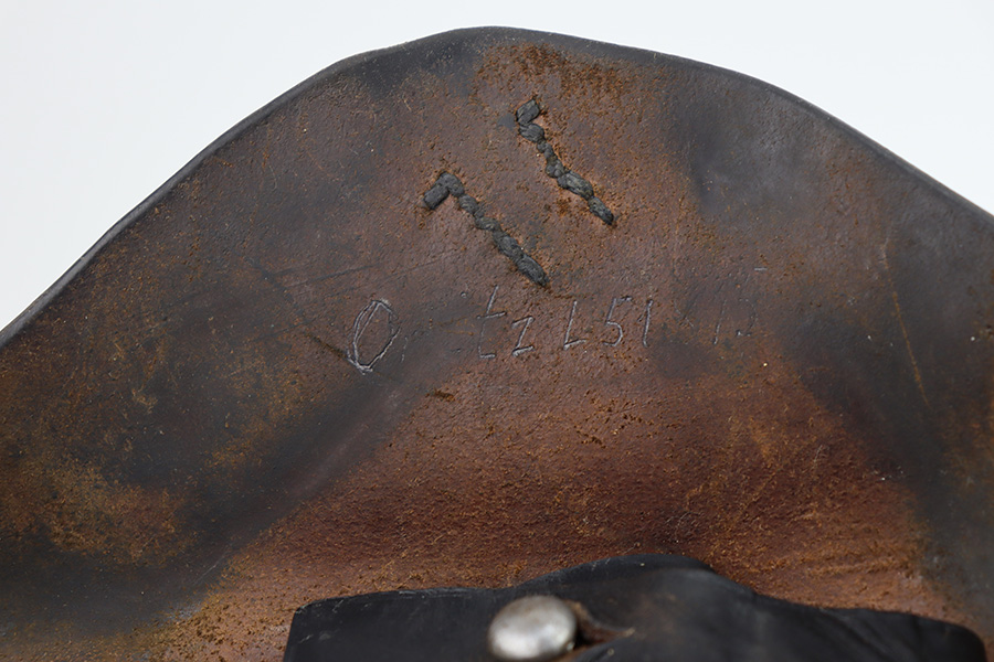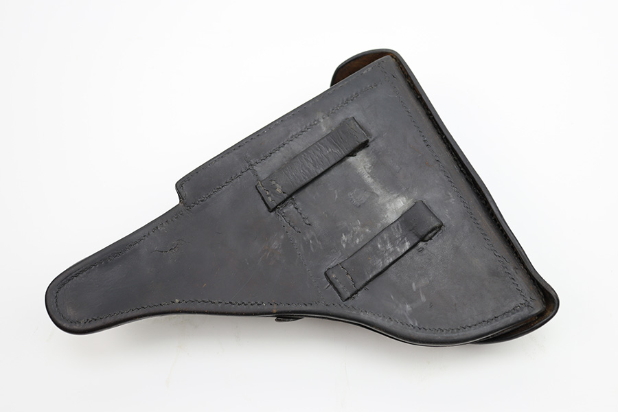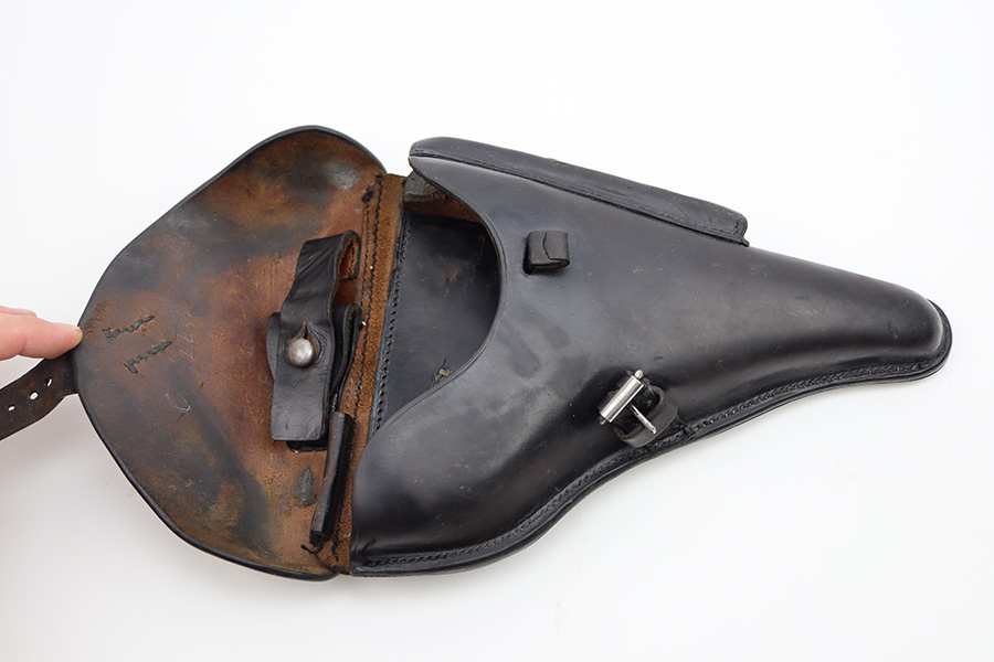 11/10/23 – This is a nice 1934-dated Holster for a “K Date” Mauser Luger. The back is Waffen-proofed, 1943-dated, and has a maker mark – all markings have gotten faint over time. The inside of the holster shows all of the proper “K date” features, such as the leather strap and pouch for the K Date cleaning rod. Overall, the holster is nice – the leather is soft and the stitching is intact. The leather has gotten a little dull over time. Some light surface cracking in the leather on the closure strap. There are a few numbers and letters written on the inside.