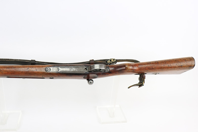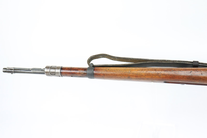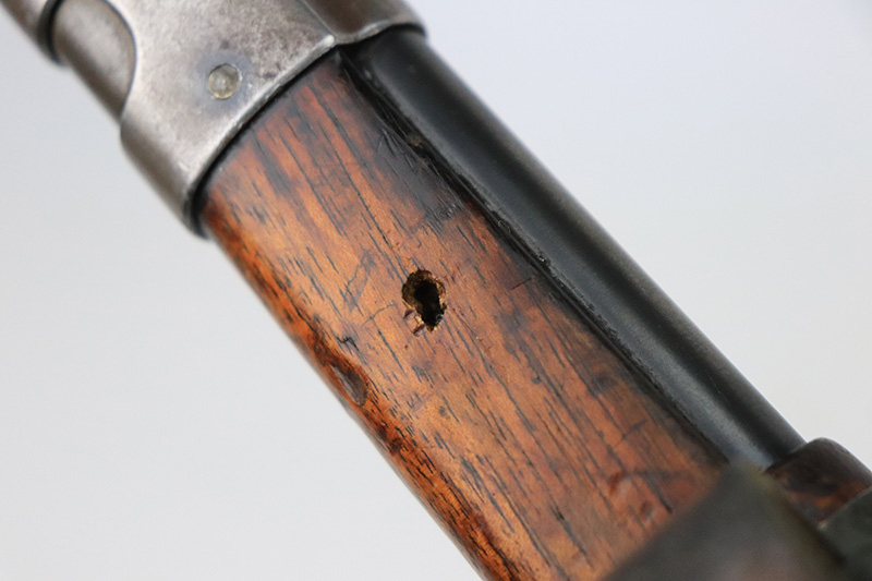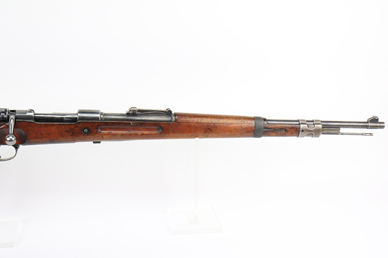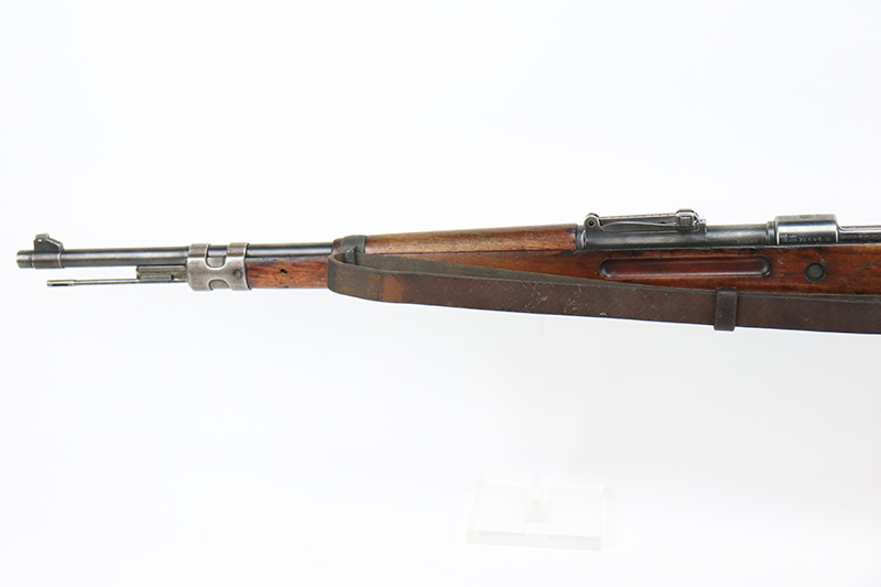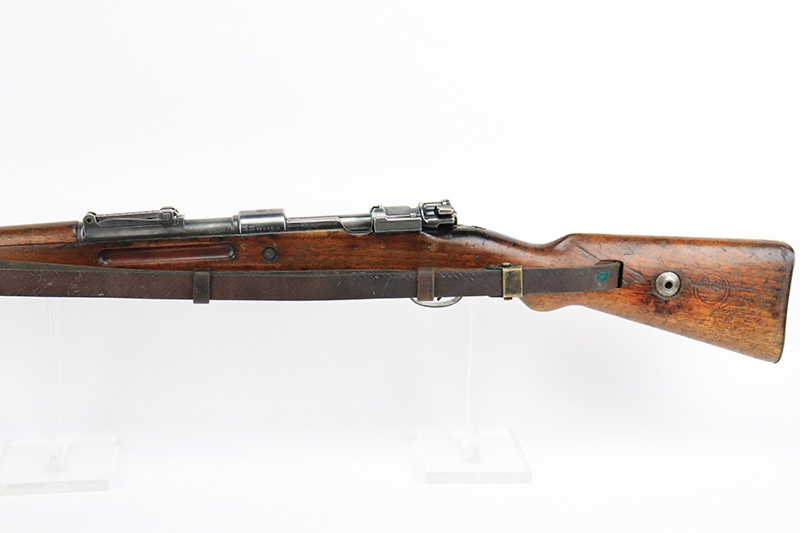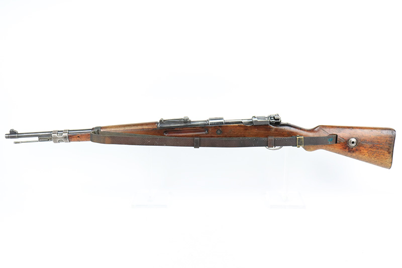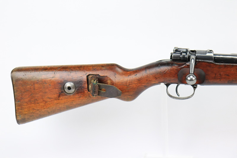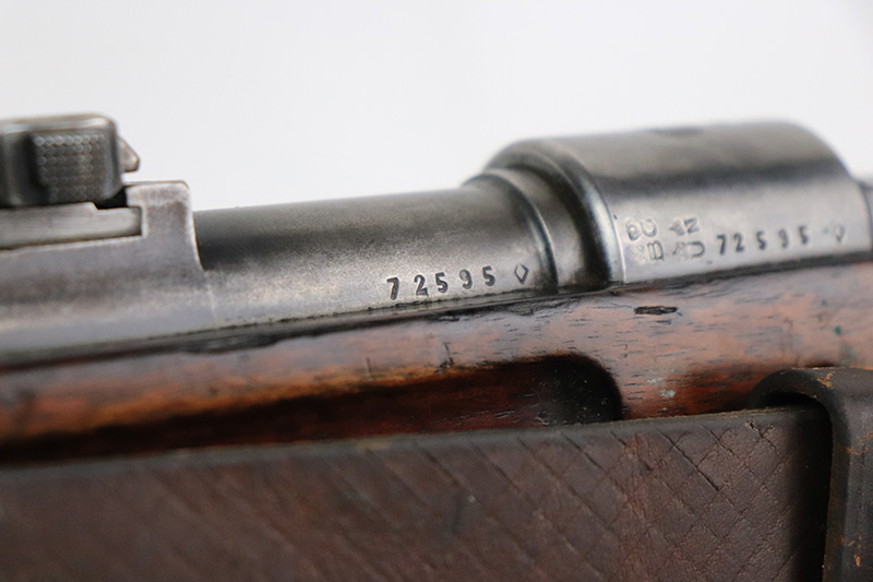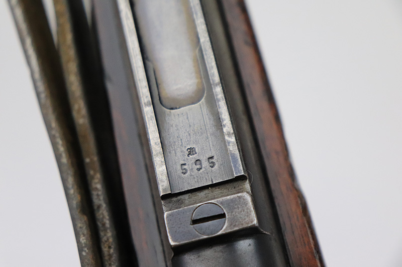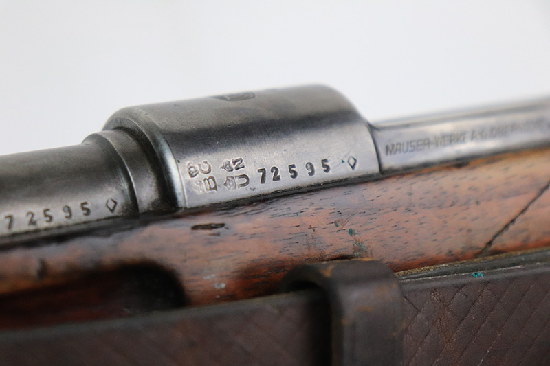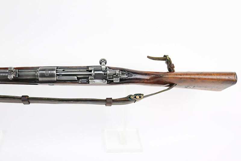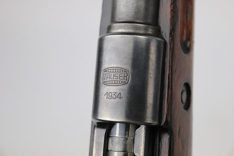 8/17/22 – This is a rare Mauser Banner 98k from 1934 with “Ch.d.A” cartouche on stock. In the fall of 1934, Director Zillinger authorized sales to the head of the training system of the SA leadership – the Chef des Ausbildungswesens der obersten S.A. – Führung, or Ch.d.A. Ch.d.A. denotes the lead SA department in charge of equipping training detachments, and as such was involved in securing small arms for this purpose. This gun has the proper Ch.d.A. cartouche on the left side of the stock. Otherwise standard commercial gun with 1934 date and banner Mauser on receiver ring. The rifle is original and matching throughout aside from the rear band, which has been replaced. Matching numbers on the bolt, barrel, receiver, trigger group and rear sight assembly. The bluing on the metal parts is original but shows some thinning throughout, and is most pronounced on the trigger group. The stock shows two scratches/gouges on the left side but no cracks. The bore is shiny with strong rifling but there’s a patch of pitting in the grooves about 2/3 of the way through the barrel. Comes with a period original sling and a cleaning rod.