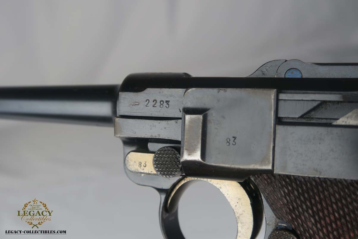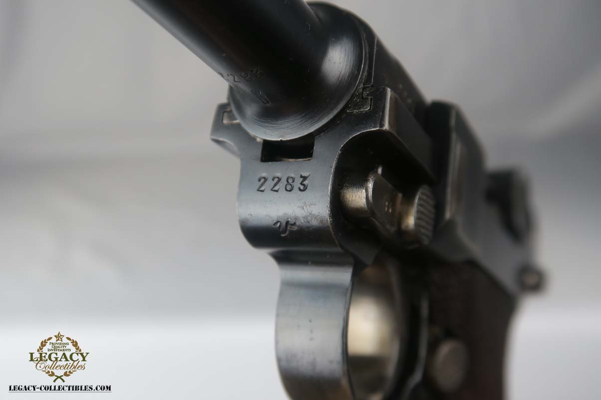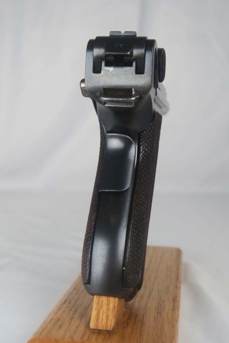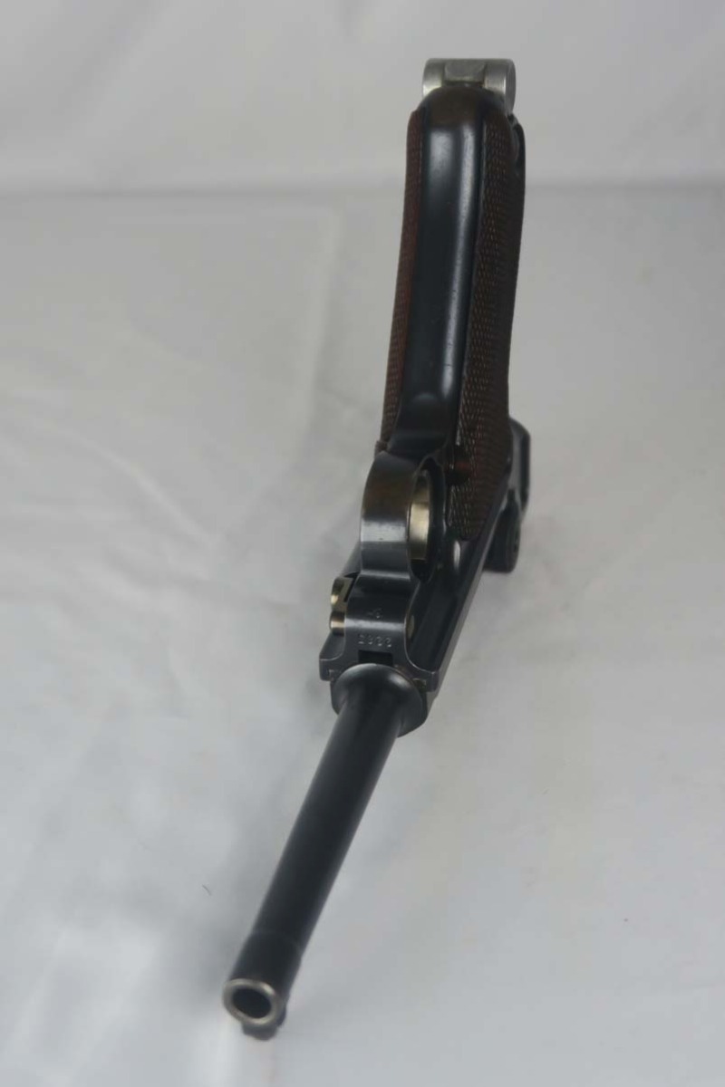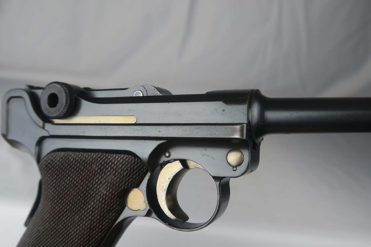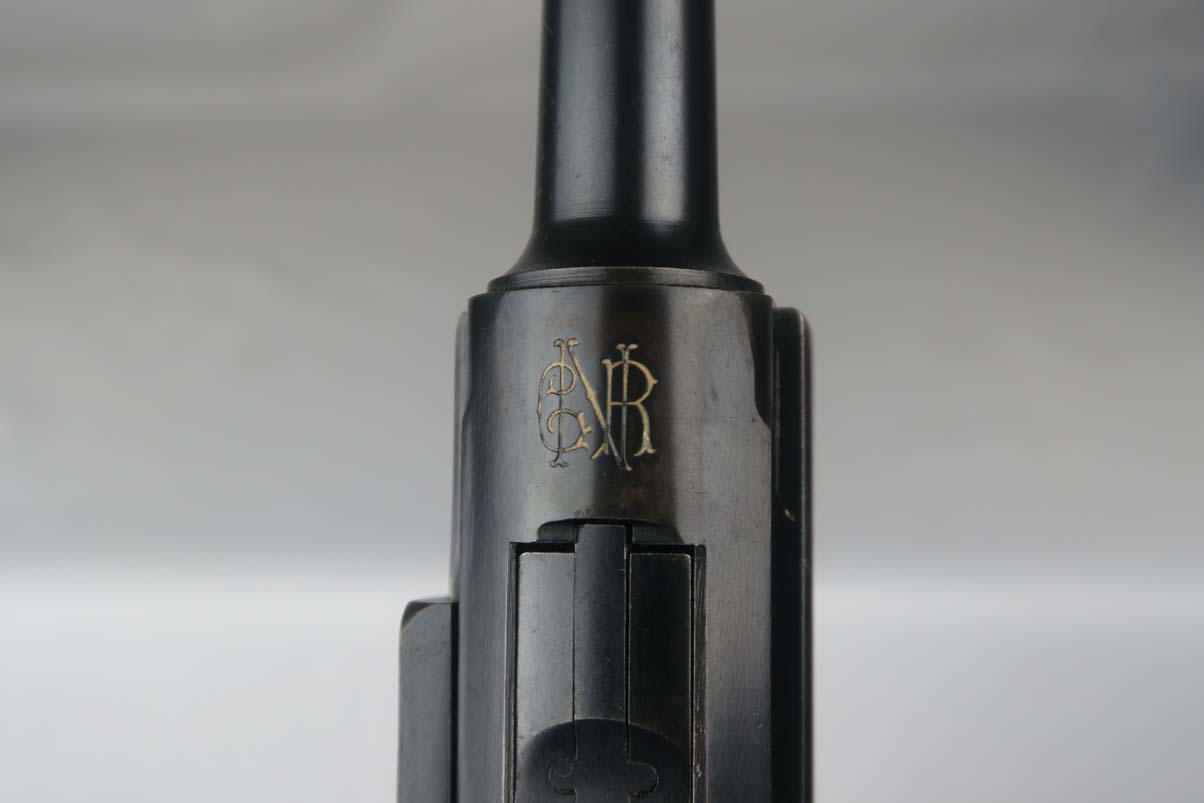 5/24/17 – This is a rare and complete rig for a GNR-marked (Guarda Nacional Republicana) 1935/06 Mauser Banner luger, made under contract for the Portuguese in 1935. This rig includes a cleaning rod, holster, loading tool and punch. These lugers were largely unheard of in the collector market for a long time, as only 564 were produced! The original finish rates at about 94-95%, with the largest spots of wear on the side plate and bottom of the front grip strap. There is also visible patina on the trigger guard and on top of the chamber. This is a commercial Banner marked with the Crown U (Oberndorf proof) and the thumb safety marked “SEGURANCA” note ‘safe up’ from the old style, and the extractor is marked “CARREGADA”. This is a well documented series of exactly 564 guns from 1921v through 2484v. This model has the 1906 old style frame with grip safety, no stock lug and fast taper barrel. These were made specifically for the Portuguese “Republican National Guard” consequently the top of the chamber area is marked “GNR” for Guarde, Nationale Republicanie. The holster bears a faint “AE” proof mark of the Portuguese Military, as well as a unit mark. The brass cleaning rod comes with an oiler for grease application to the moving parts. The holster also includes the early pin punch that is usually found in the 1906 presentation cases. The grips are numbered and matching to the pistol. Bore is frosted throughout but not pitted, and has clearly visible grooves. I’d rate it a 6 or 7.