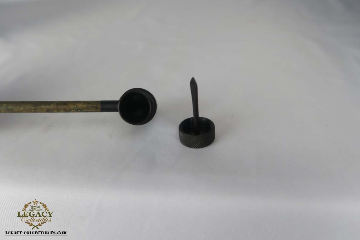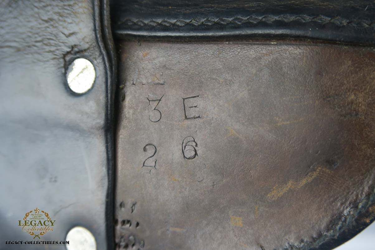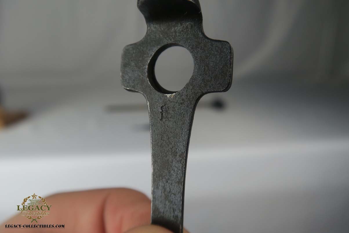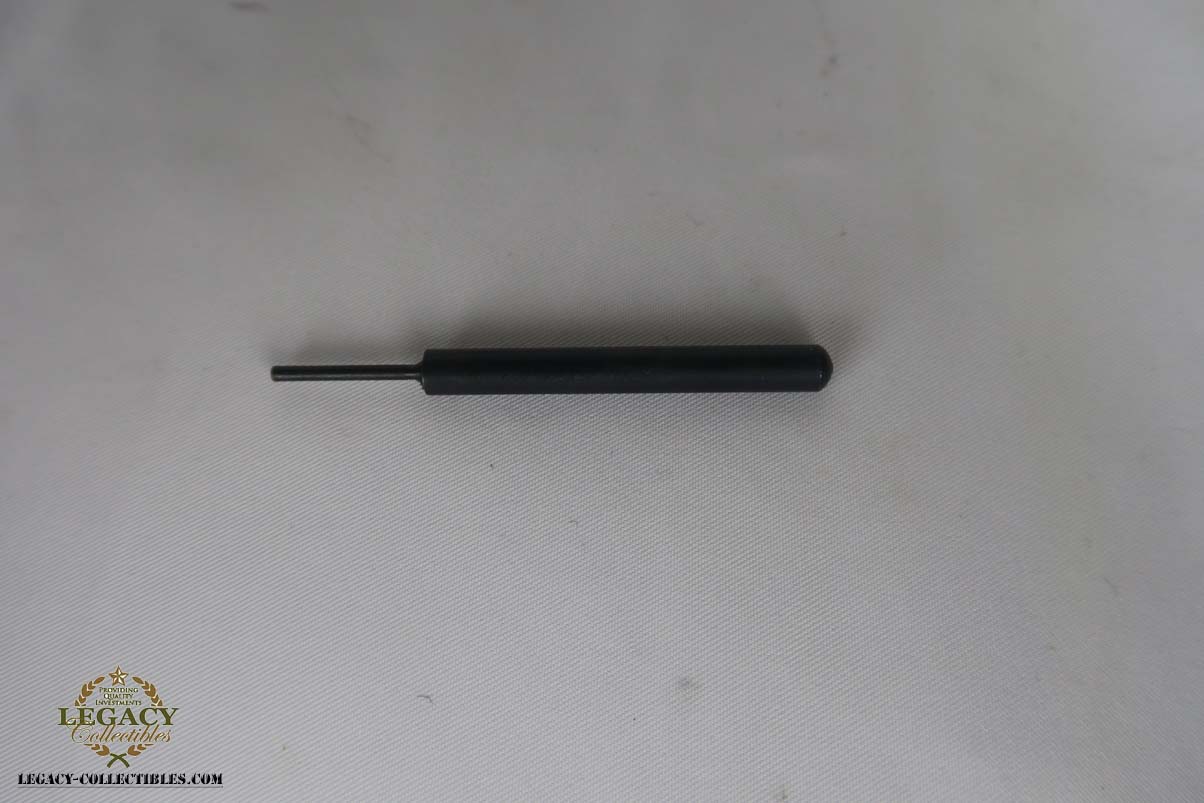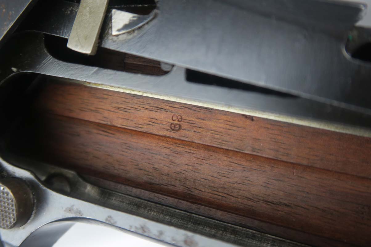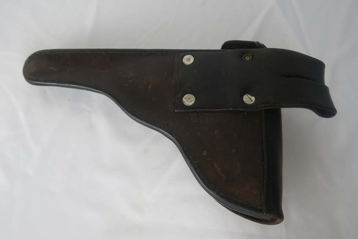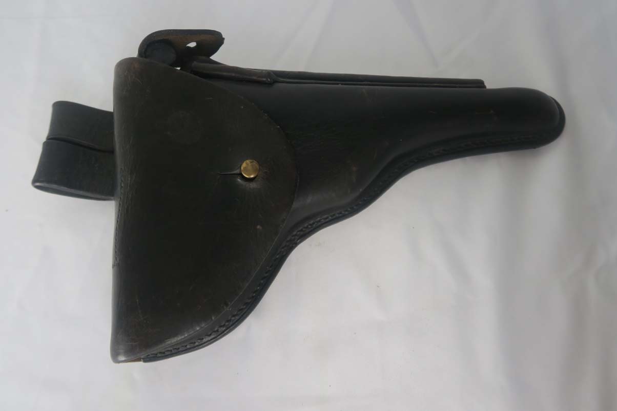 5/24/17 – This is a rare and complete rig for a GNR-marked (Guarda Nacional Republicana) 1935/06 Mauser Banner luger, made under contract for the Portuguese in 1935. This rig includes a cleaning rod, holster, loading tool and punch. These lugers were largely unheard of in the collector market for a long time, as only 564 were produced! The original finish rates at about 94-95%, with the largest spots of wear on the side plate and bottom of the front grip strap. There is also visible patina on the trigger guard and on top of the chamber. This is a commercial Banner marked with the Crown U (Oberndorf proof) and the thumb safety marked “SEGURANCA” note ‘safe up’ from the old style, and the extractor is marked “CARREGADA”. This is a well documented series of exactly 564 guns from 1921v through 2484v. This model has the 1906 old style frame with grip safety, no stock lug and fast taper barrel. These were made specifically for the Portuguese “Republican National Guard” consequently the top of the chamber area is marked “GNR” for Guarde, Nationale Republicanie. The holster bears a faint “AE” proof mark of the Portuguese Military, as well as a unit mark. The brass cleaning rod comes with an oiler for grease application to the moving parts. The holster also includes the early pin punch that is usually found in the 1906 presentation cases. The grips are numbered and matching to the pistol. Bore is frosted throughout but not pitted, and has clearly visible grooves. I’d rate it a 6 or 7.