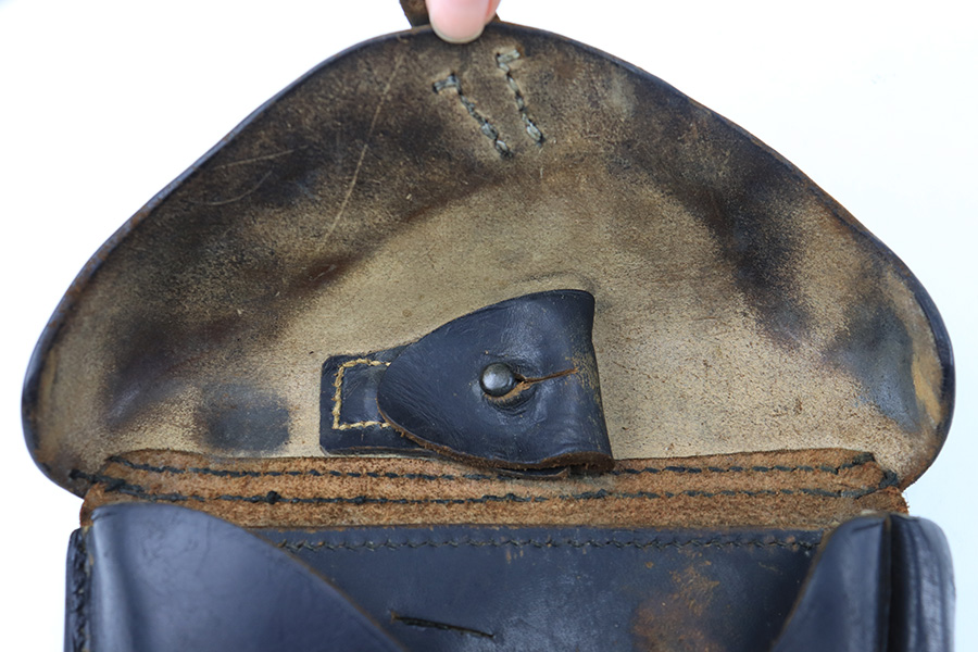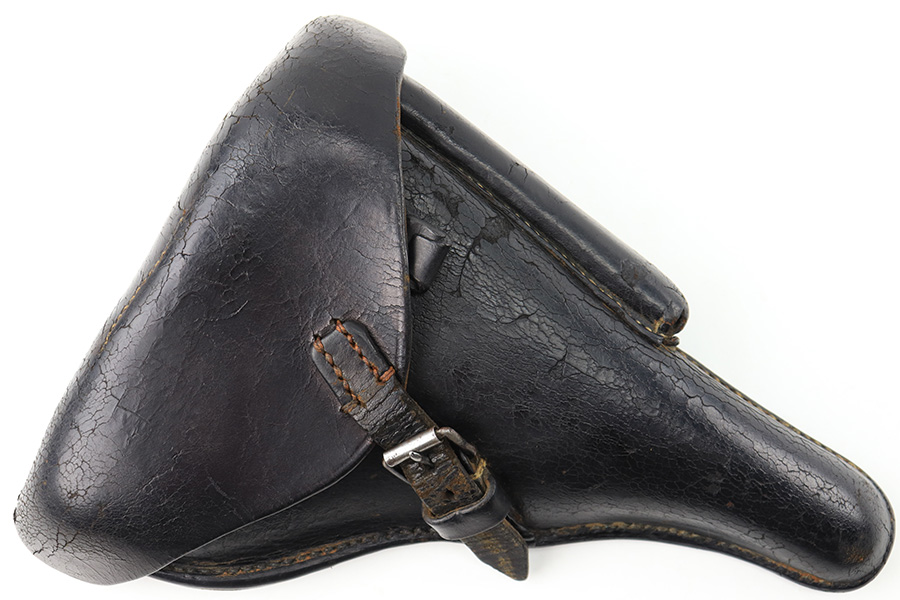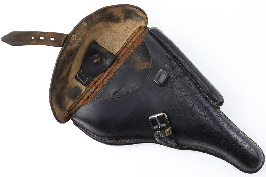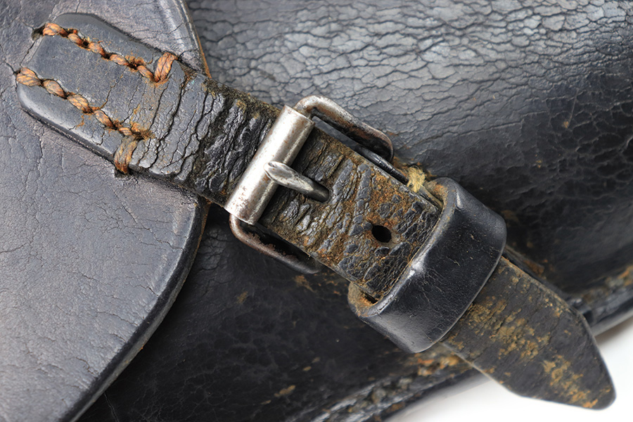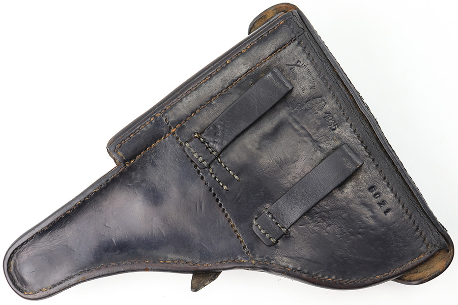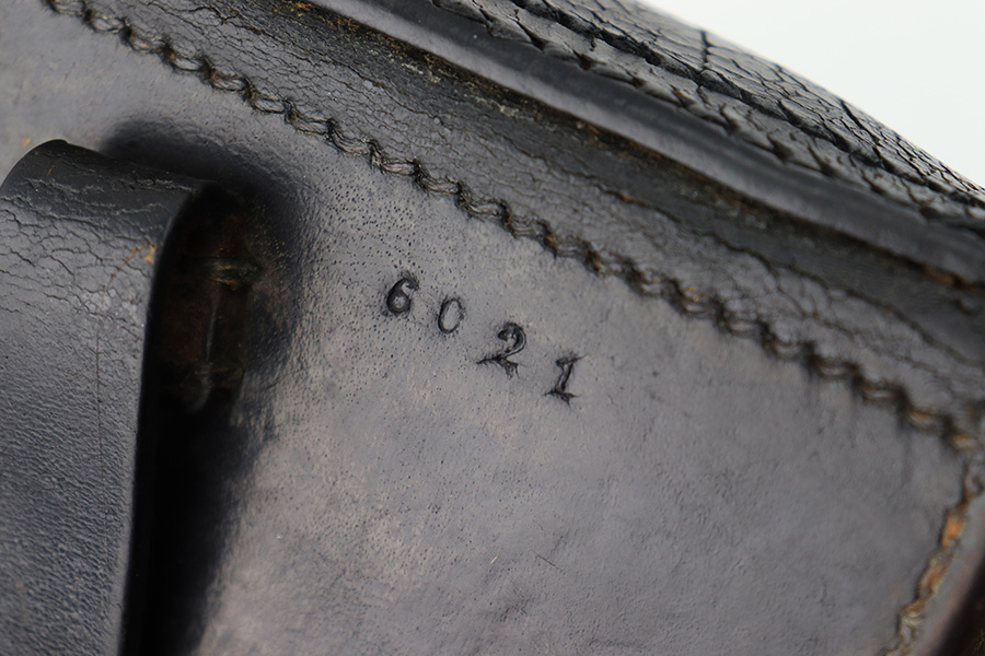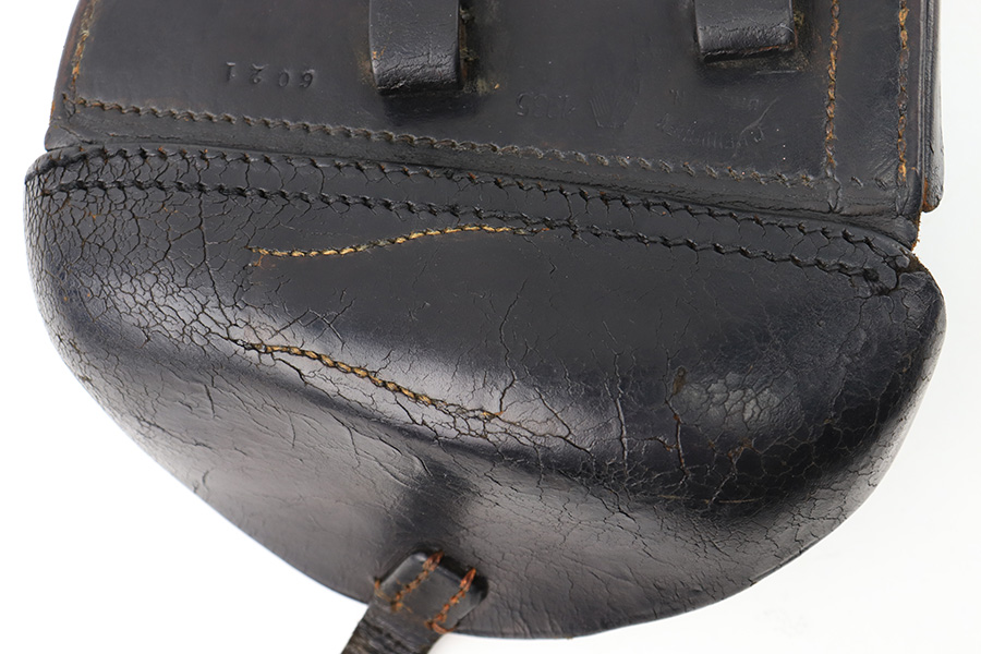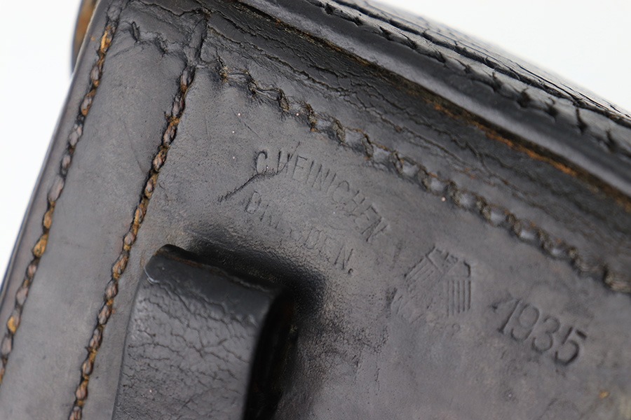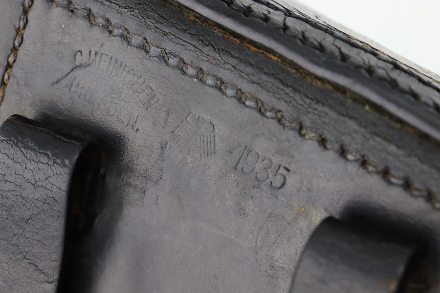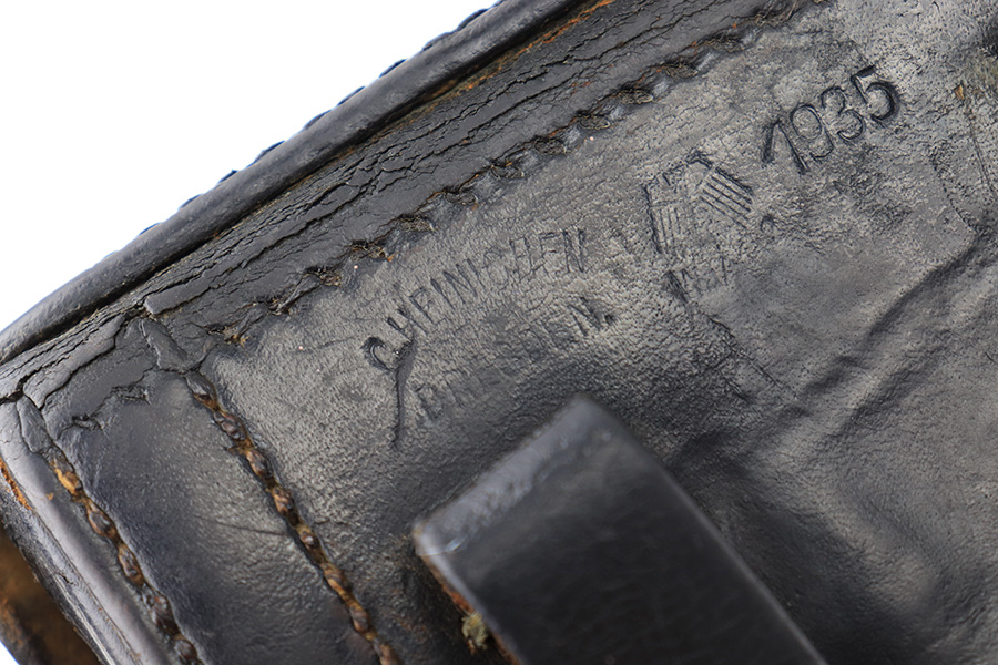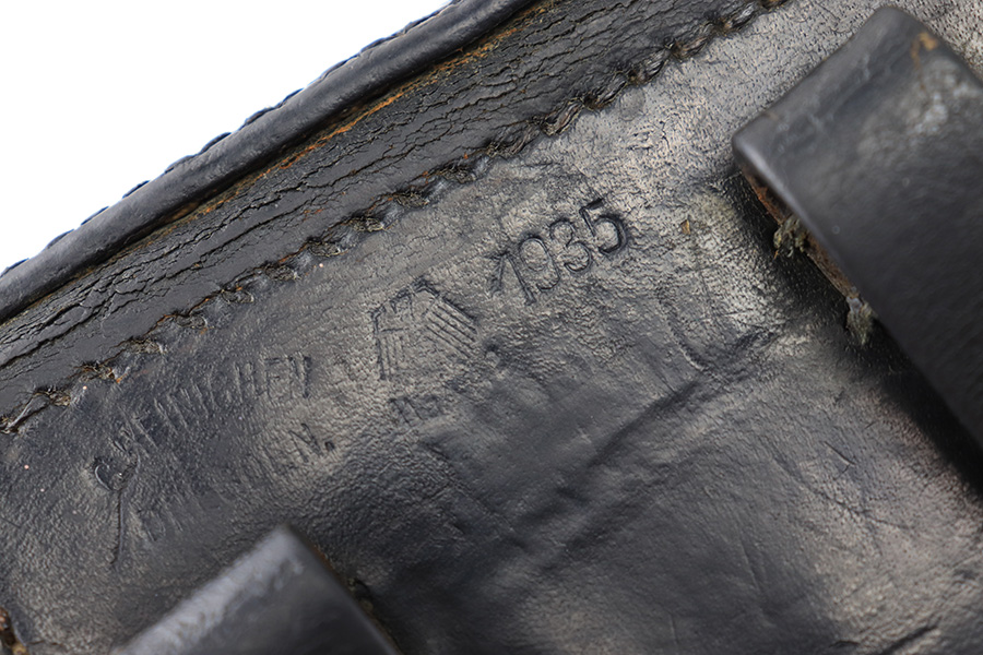 8/21/23 – This is an ultra-rare 1935 dated Luger holster. Also known as a “G Date” Luger holster, this is the hardest to find WW2 era production Luger holster. We speculate this is due to an excess of holsters made in 1934, but whatever the reason there are very few 1935 production Luger holsters in existence. This example is in very good overall condition with some surface wrinkling and light cracking throughout the front leather and closure strap. There’s also some scuffs near the toe of the holster, and the front lid has some initials scratched into the leather as well. The back leather and interior leather is fairly clean however, with no major issues and normal use wear. The stitching is in great condition, except for the bottom of each belt loop, where the stitching is replaced. The horizontal line of stitching underneath the belt loops also has some loose stitches, but this is mild and doesn’t affect functionality. Priced based on condition, and overall a very scarce holster from WW2.