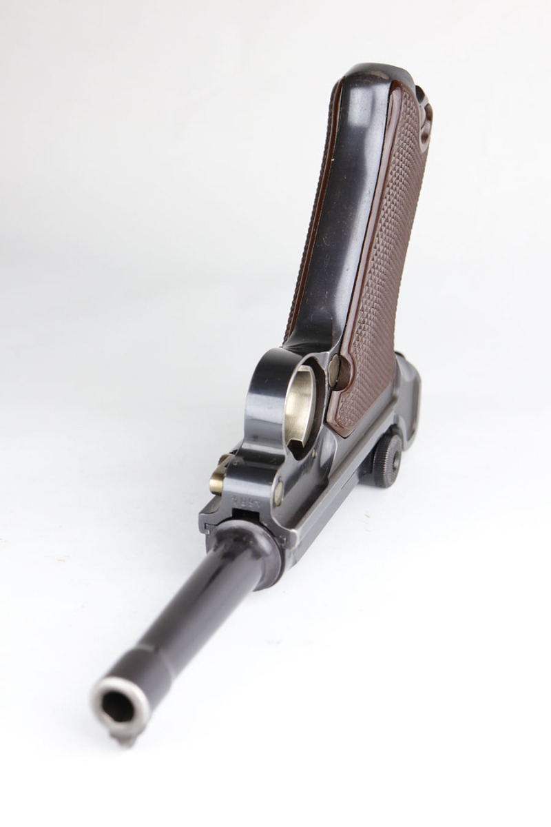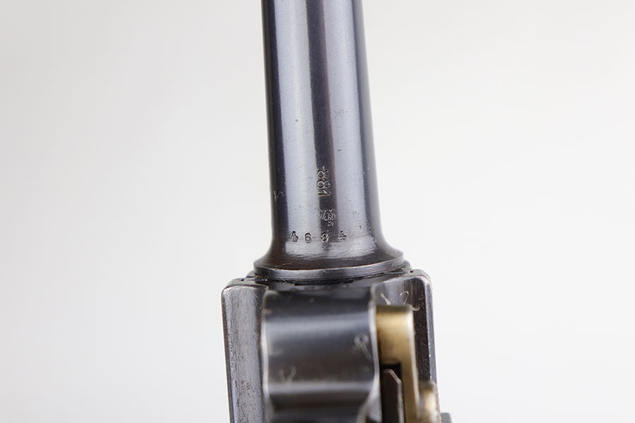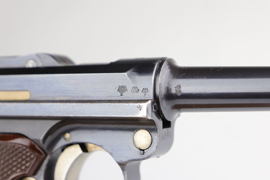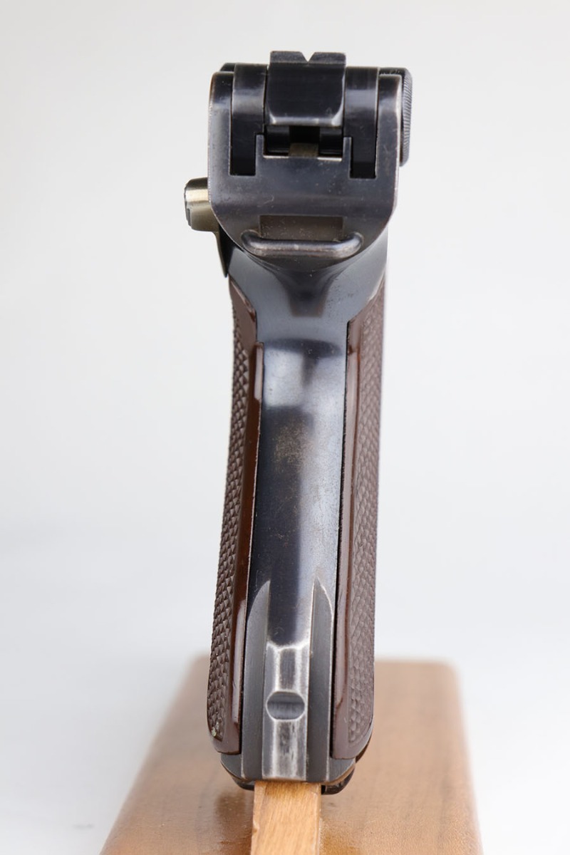 4/24/20 – From the esteemed collection of Bob Young, this is a rare and excellent 1936 Krieghoff Luger with original, matching magazine. These were Luftwaffe issued pistols and this is one of only 1,500 or so produced for this variation/date. The bluing is original and rates at about 95-96% with standard high edge wear, and some thinning on the straps. It has the correct Luftwaffe proof marks and all numbered parts are matching. Excellent bore with just a hint of frost. Proper red plastic grips.