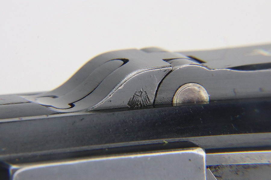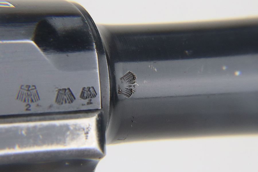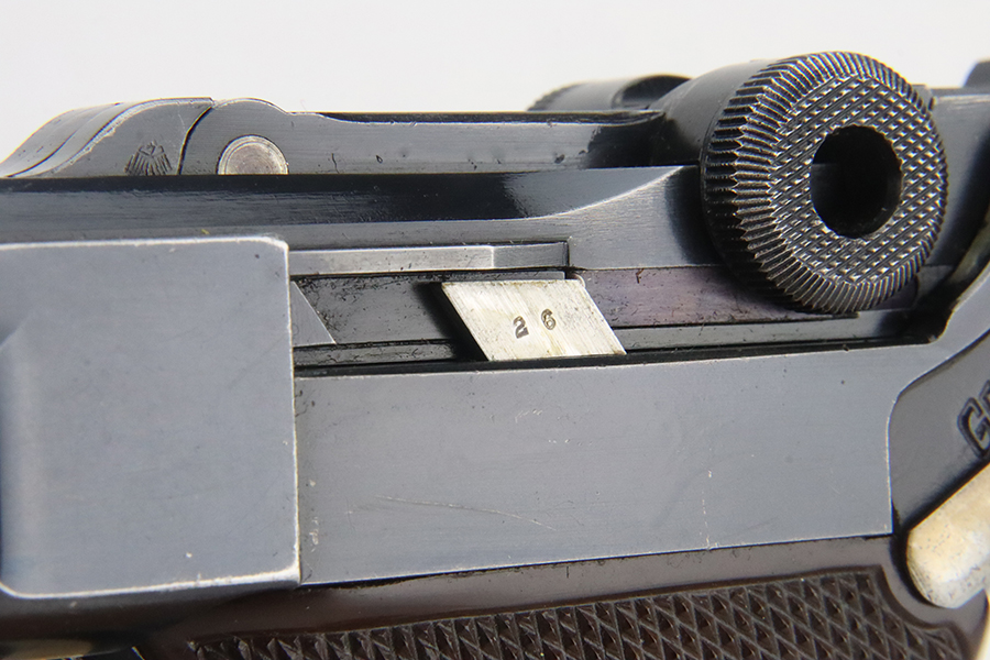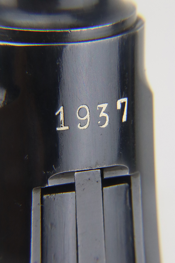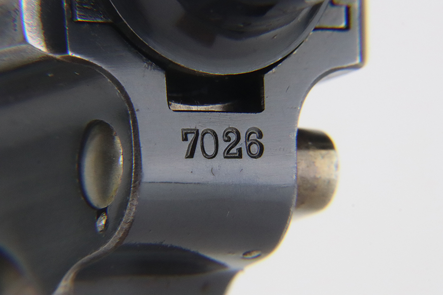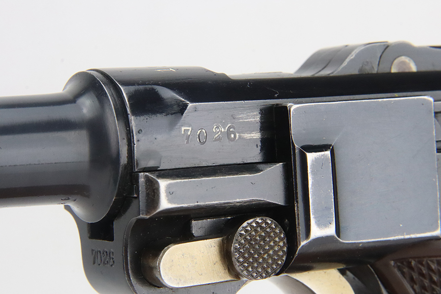 2/26/24 – This is a very nice example of an original Krieghoff Luger from 1937. There were only ~2,000 produced with 1937 chamber date. This one is all matching and comes with an original matching-numbered magazine (there is a factory overstamp of the ‘0’ in the number). The original finish rates about 92-93%. There is minor wear around the muzzle and on the high edges in general. Some small spots of oxidation on the grip straps. One light surface scratch on the left side of the frame. Fitted with period-correct reddish Krieghoff grips. Mint bore.