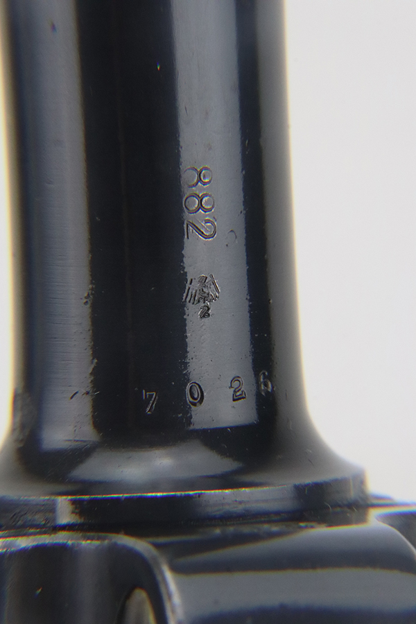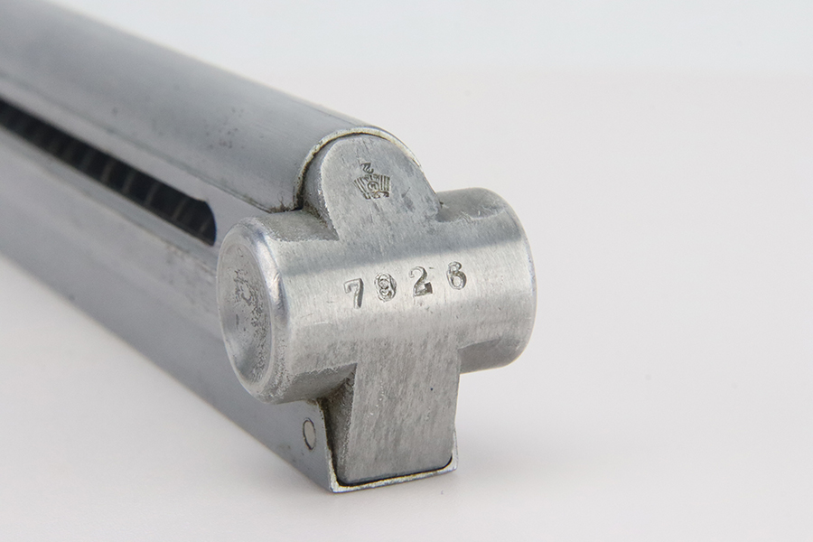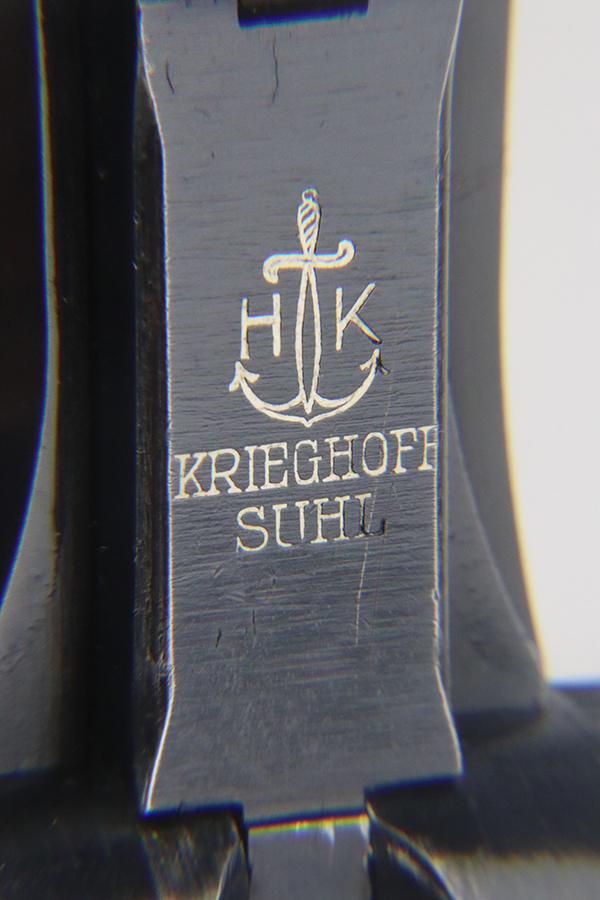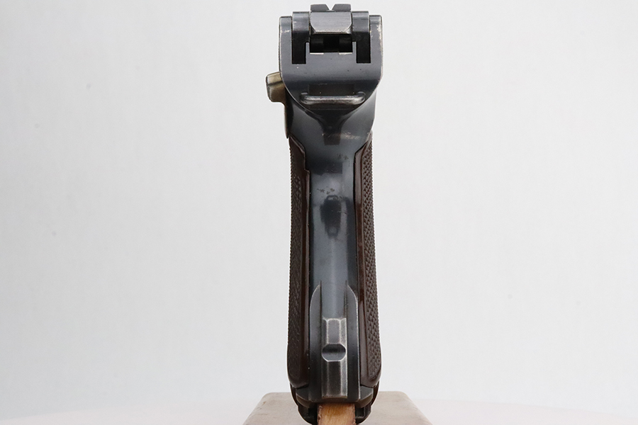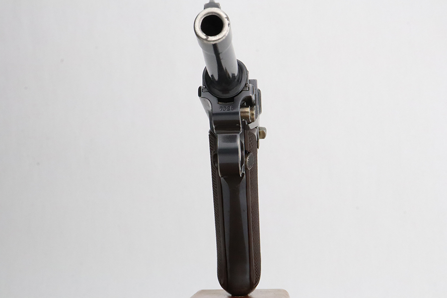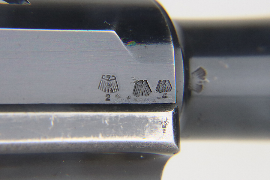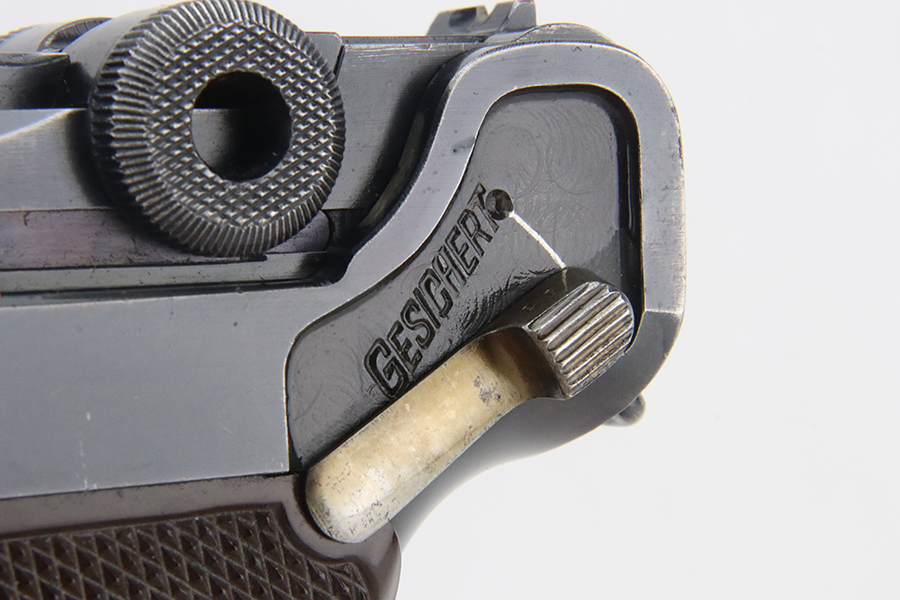2/26/24 – This is a very nice example of an original Krieghoff Luger from 1937. There were only ~2,000 produced with 1937 chamber date. This one is all matching and comes with an original matching-numbered magazine (there is a factory overstamp of the ‘0’ in the number). The original finish rates about 92-93%. There is minor wear around the muzzle and on the high edges in general. Some small spots of oxidation on the grip straps. One light surface scratch on the left side of the frame. Fitted with period-correct reddish Krieghoff grips. Mint bore.