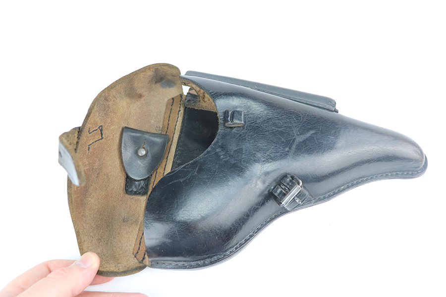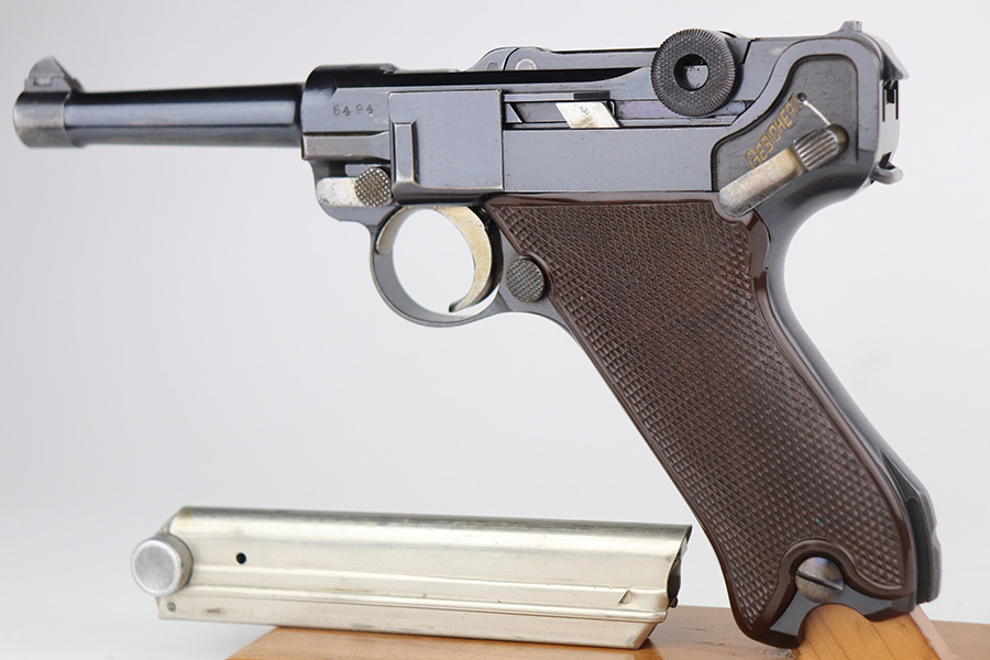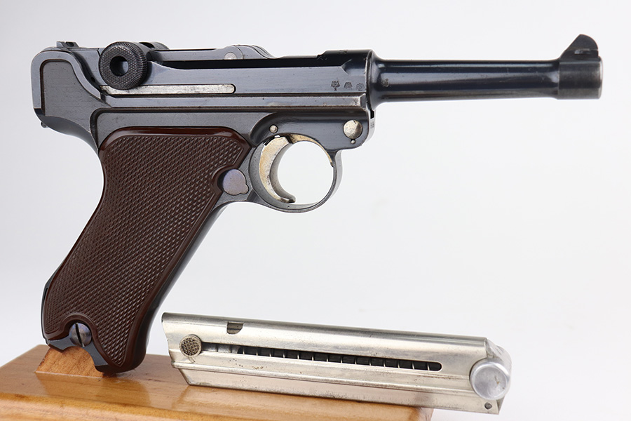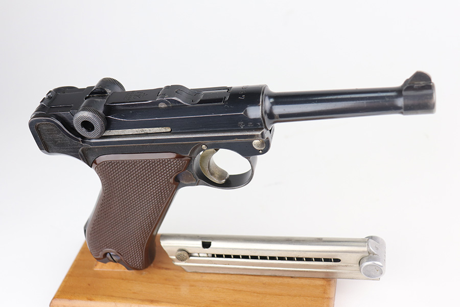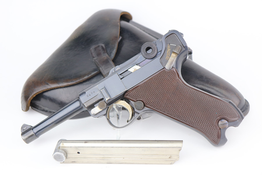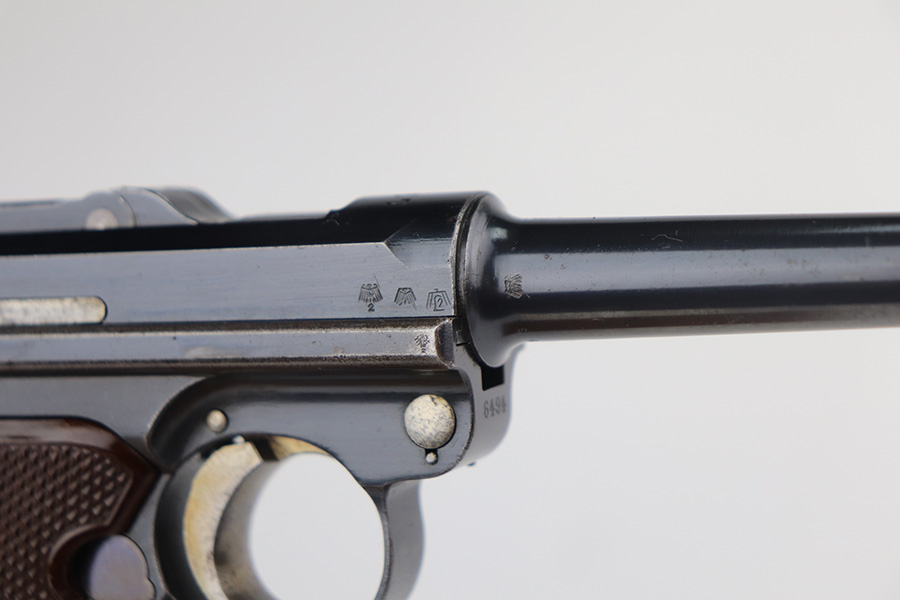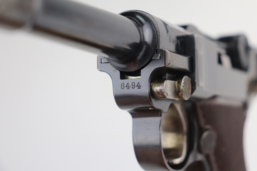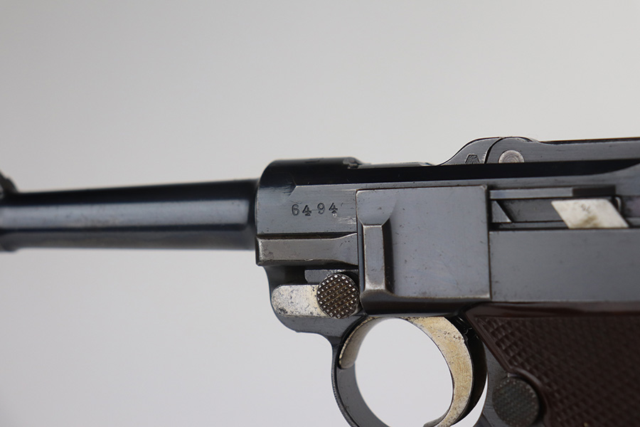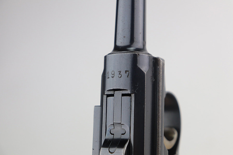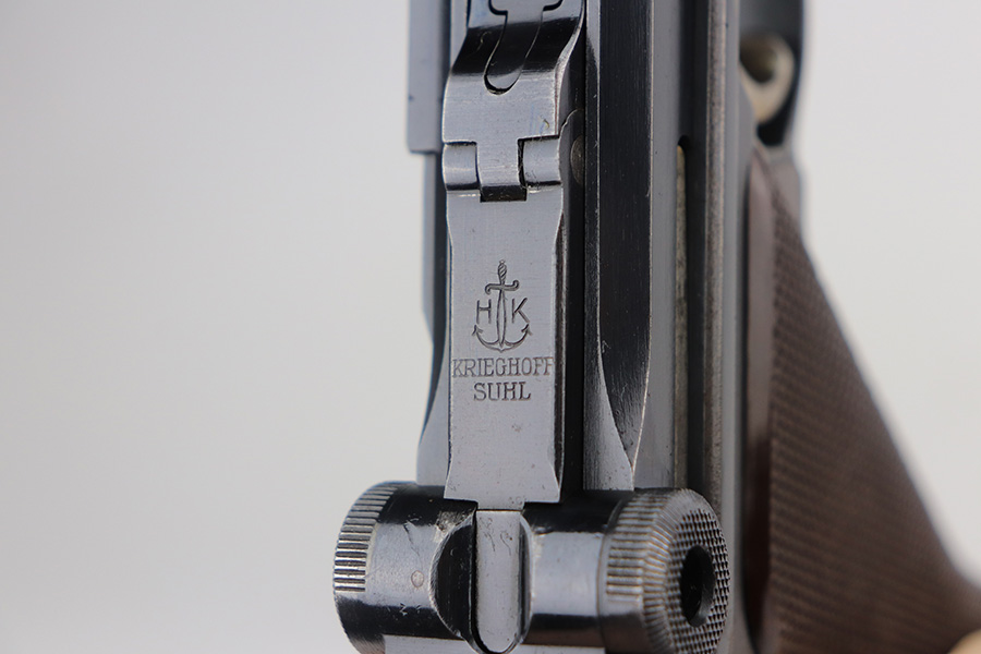 6/22/21 – This is a rare and highly desirable 1937 Krieghoff Luger with holster and original, matching magazine. One of only ~2000 produced with 1937 chamber date. Gorgeous gun with 94-95% of the original blue remaining. Most of the finish loss is on the right side rail and left side of barrel. Shiny bore with minor hint of frost. Original Krieghoff grips. Excellent straw on small parts. Holster is in great shape and has Krieghoff Eagle/2 proof inside.