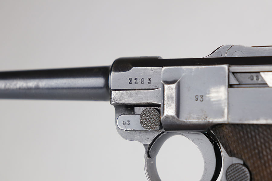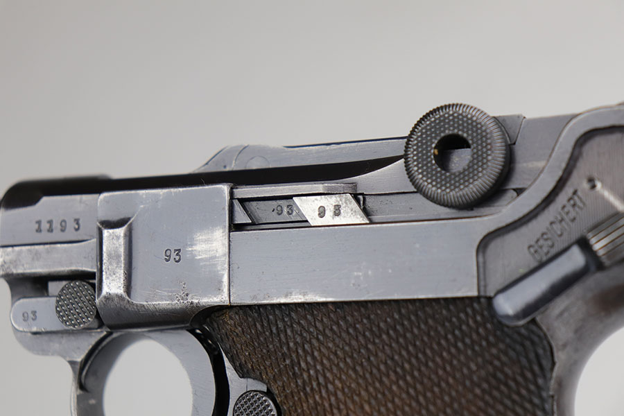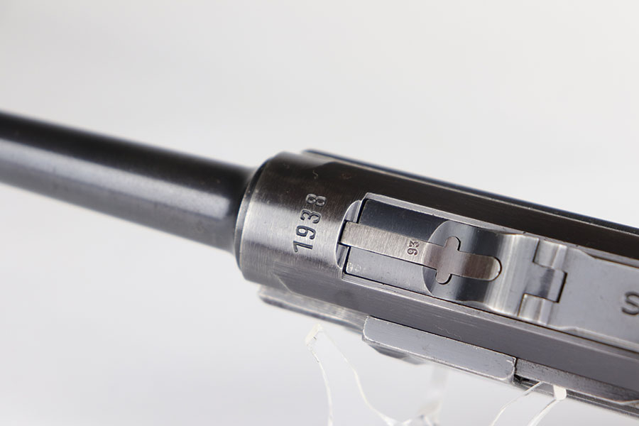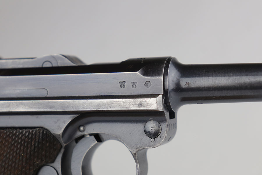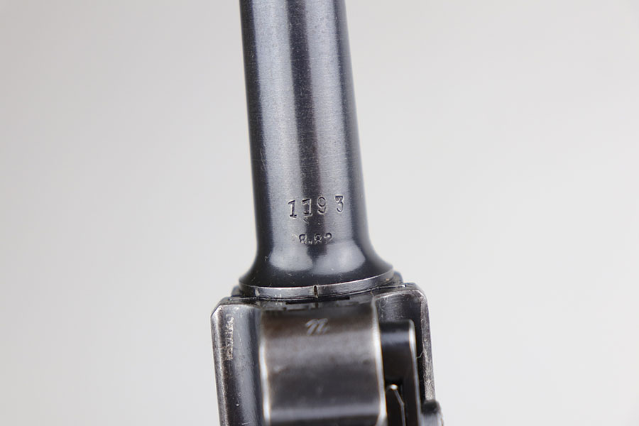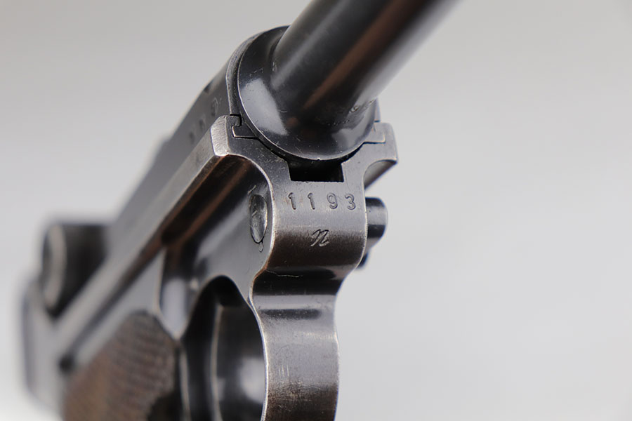 6/26/20 – This is a very nice example of a scarce Kriegsmarine Mauser Luger rig, which includes Navy marked holster and a Weimar eagle marked tool. There were only 2,400 Navy Mauser Lugers produced in 1938, and there were only about 6,000 Kriegsmarine Mauser Lugers ever marked as such. The pistol is all matching numbers, including the right grip panel but the left is not numbere. The pistol shows notable thinning on the straps and the edges of the profile. There’s also several areas of surface freckling. The holster is 1939 dated with the rare Kriegsmarine Eagle/M marking. It’s in excellent condition and has no notable defects. The rig includes a tool with Weimar era eagle marking. Bore is shiny with good rifling but does have some freckling throughout.