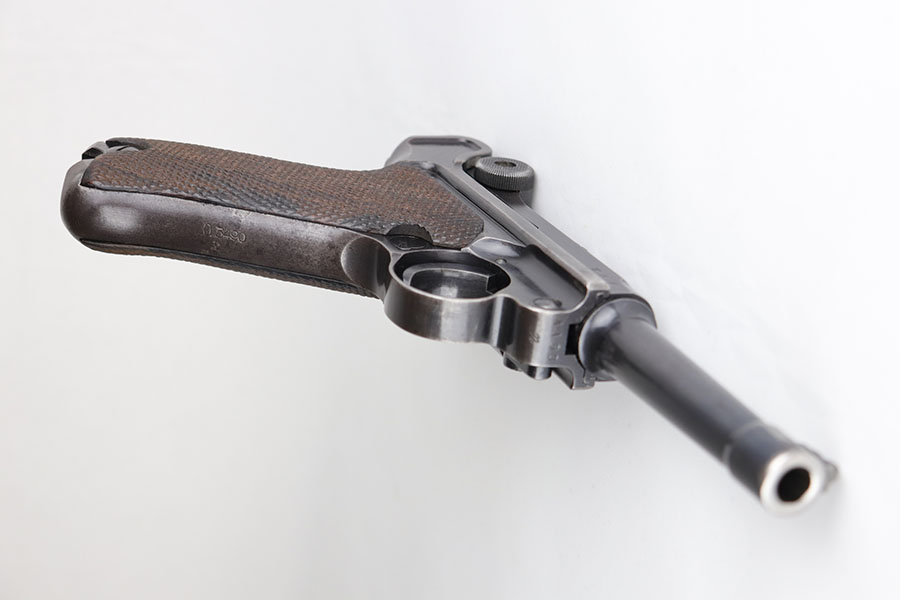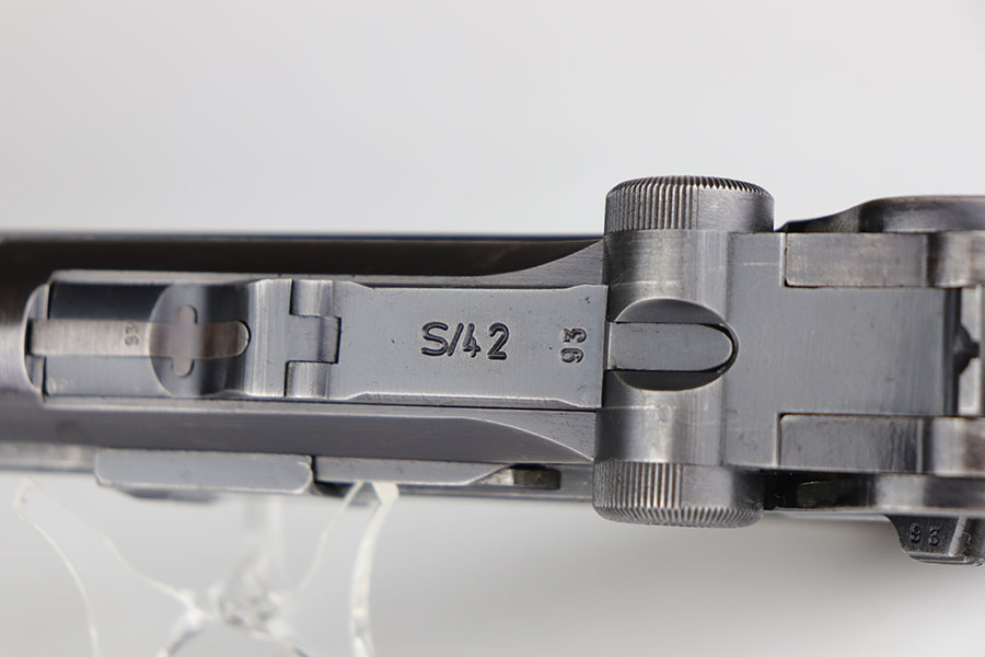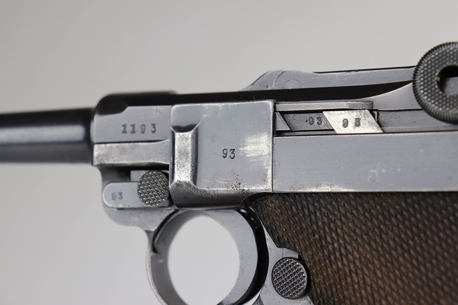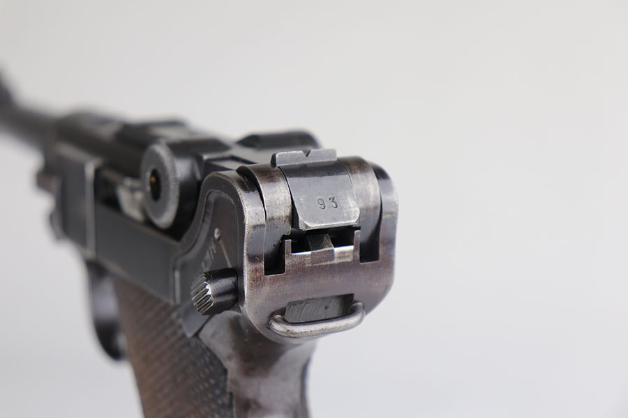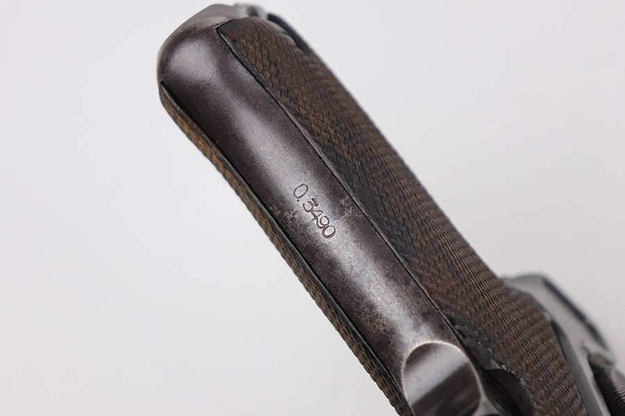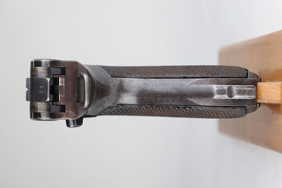 6/26/20 – This is a very nice example of a scarce Kriegsmarine Mauser Luger rig, which includes Navy marked holster and a Weimar eagle marked tool. There were only 2,400 Navy Mauser Lugers produced in 1938, and there were only about 6,000 Kriegsmarine Mauser Lugers ever marked as such. The pistol is all matching numbers, including the right grip panel but the left is not numbere. The pistol shows notable thinning on the straps and the edges of the profile. There’s also several areas of surface freckling. The holster is 1939 dated with the rare Kriegsmarine Eagle/M marking. It’s in excellent condition and has no notable defects. The rig includes a tool with Weimar era eagle marking. Bore is shiny with good rifling but does have some freckling throughout.