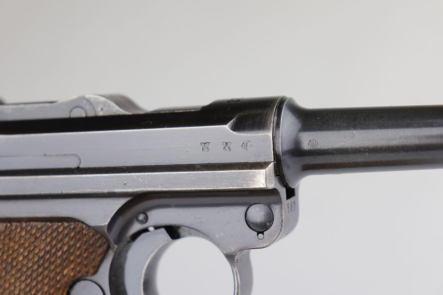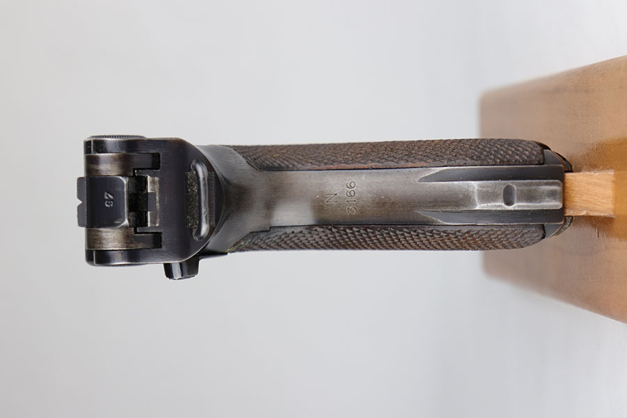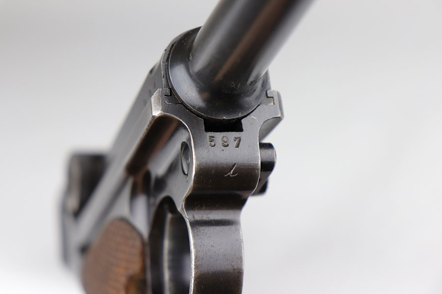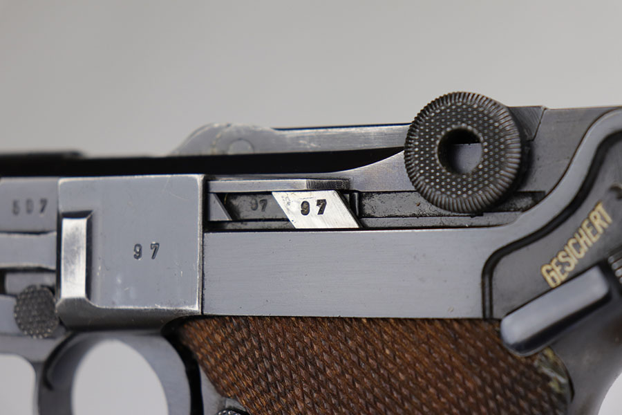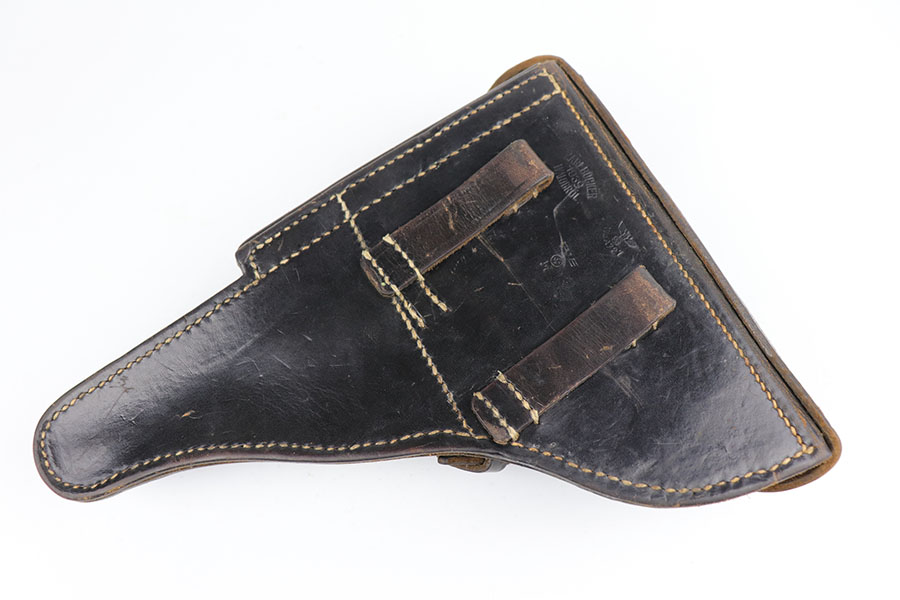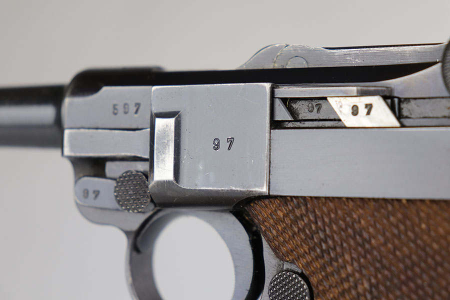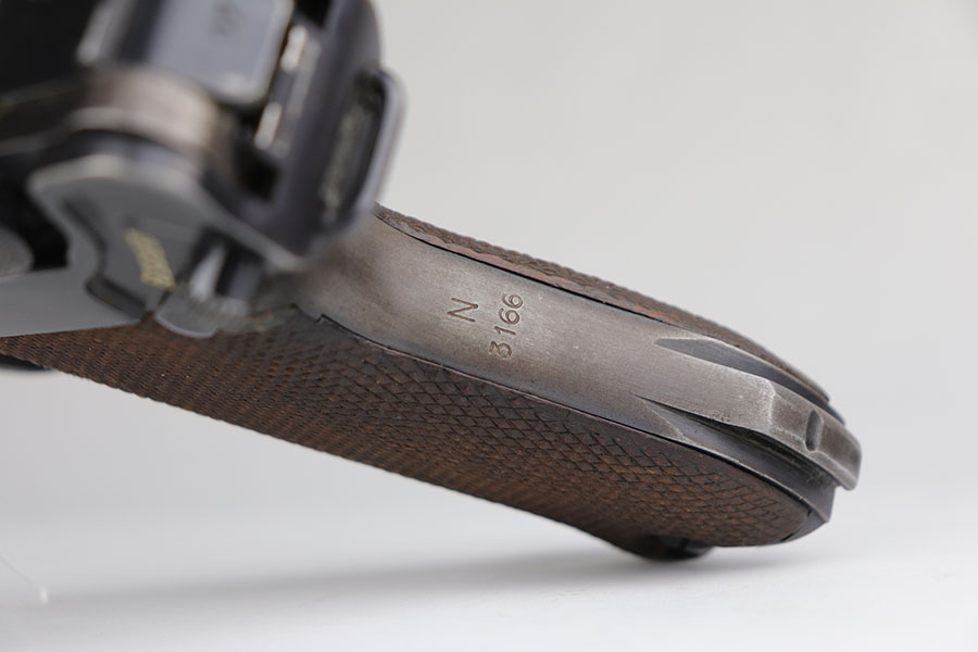 6/17/20 – This is a very nice example of a scarce and complete Kriegsmarine Mauser Luger rig, which includes Navy marked holster and one of the original, matching magazines. There were only 2,400 Navy Mauser Lugers produced in 1938, and there were only about 6,000 Kriegsmarine Mauser Lugers ever marked as such. The pistol is all matching numbers, including the grips. The magazine matches with both factory serial and Nortsee property number. It’s only one digit off from a recorded serial in Axis Pistols/Third Reich Lugers. The profile view is excellent with standard high edge wear but there is notable dulling of the color on the straps. Strong, shiny bore. The holster is 1939 dated with the rare Kriegsmarine Eagle/M marking. It’s in excellent condition aside from a scrape along the top flap. Rig also includes a spare Navy magazine that is mismatched but rare nonetheless.