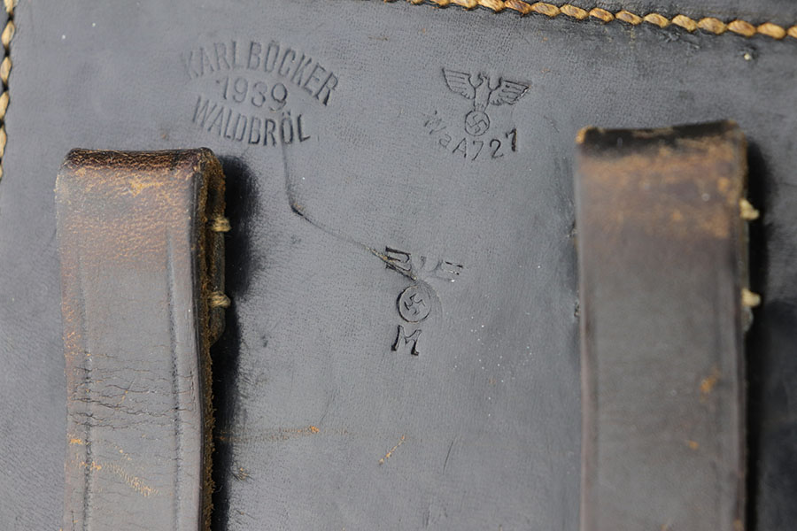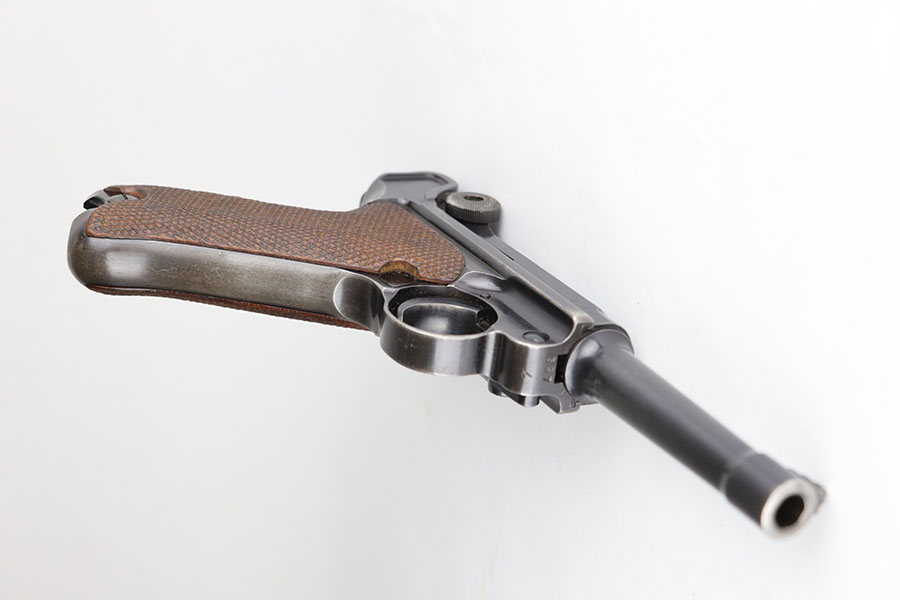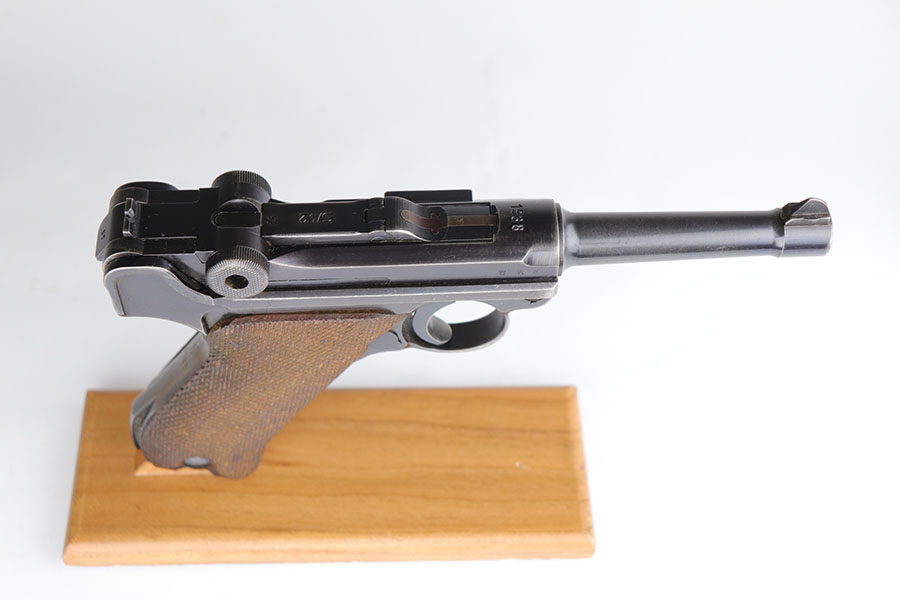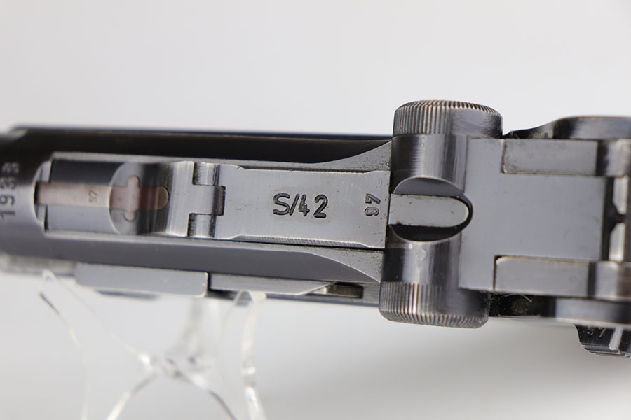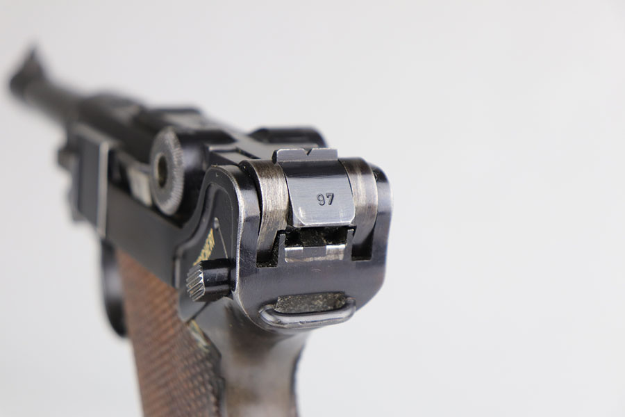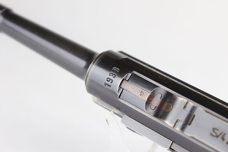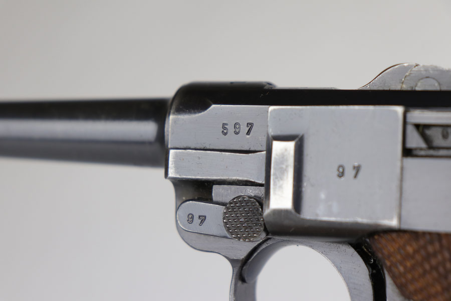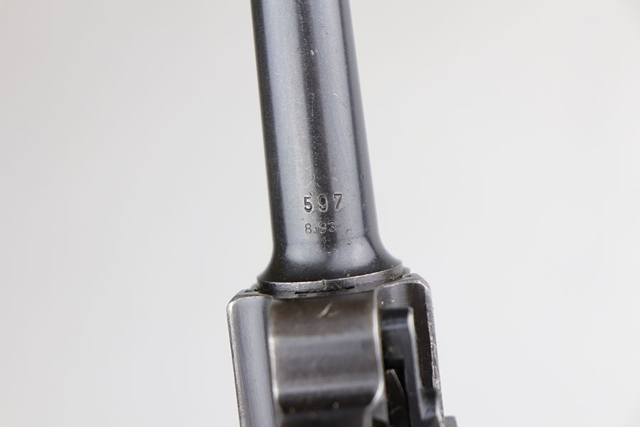 6/17/20 – This is a very nice example of a scarce and complete Kriegsmarine Mauser Luger rig, which includes Navy marked holster and one of the original, matching magazines. There were only 2,400 Navy Mauser Lugers produced in 1938, and there were only about 6,000 Kriegsmarine Mauser Lugers ever marked as such. The pistol is all matching numbers, including the grips. The magazine matches with both factory serial and Nortsee property number. It’s only one digit off from a recorded serial in Axis Pistols/Third Reich Lugers. The profile view is excellent with standard high edge wear but there is notable dulling of the color on the straps. Strong, shiny bore. The holster is 1939 dated with the rare Kriegsmarine Eagle/M marking. It’s in excellent condition aside from a scrape along the top flap. Rig also includes a spare Navy magazine that is mismatched but rare nonetheless.