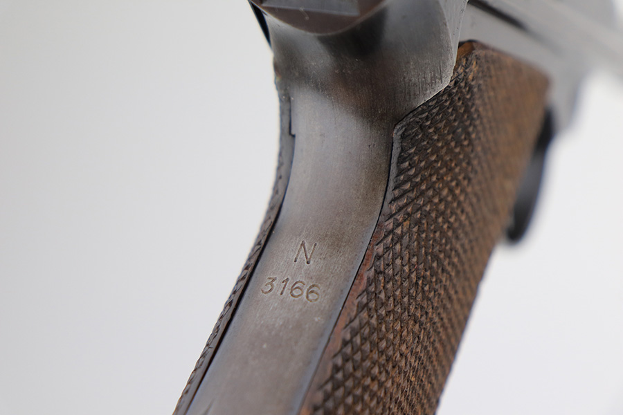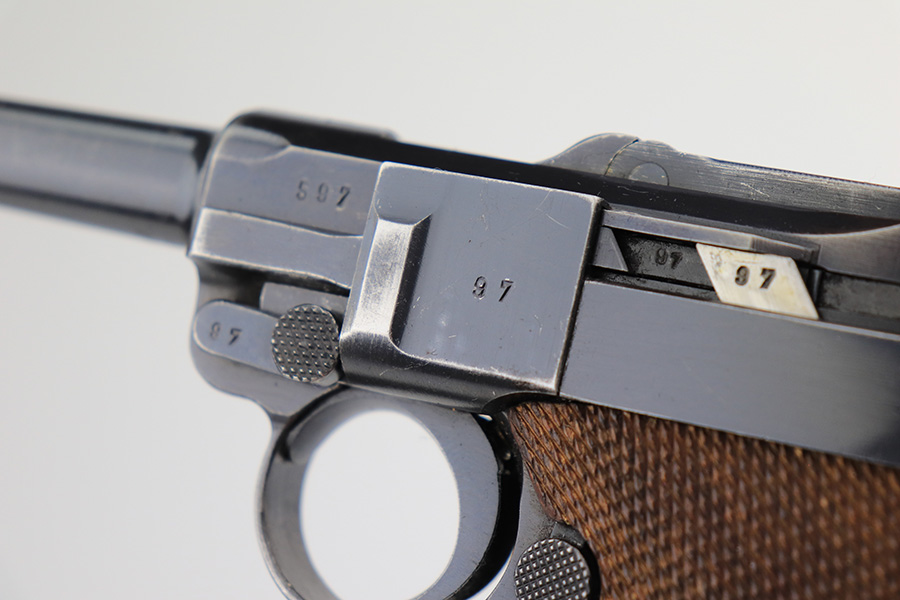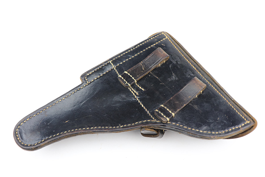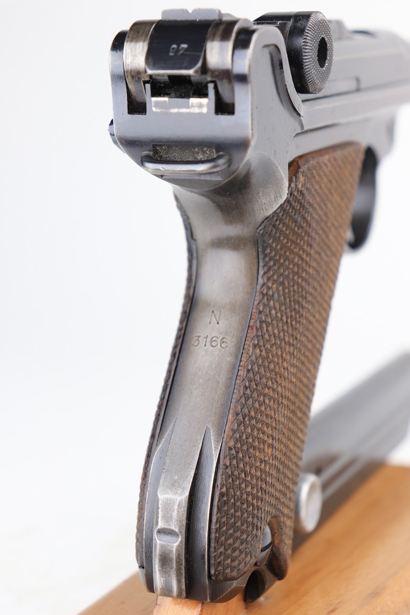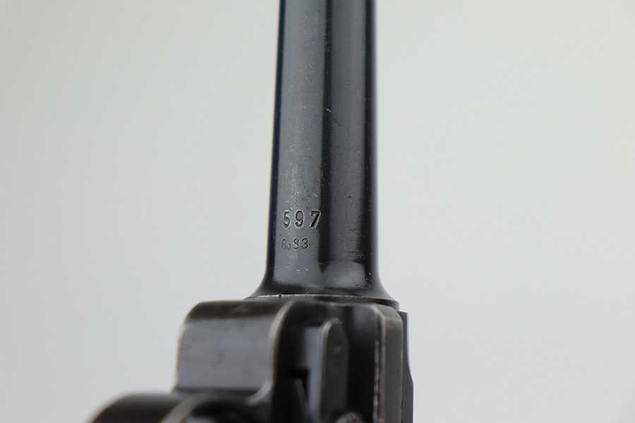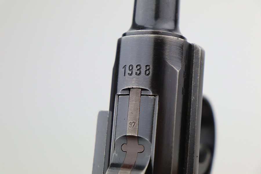3/15/22 – This is a rare and complete Navy Mauser Luger rig from 1938 with one of the original, matching magazines. One of only ~6,000 produced in total with property mark on frame, and one of only 2,400 with 1938 chamber date. The pistol is all matching and original, with maybe 85-90% of the original blue remaining. There’s standard high edge wear from the holster, but this one is difficult to rate as the grip straps just show some general dulling. Comes with the original matching grips and one of the matching magazines. The listing also includes a spare, original Navy-marked magazine. The pistol’s bore has strong rifling with a little frost throughout. The rig is completed by a rare Kriegsmarine holster with sharp Navy eagle marking and 1939 date.
