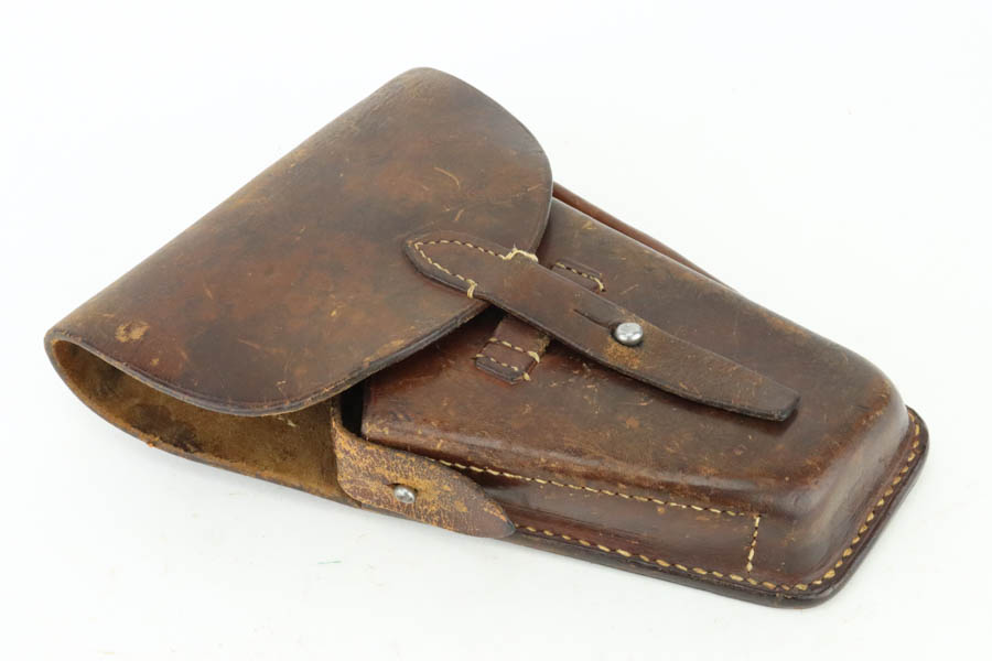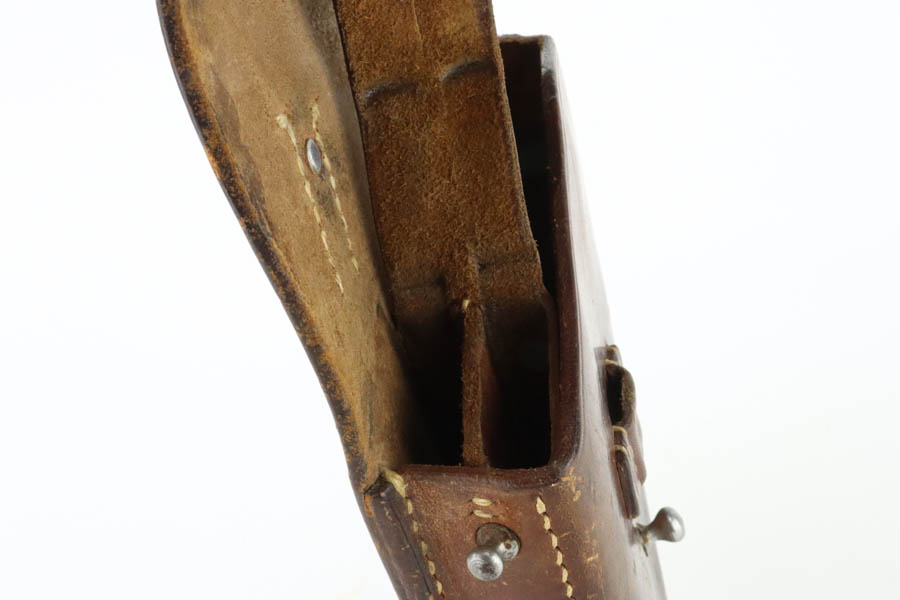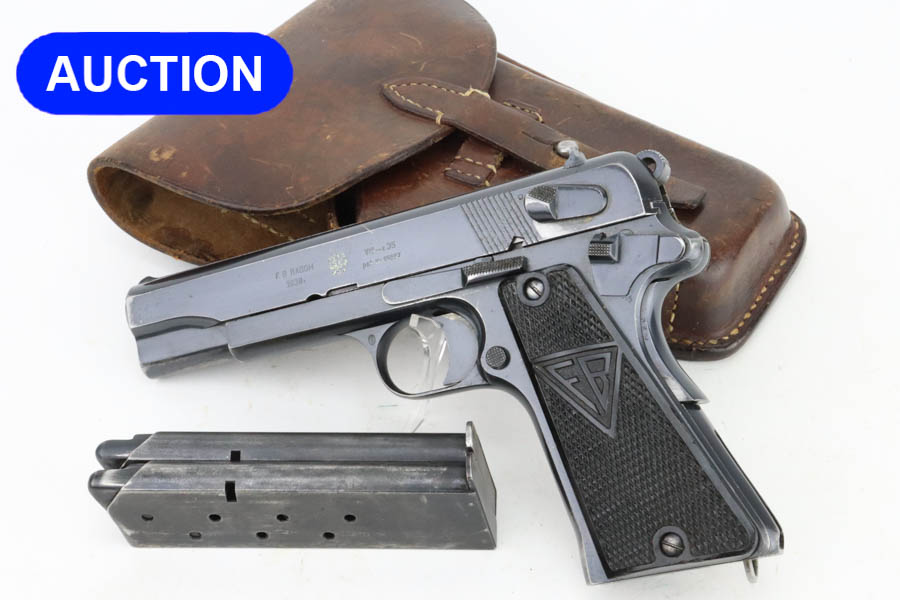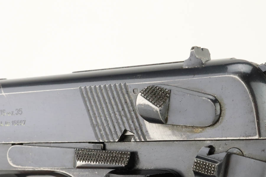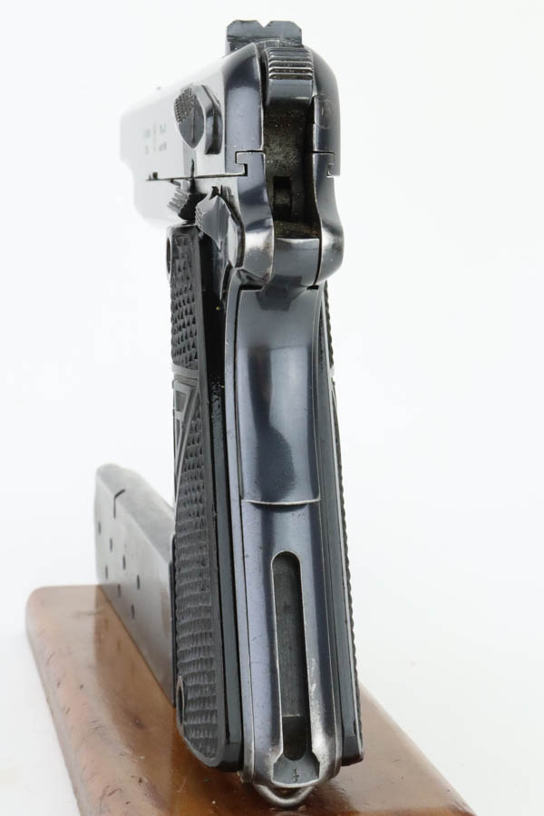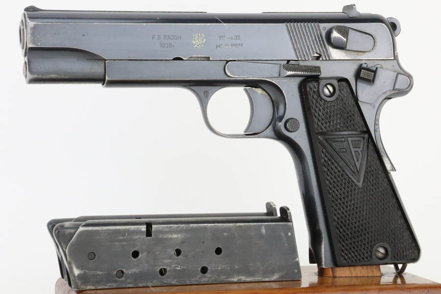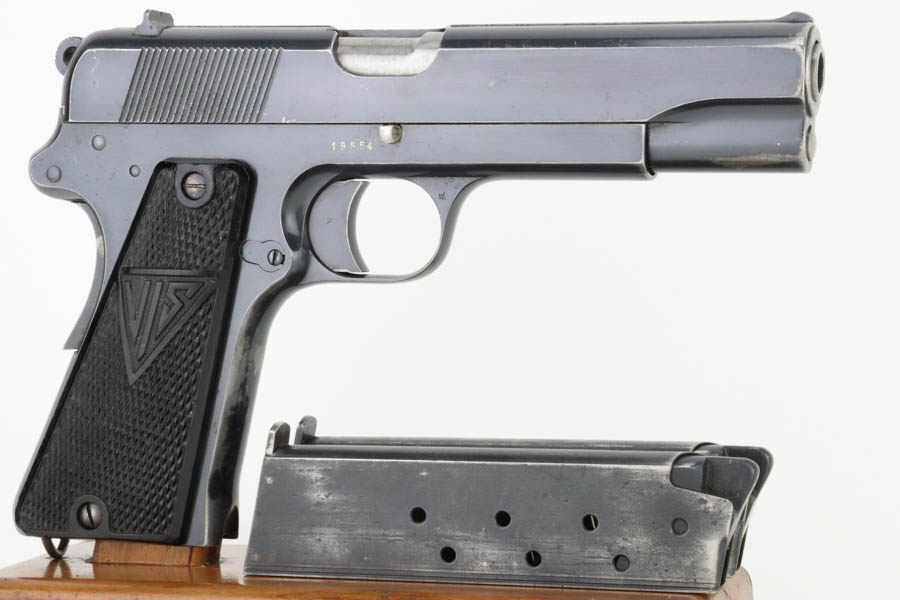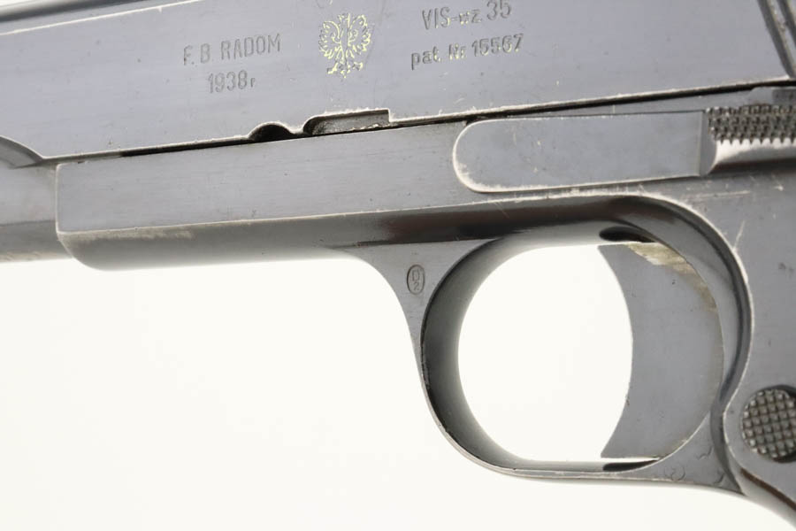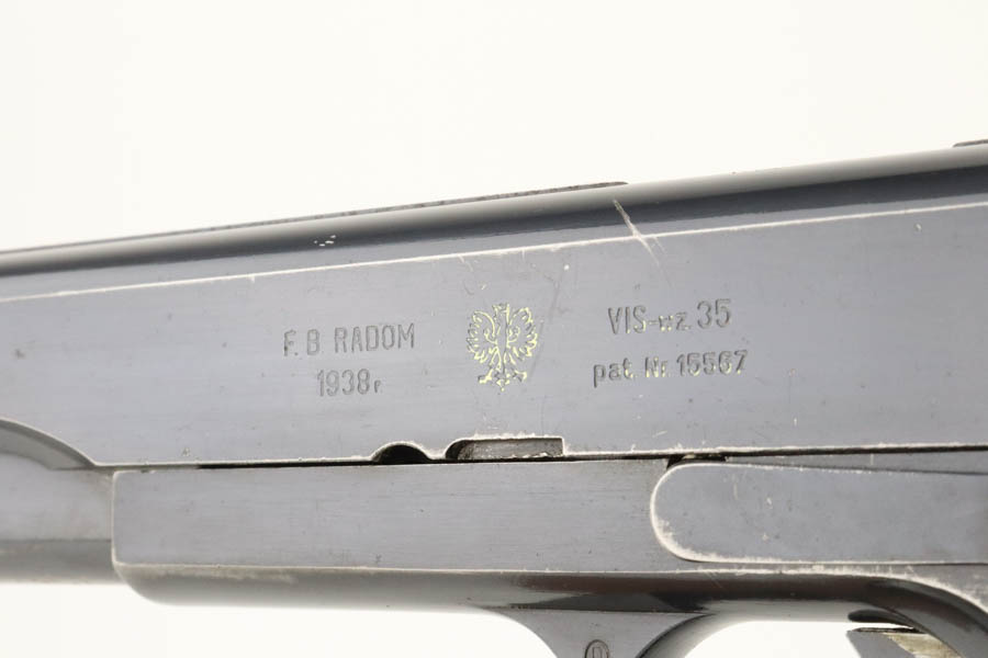 This is a very nice example of a rare Polish Eagle Radom VIS P.35 that was produced in 1938. Comes from the personal collection of Tom Whiteman. We can provide a COA upon request. These are some of the highest quality guns manufactured during the Nazi-era in Europe – this one is no different. It’s all matching and original with about 92% of the lustrous high polish blue remaining. The majority of the wear is on the front strap, so the profile views are excellent. There is also some minor muzzle wear and a few light scratches on the slide. Minty bore. Fitted with period-correct black bakelite grips. It comes as a complete rig with a rare Polish Eagle Radom holster (faint ink stamp on the inside) and two correct “G2” proofed magazines.