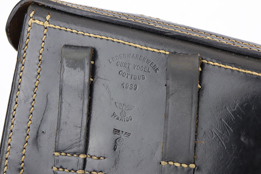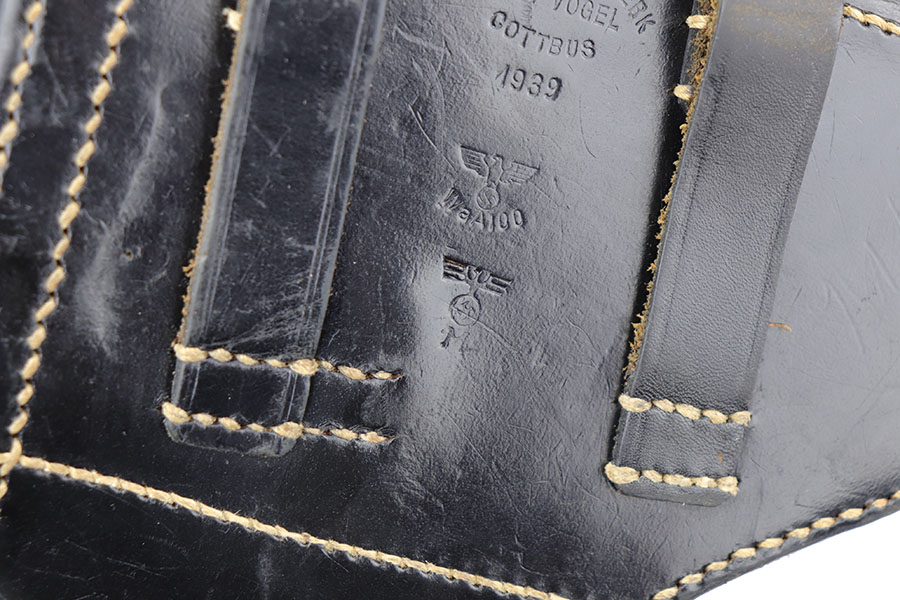 8/21/19 – This is an original 1939 dated Kriegsmarine (navy) Luger holster. These holsters are very hard to find, especially in this condition. The back of the holster is waffen WaA100 proofed, maker stamped, and dated. Most importantly, there’s an eagle/M under the waffen eagle proof stamp, which indicates Kriegsmarine issue. The black leather is excellent overall, with some light wear and normal aging as well as typical pliability. The interior leather is clean, and shows signs of having held a luger previously. The stitching is all tight and in tact as well. All original and correct.