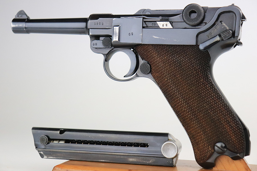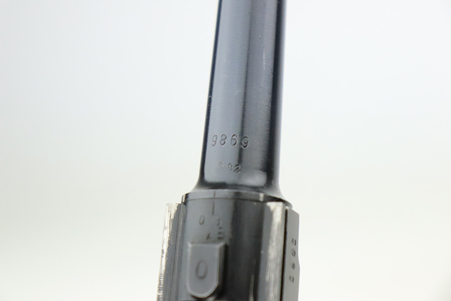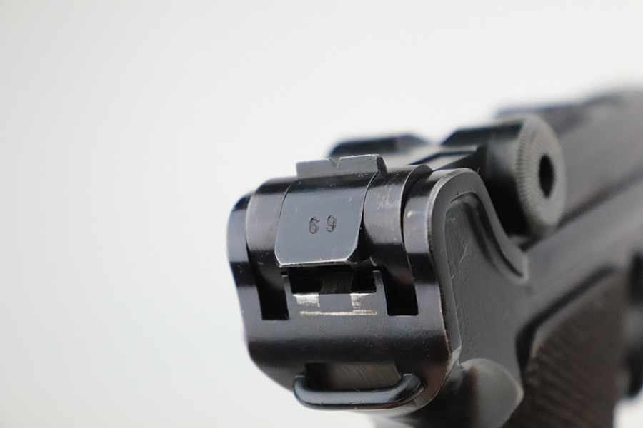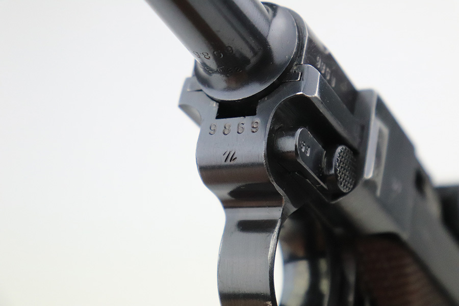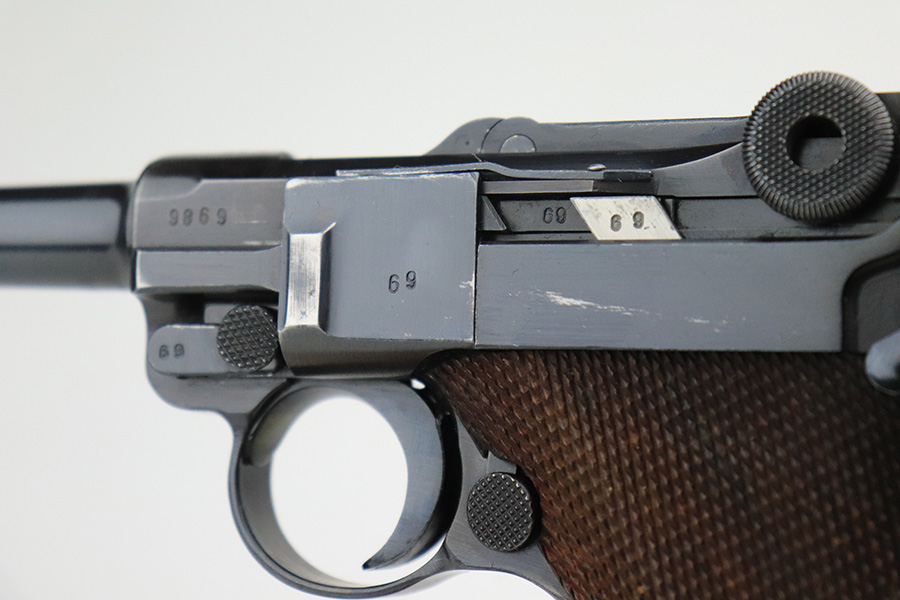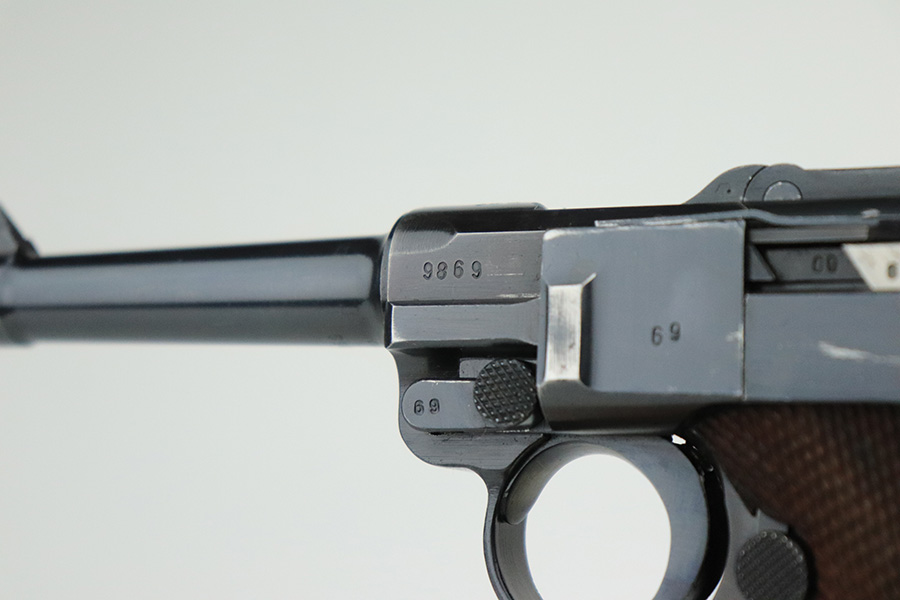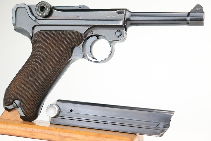 6/14/22 – This is an excellent example of a rare Nazi Mauser Luger variation that was military issued and accepted but diverted to the police. There are only about 3,000 such examples ever made, and this one is 1939 dated with S/42 code on toggle. It features a police sear safety and is in the proper serial range for known examples. This one comes with one original matching-numbered magazine and has retained about 95-96% of its original bluing. There is very minor wear on the side plate, on the front edges of the side rails, and around the muzzle. One light streak of wear on the left side of the frame. Very minor thinning on both grip straps a few tiny scratches on the front strap. Comes with minty matching-numbered wood grips. The bore is near-mint.