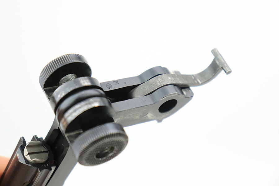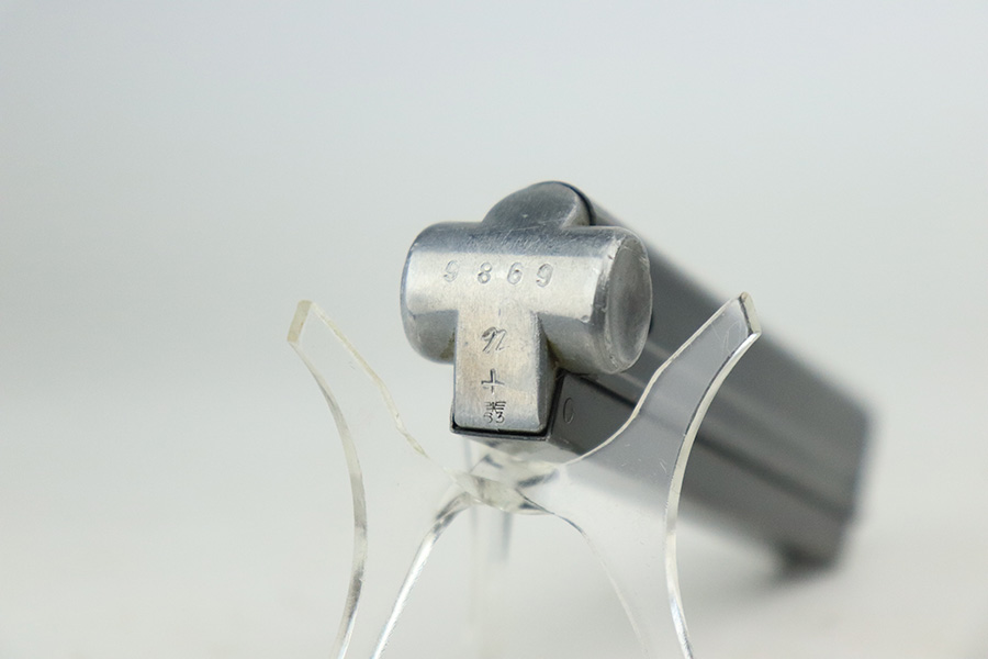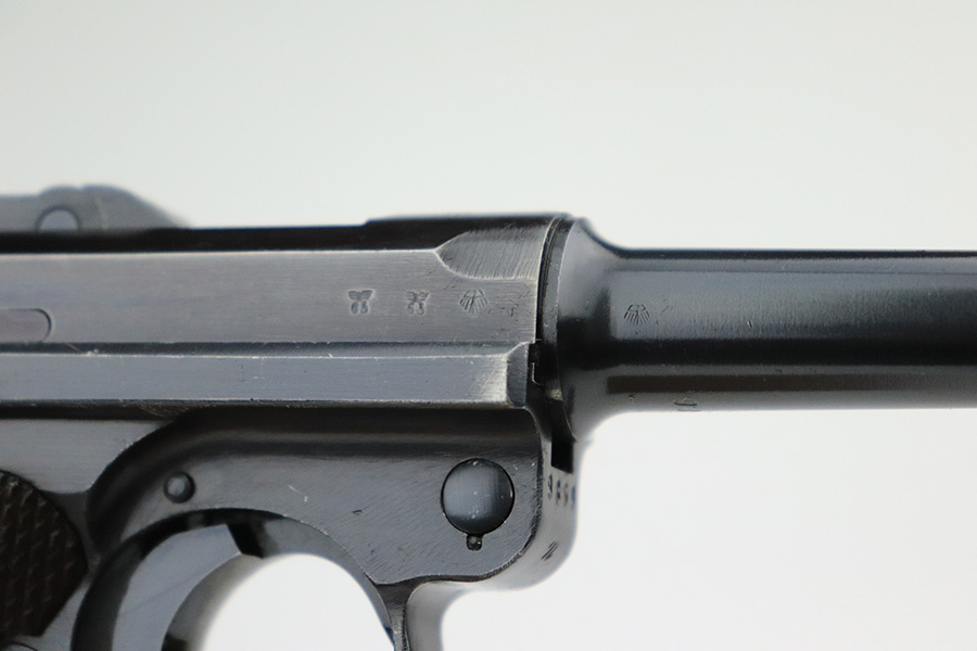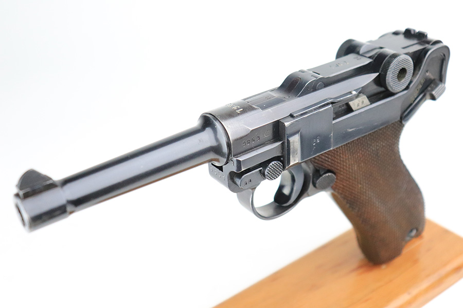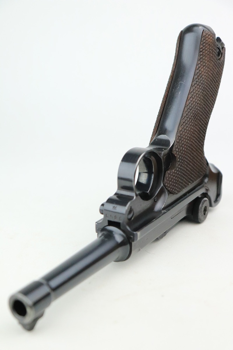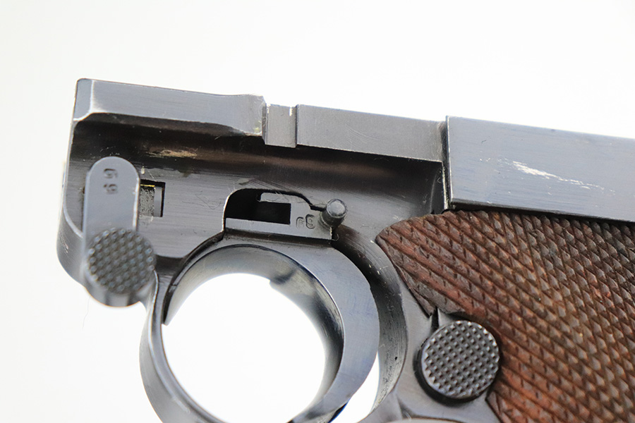 6/14/22 – This is an excellent example of a rare Nazi Mauser Luger variation that was military issued and accepted but diverted to the police. There are only about 3,000 such examples ever made, and this one is 1939 dated with S/42 code on toggle. It features a police sear safety and is in the proper serial range for known examples. This one comes with one original matching-numbered magazine and has retained about 95-96% of its original bluing. There is very minor wear on the side plate, on the front edges of the side rails, and around the muzzle. One light streak of wear on the left side of the frame. Very minor thinning on both grip straps a few tiny scratches on the front strap. Comes with minty matching-numbered wood grips. The bore is near-mint.