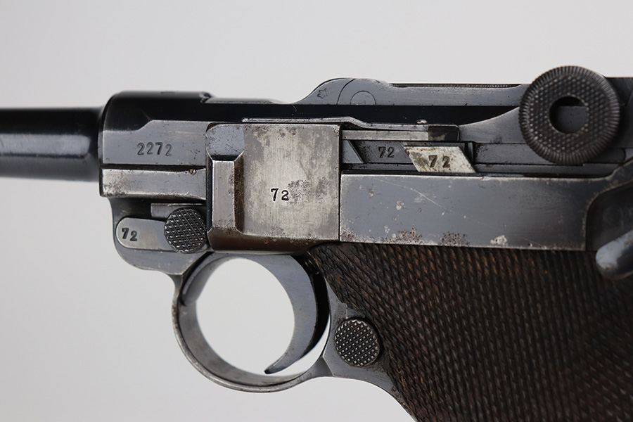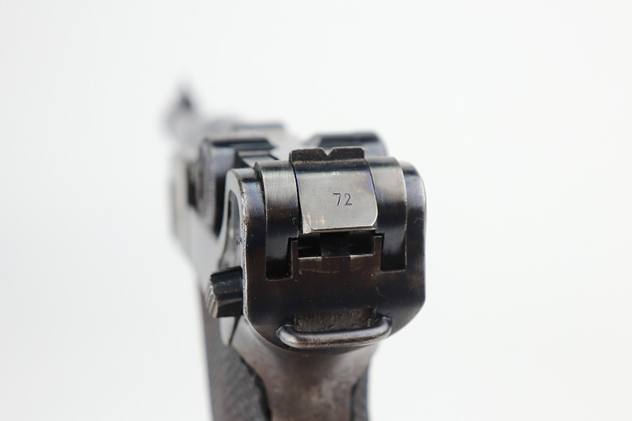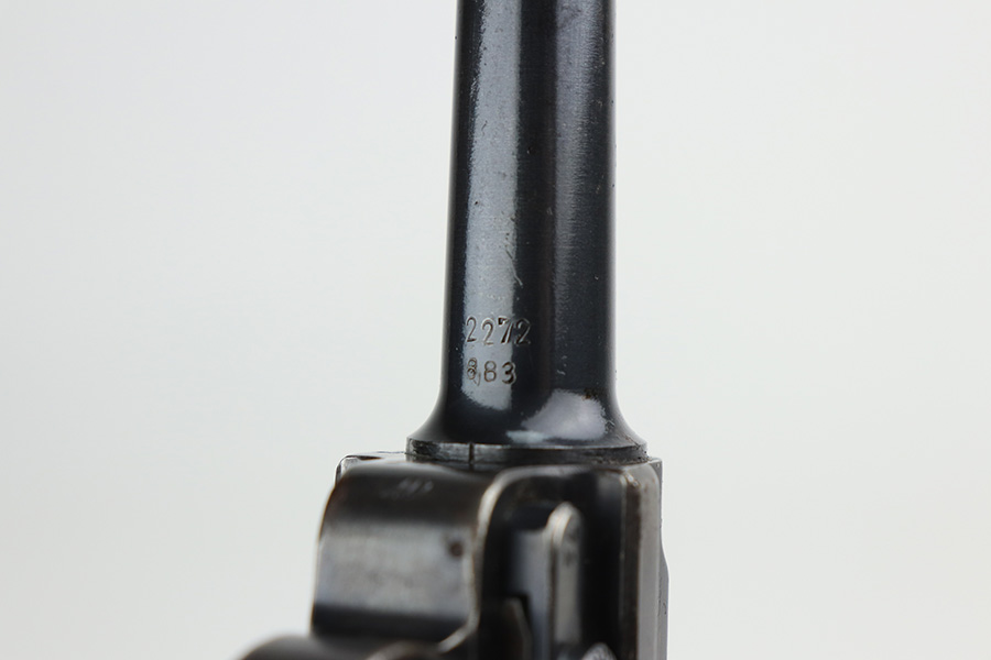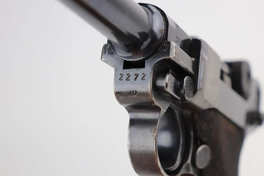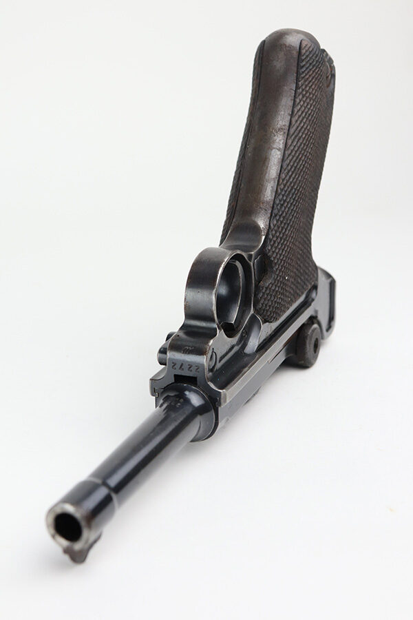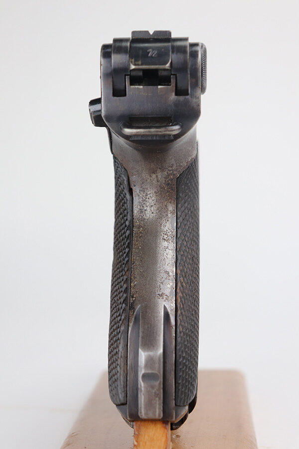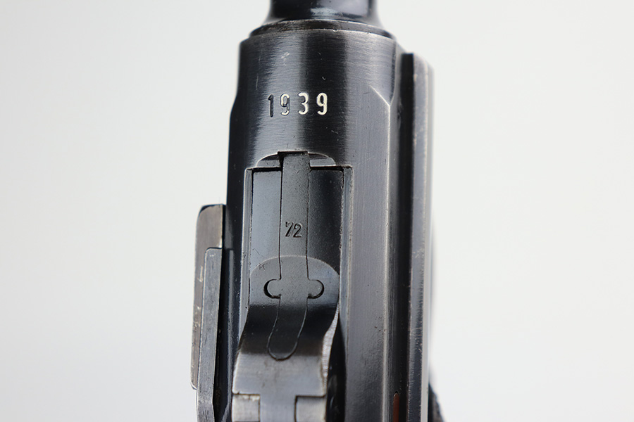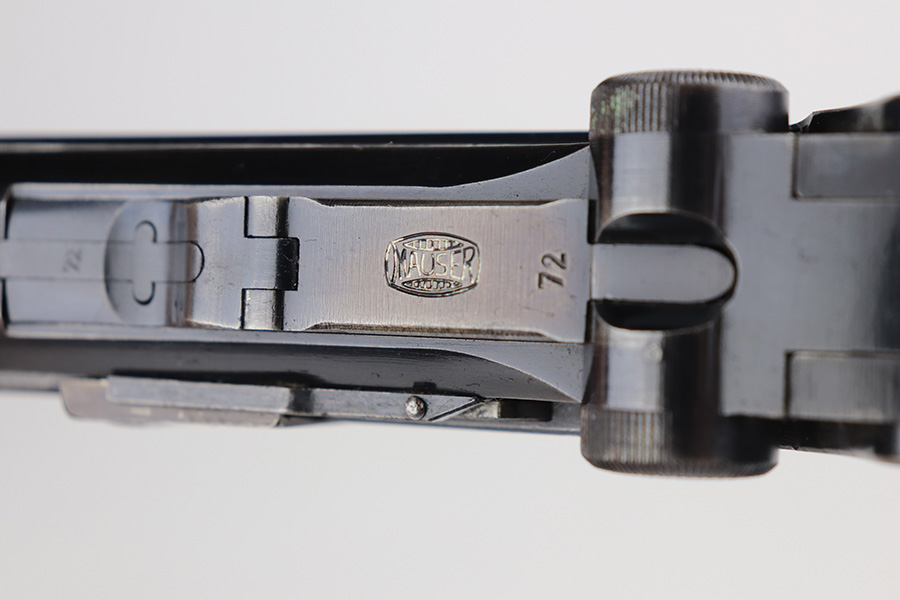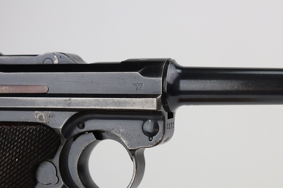 8/12/21 – This is a rare Mauser Luger issued to the Nazi police force in 1939. It is all matching, has the Mauser Banner logo on the toggle, an added police sear safety, and a rare police “Eagle C” marking on the slide. It has retained roughly 65-70% of its original finish. The majority of the finish loss is on the straps, side plate, and side rails, There are areas of spotty textured oxidation throughout, heaviest on the straps. There are areas of pitting on the straps, side plate, and left side of the frame. Comes with un-marked grips with minor bruising throughout. Also comes with a matching magazine. The bore has strong rifling with very minor freckling in the grooves. The slide has trouble locking back – likely just the magazine.