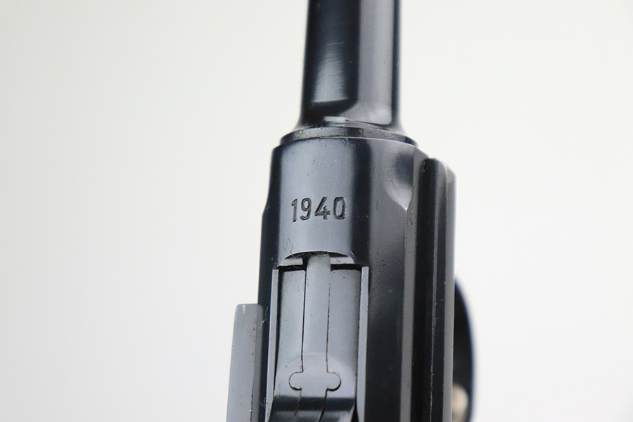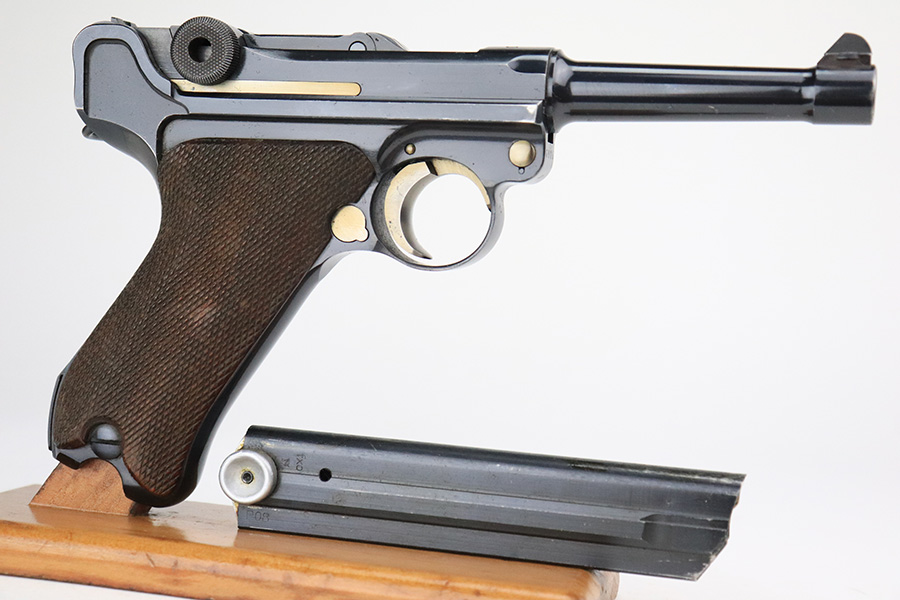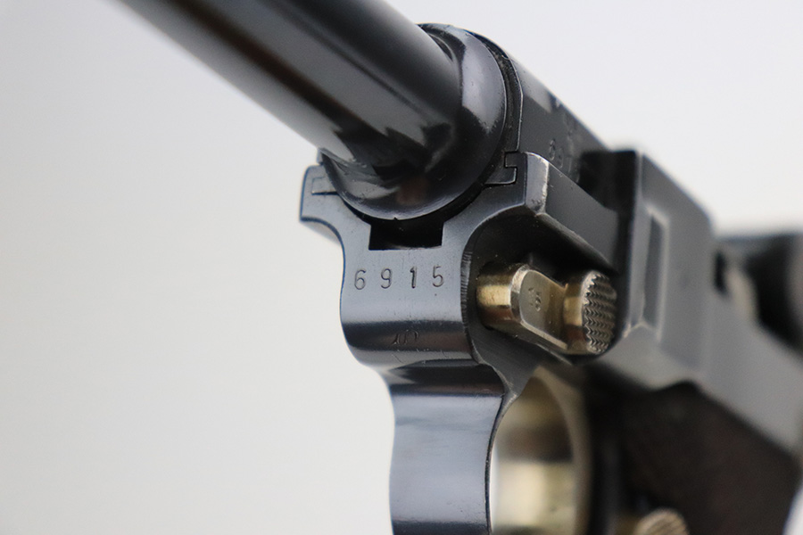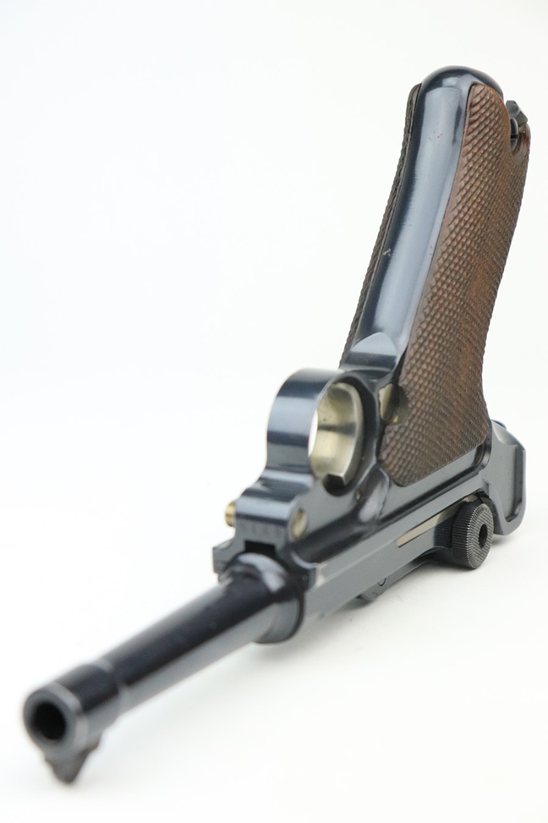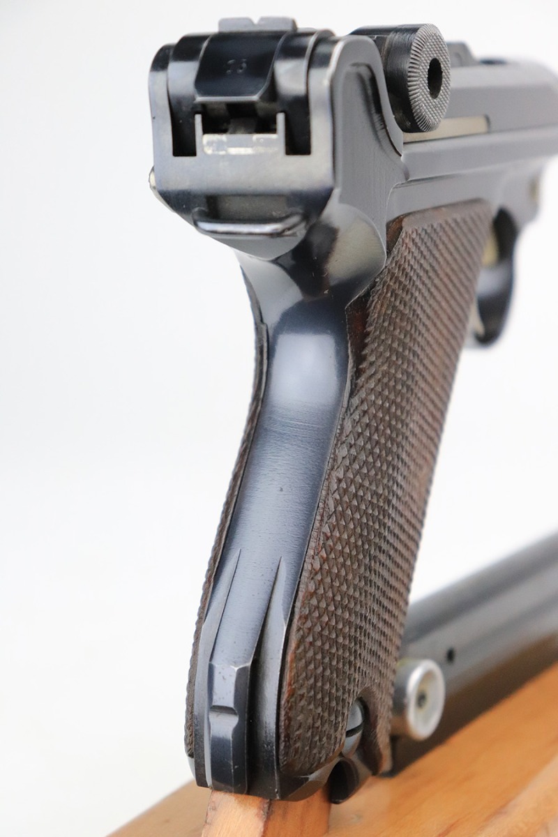 8/15/22 – This is an example of a rare commercial Mauser Banner Luger from 1940. There were only ~7500 commercial banner Lugers produced by Mauser, most in the ‘v’ and ‘w’ serial blocks. This one is all matching and has the proper “Eagle N” commercial proofs. We believe this gun has been professionally restored and refinished, so the bluing is very nice throughout. Very minor wear on the side plate, side rails, and around the muzzle. One small spot of wear on the front strap. Comes with minty “Eagle 655” proofed grips and a period-correct un-numbered magazine. Excellent bore with strong rifling.