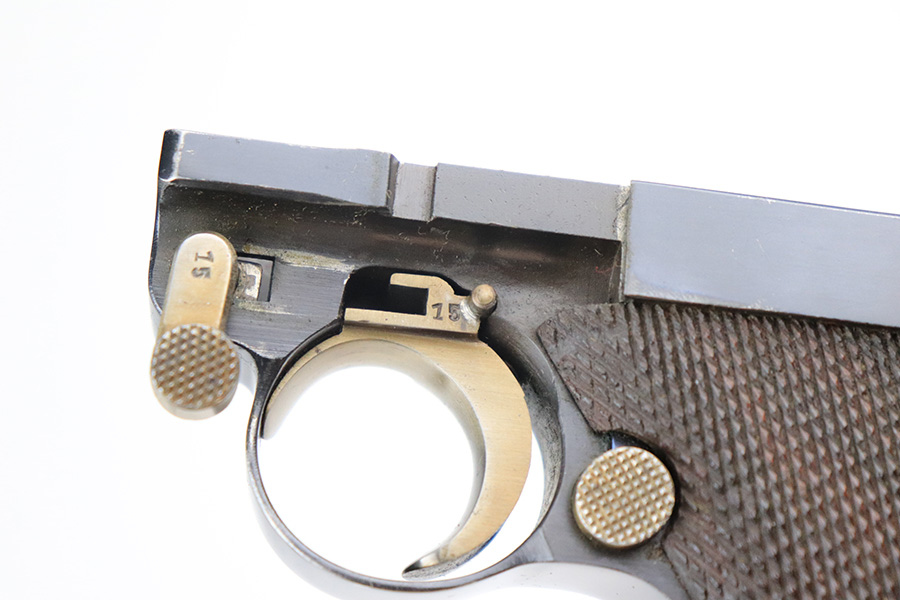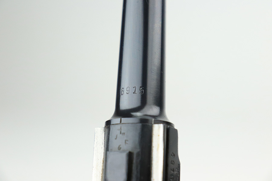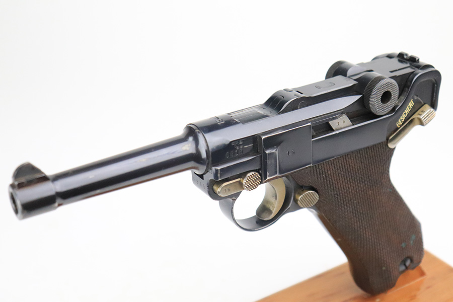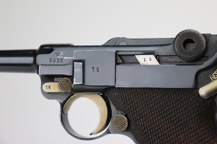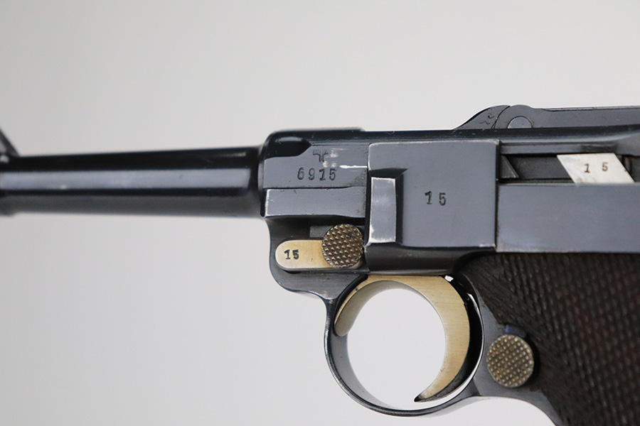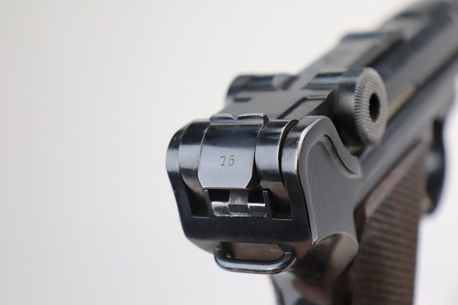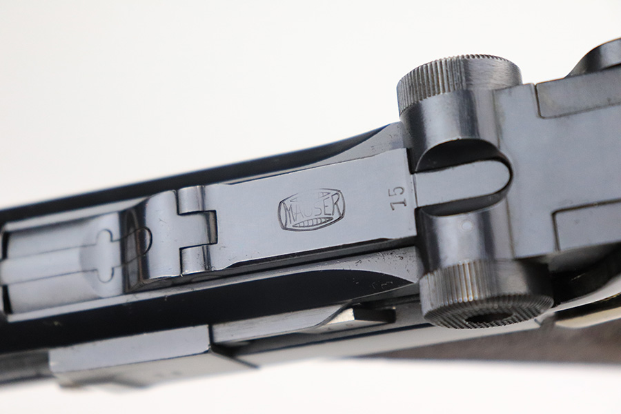 8/15/22 – This is an example of a rare commercial Mauser Banner Luger from 1940. There were only ~7500 commercial banner Lugers produced by Mauser, most in the ‘v’ and ‘w’ serial blocks. This one is all matching and has the proper “Eagle N” commercial proofs. We believe this gun has been professionally restored and refinished, so the bluing is very nice throughout. Very minor wear on the side plate, side rails, and around the muzzle. One small spot of wear on the front strap. Comes with minty “Eagle 655” proofed grips and a period-correct un-numbered magazine. Excellent bore with strong rifling.