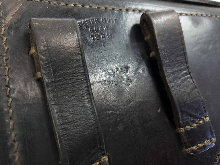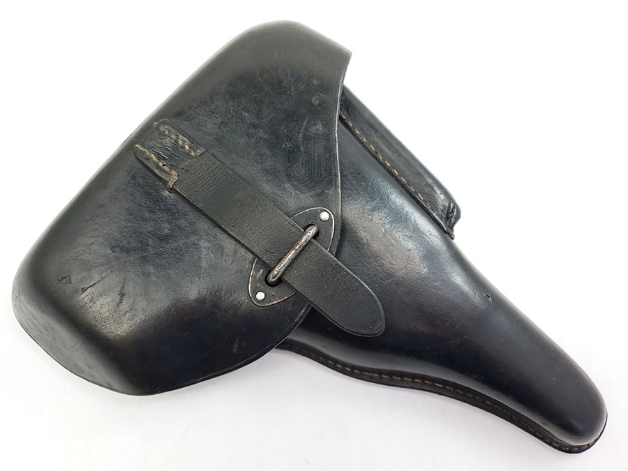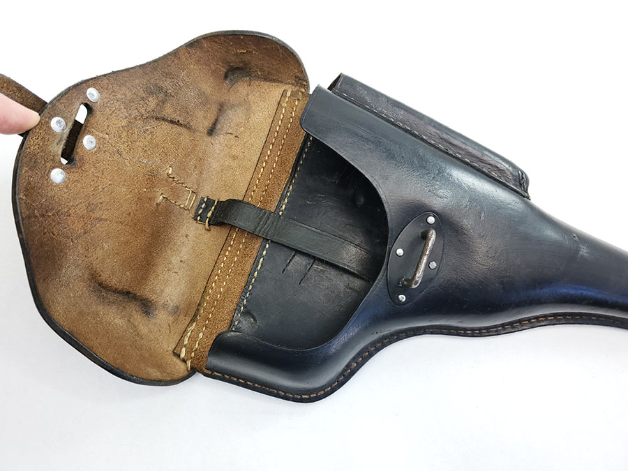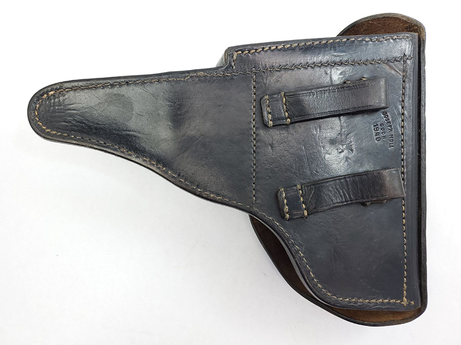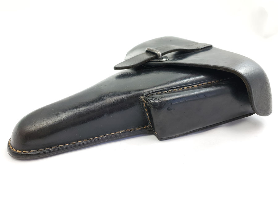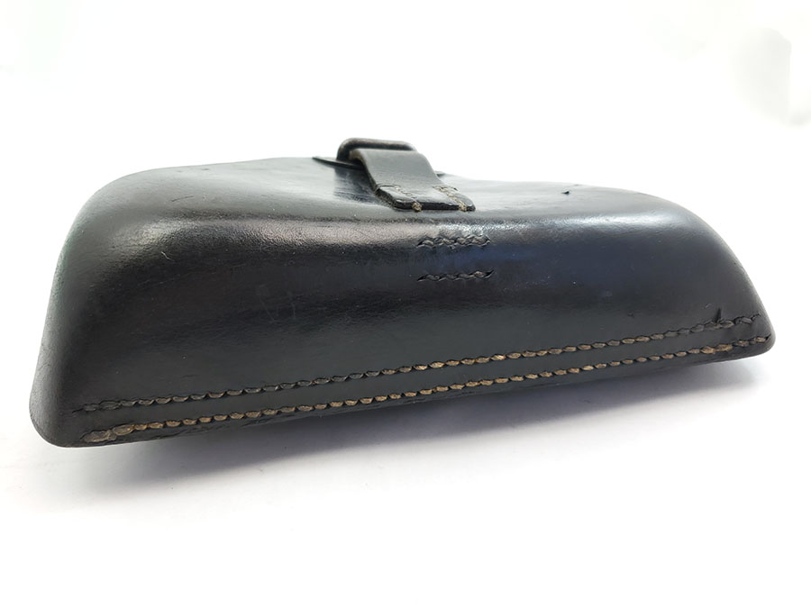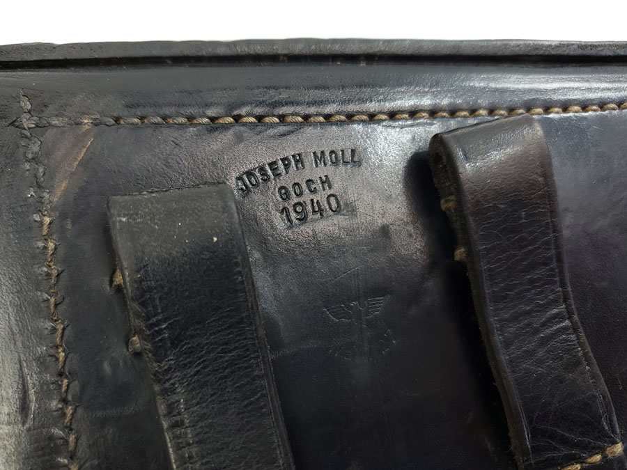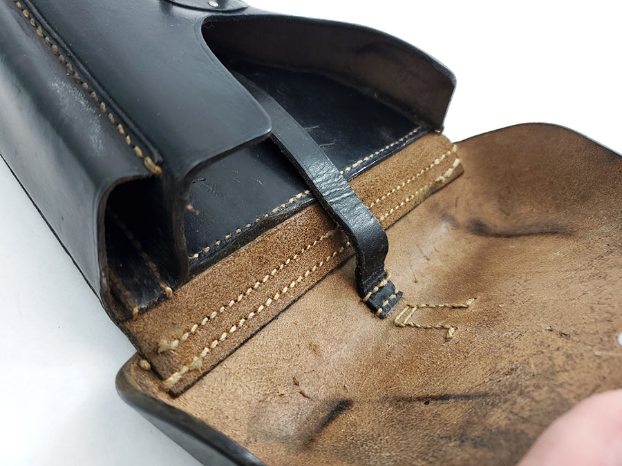 7/16/20 – This is an original 1940 dated P.38 holster. The holster is in excellent overall condition. The back of the holster is maker stamped, dated, and waffen military proof stamped. There is no P.38 stamp on the back of the holster, but the maker (German holster manufacturer, not Czech) as well as the lack of additional leather strap on the interior of the magazine pouch both indicate this is a true P.38 holster. One of the hardest years to find, and almost never comes up in this condition.
