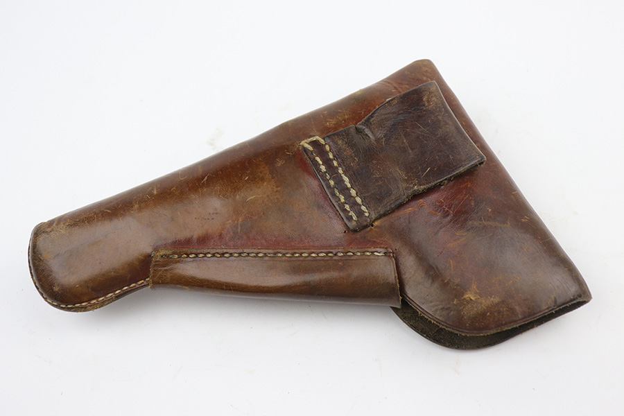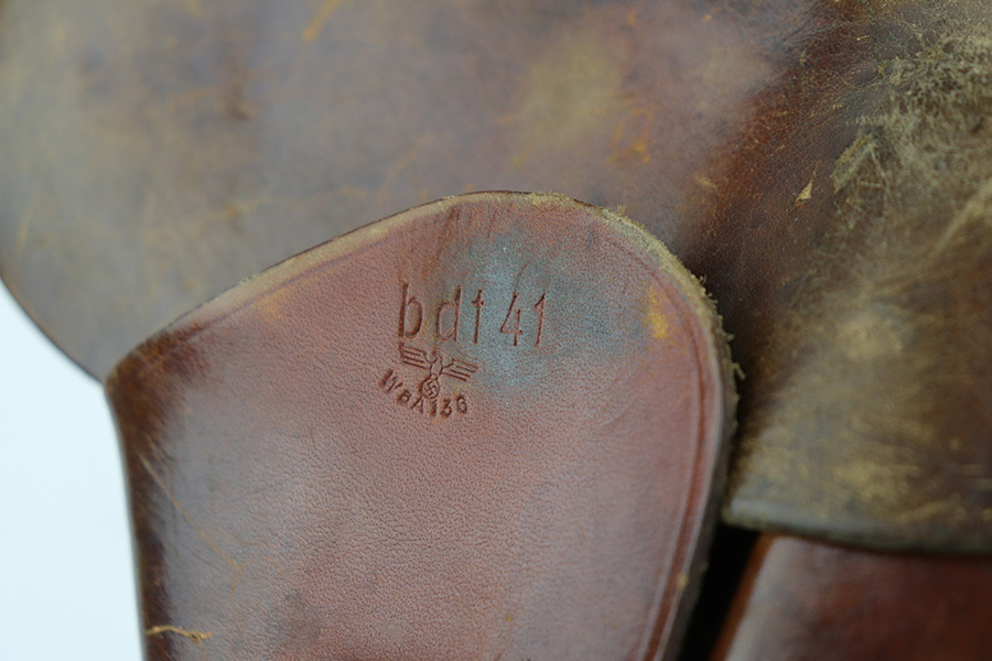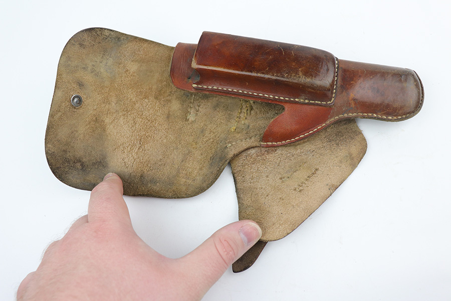 8/27/21 – This is a rare 1941-dated waffen-proofed holster for an FN Browning Hi Power Pistol. Overall, it is in nice condition. The leather is soft and workable, but there are scuffs throughout and areas of wear near the high edges. The stitching is in tact. Some minor crimping in the belt loop.