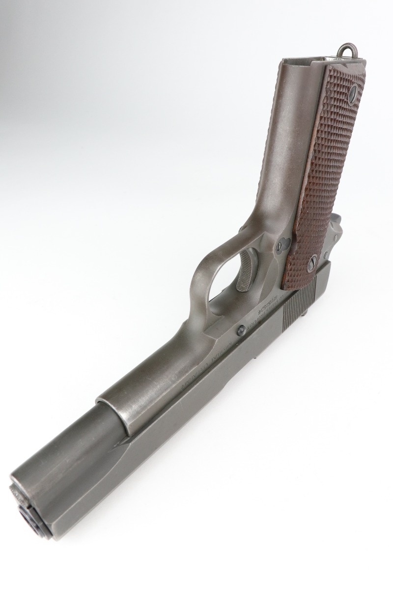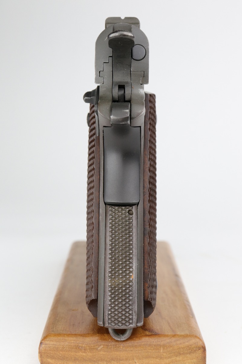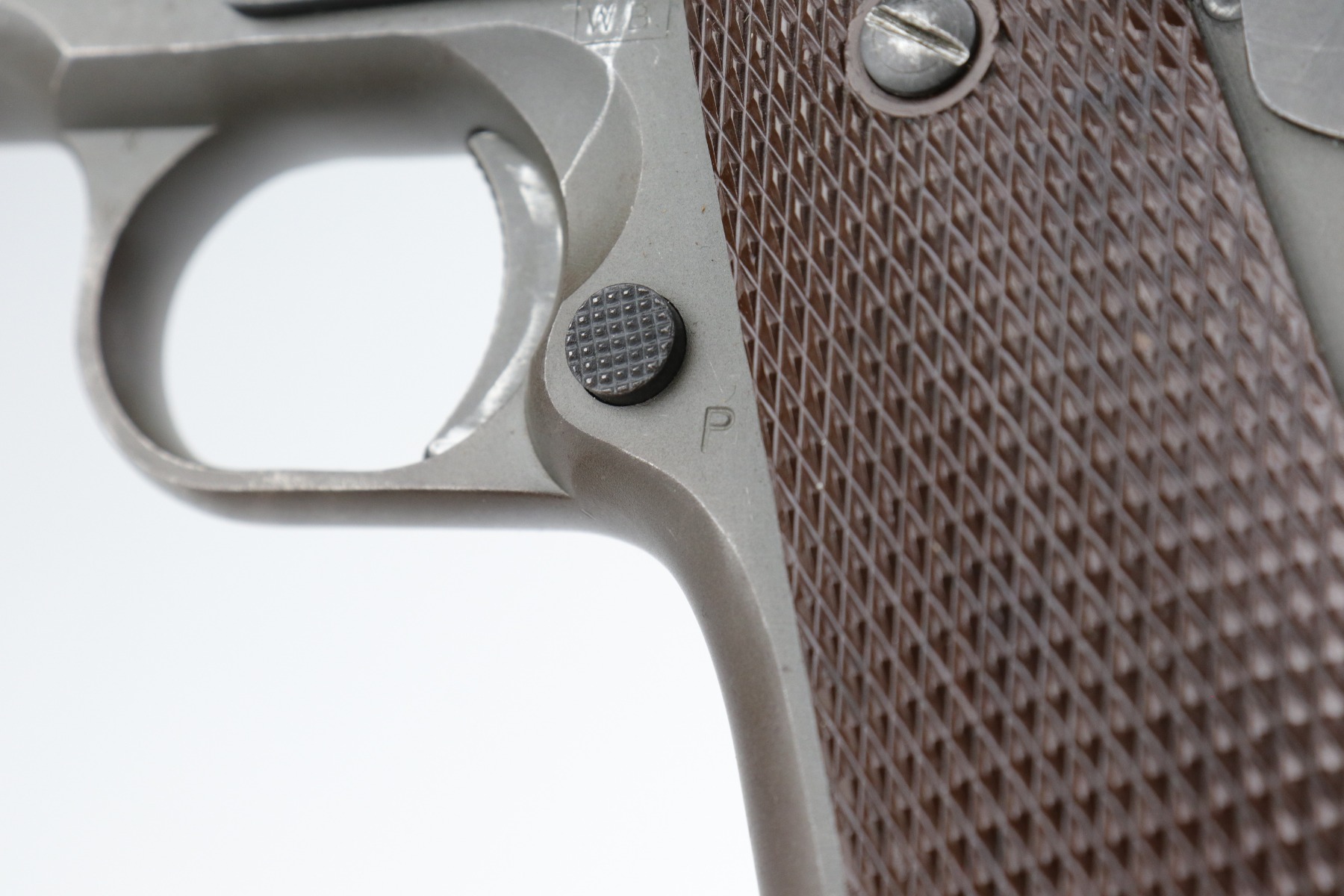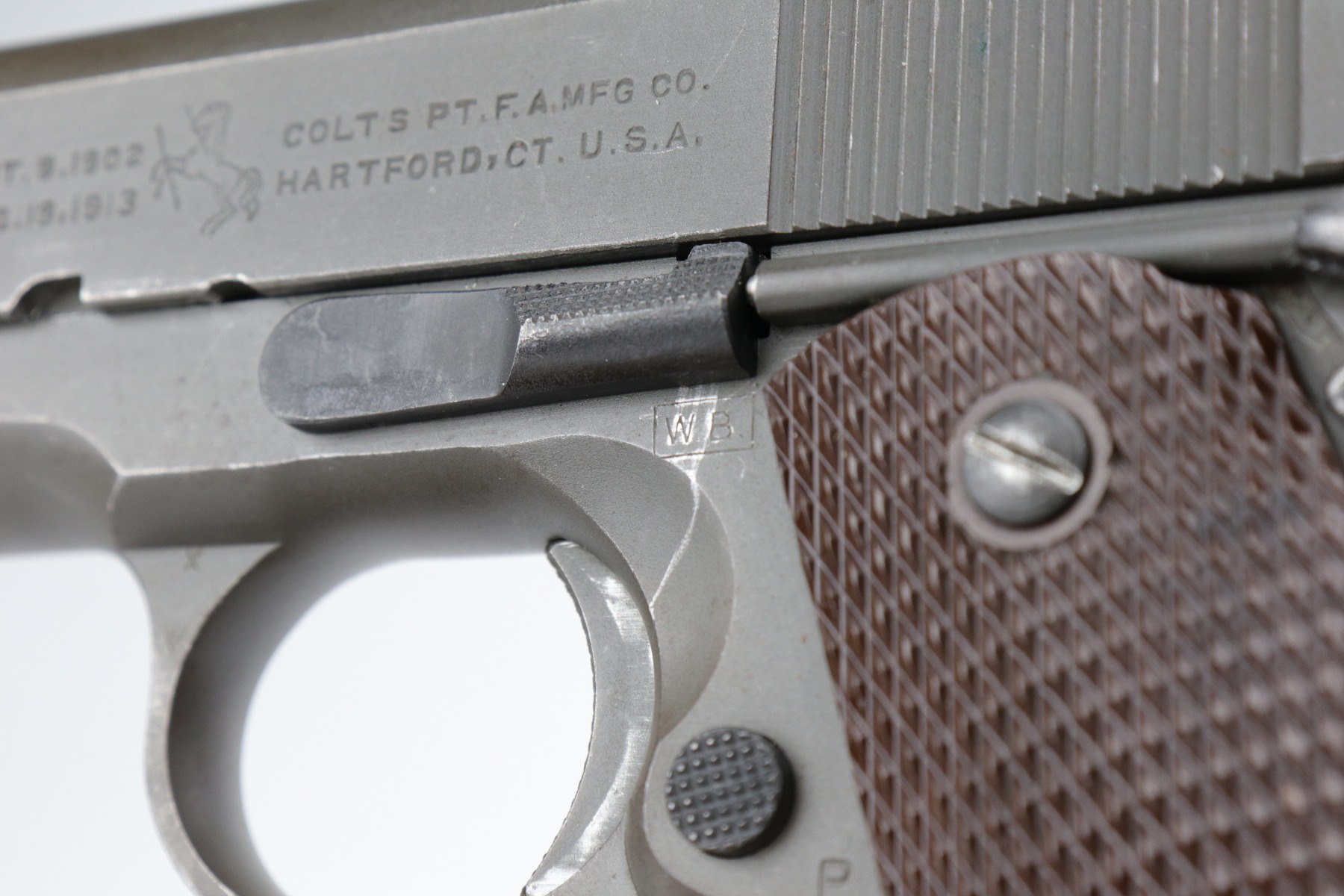 1/13/21 – This an excellent example of a rare Colt Model 1911A1 complete rig issued to the US Military in 1941. What makes this one special is the “WB” inspector proof on this gun. There are only a couple of thousand guns made in 1941 with this inspector marking. The gun comes with a minty 1942-dated holster, original canvas belt, and 1942-dated canvas magazine pouch. The gun has the proper military cross canon cartouche. The slide is numbered and matching. The gun has retained about 92-94% of its original finish. There is wear around the muzzle, high edges of the slide, and spotty wear on the front strap. There are some light handling marks here and there. There is some minor spotty oxidation on the front strap and right side of the gun. Excellent bore – shiny with strong rifling. It comes with excellent grips and one proper magazine.