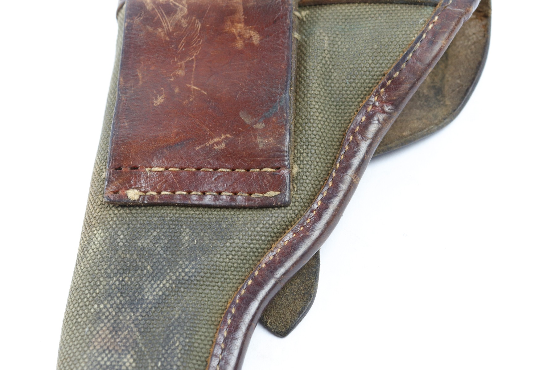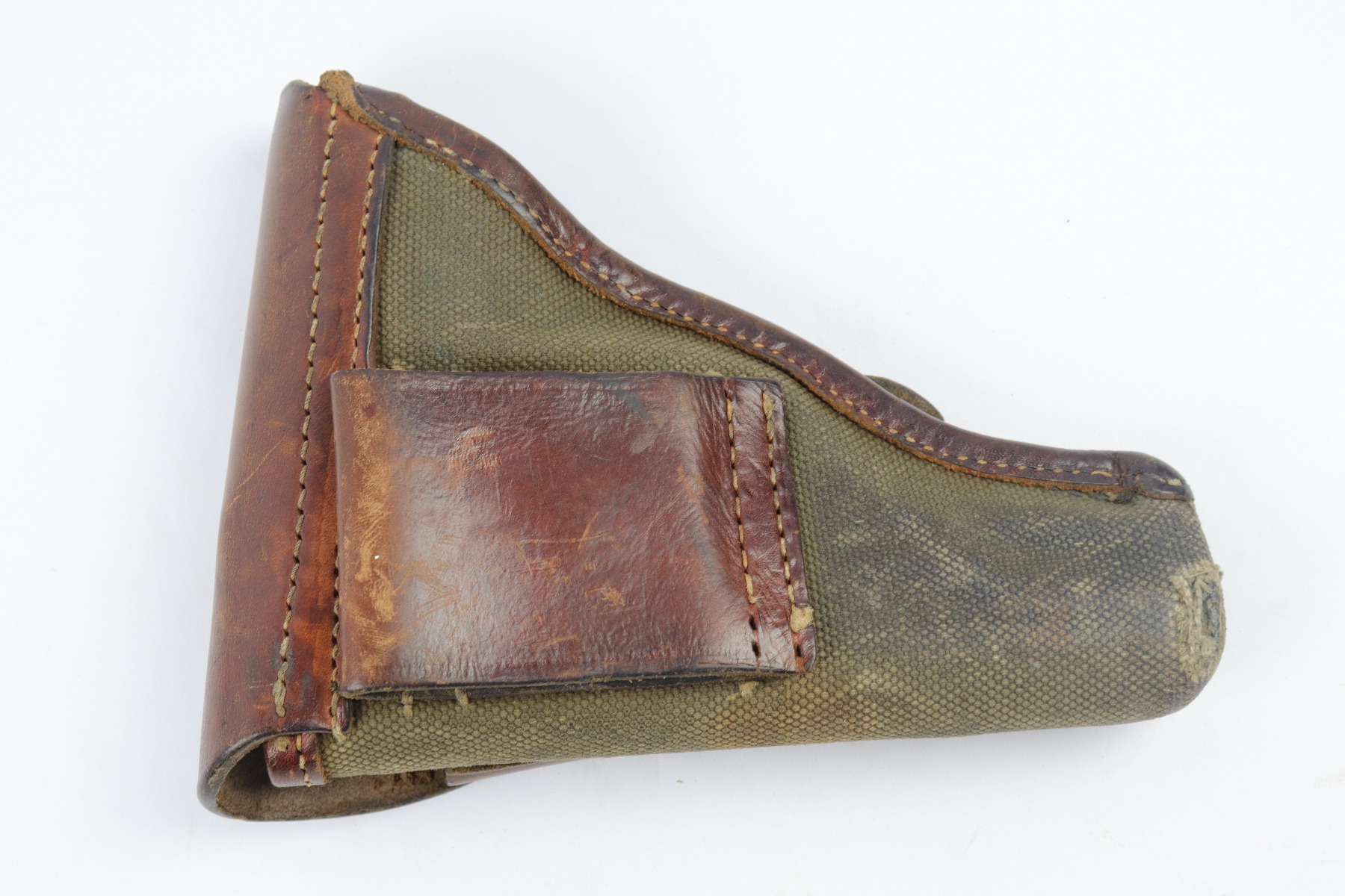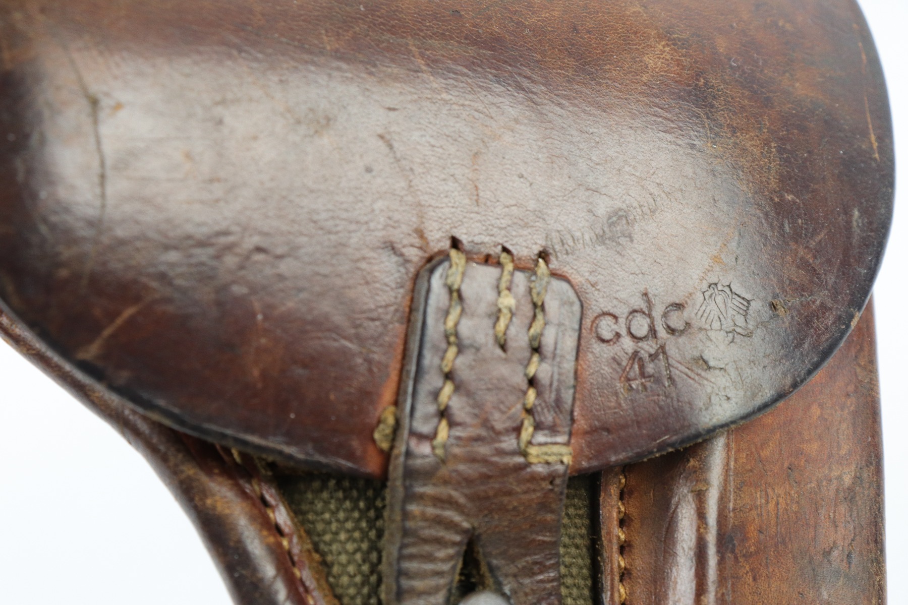 4/3/18 – This is an original 1941 dated canvas femaru holster from WW2. This holster is a rare variation not only because of the canvas style, but also because the maker stamp and date are on the front lid leather instead of the back belt loop. The maker is “cdc” and 1941 is the date. There’s also a Luftwaffe eagle/7 proof stamp. The leather is firm and completely in tact. There is some exterior scuffing, but this is normal use and aging wear. The interior leather is clean and has a legible ink stamp. The back belt loop is missing about 3 stitches, but the rest of the stitching is in tact. Guaranteed original.