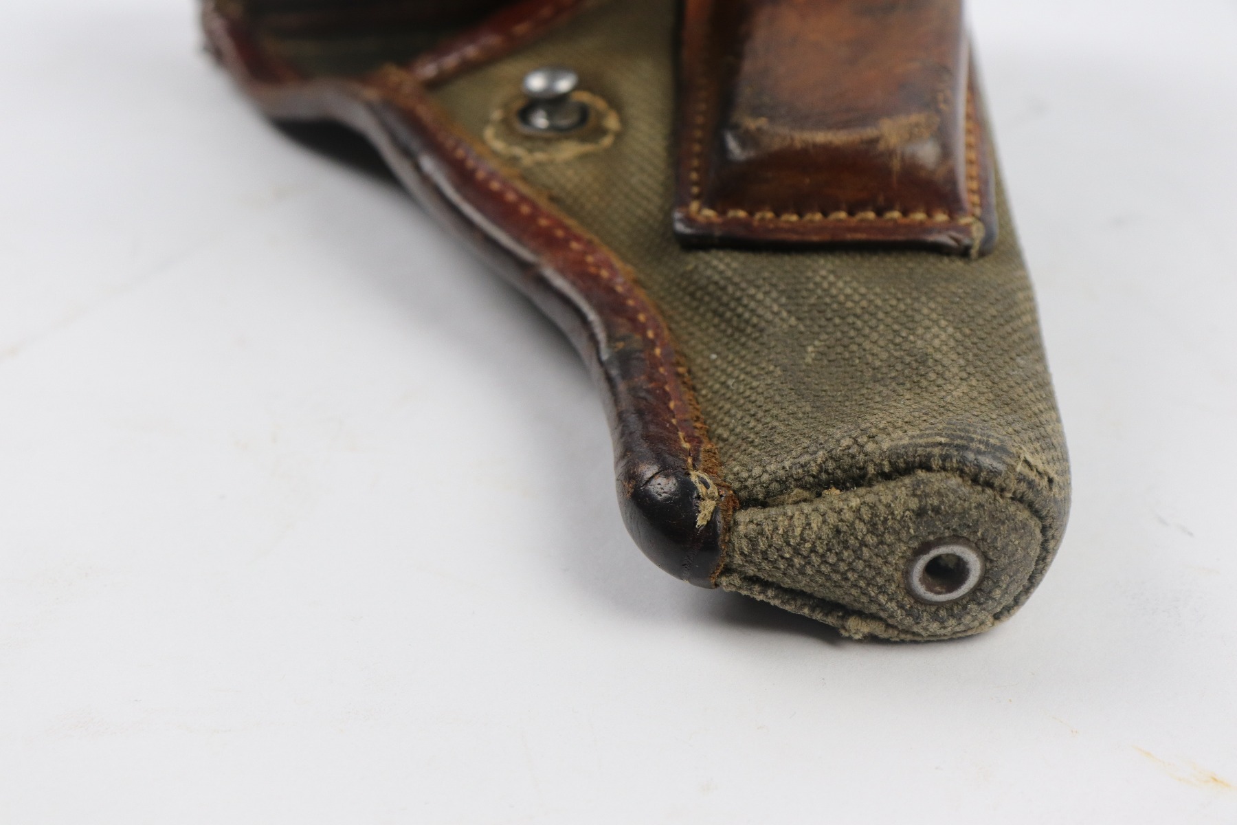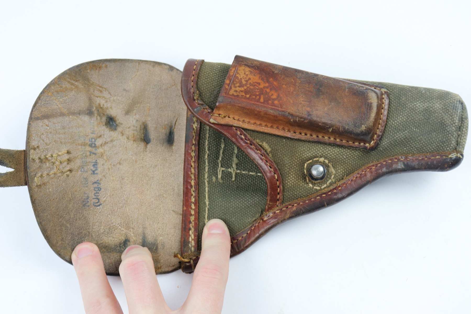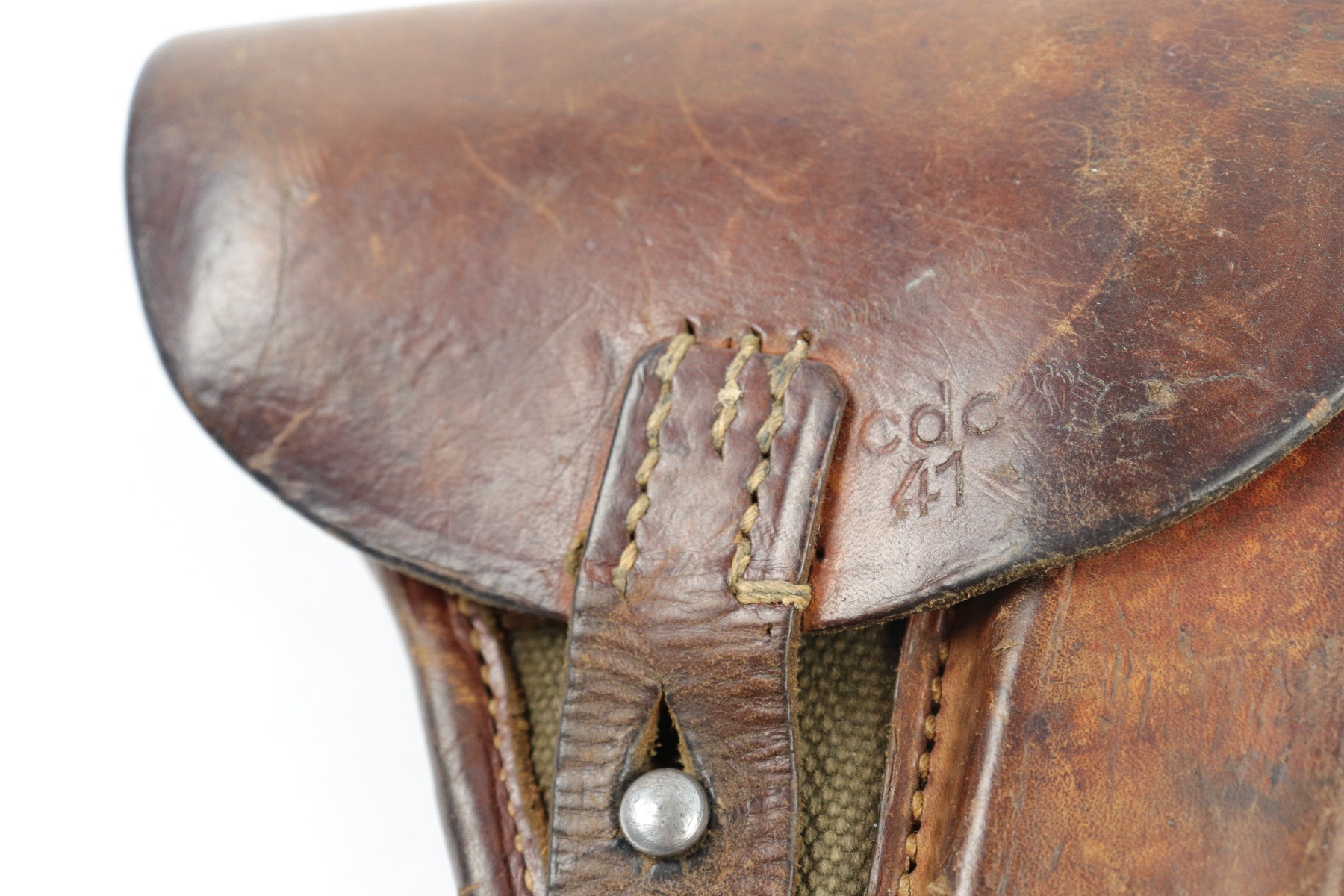 4/3/18 – This is an original 1941 dated canvas femaru holster from WW2. This holster is a rare variation not only because of the canvas style, but also because the maker stamp and date are on the front lid leather instead of the back belt loop. The maker is “cdc” and 1941 is the date. There’s also a Luftwaffe eagle/7 proof stamp. The leather is firm and completely in tact. There is some exterior scuffing, but this is normal use and aging wear. The interior leather is clean and has a legible ink stamp. The back belt loop is missing about 3 stitches, but the rest of the stitching is in tact. Guaranteed original.