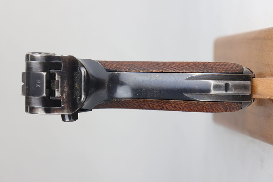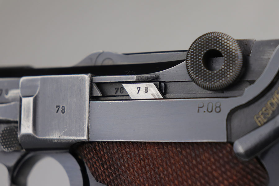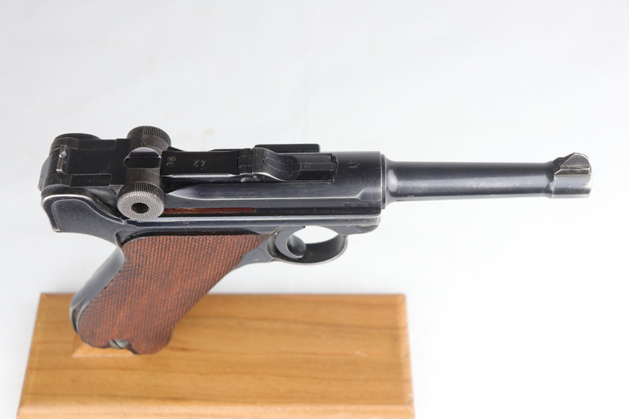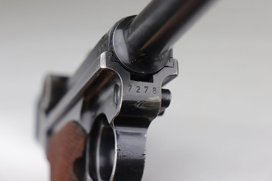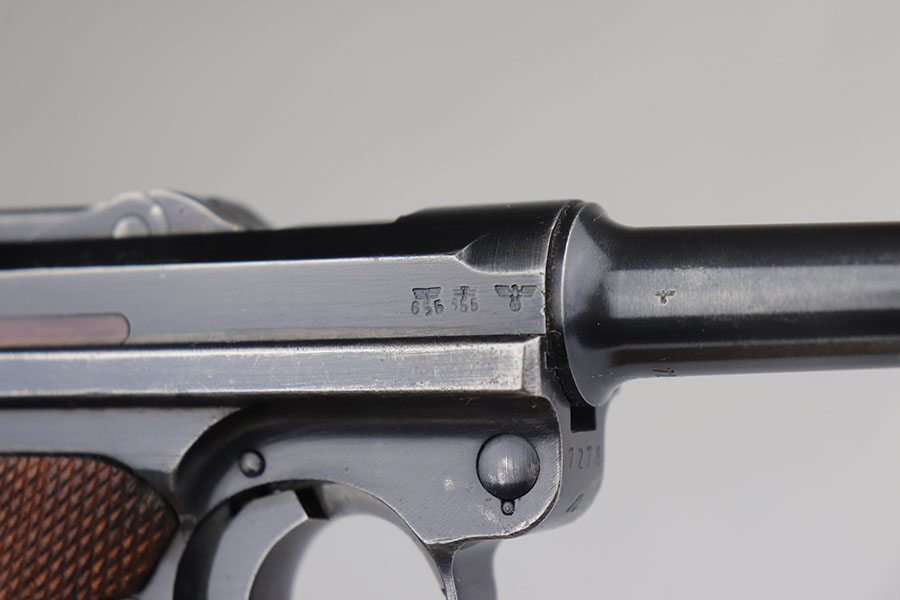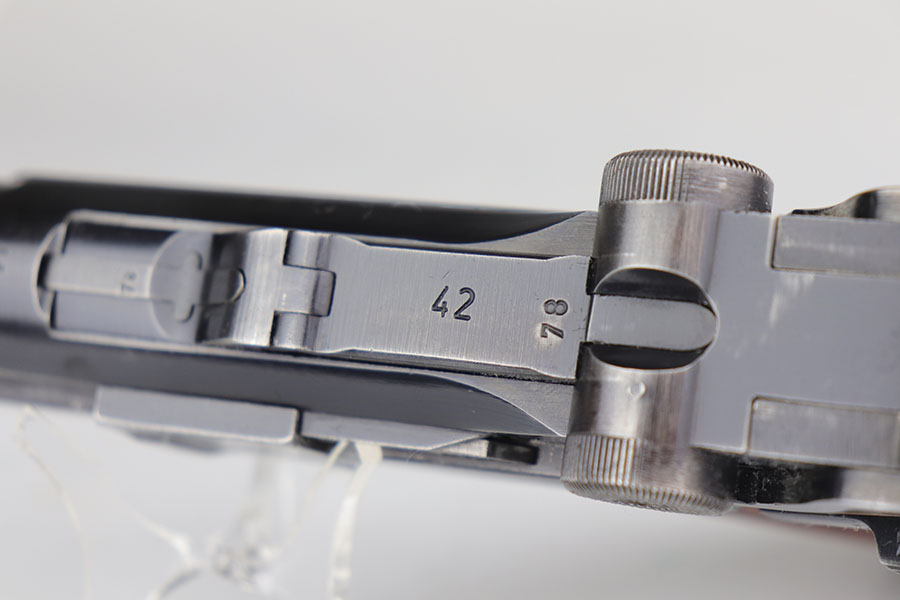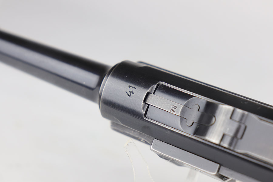 8/4/20 – This is a rare Nazi Mauser Luger referred to as a ’41/42′ code, one of only 7,000 produced. It’s all matching and original, with scarce 122 code magazine with blank bottom. The grips are unmarked but fit the gun very well and they’re in great condition. The pistol has original blue with some finish loss on the sideplate, straps and either side of the barrel. Excellent bore.