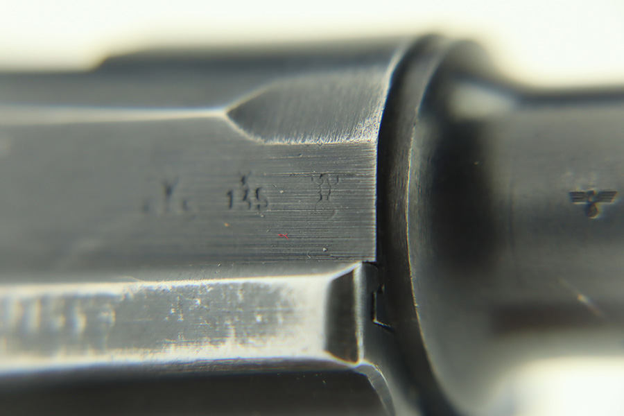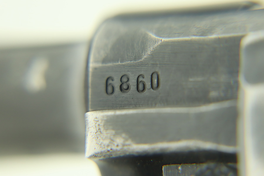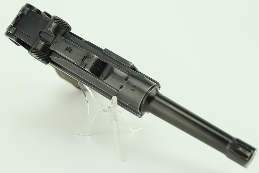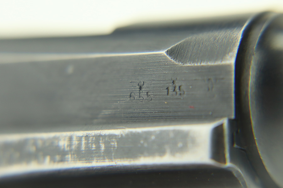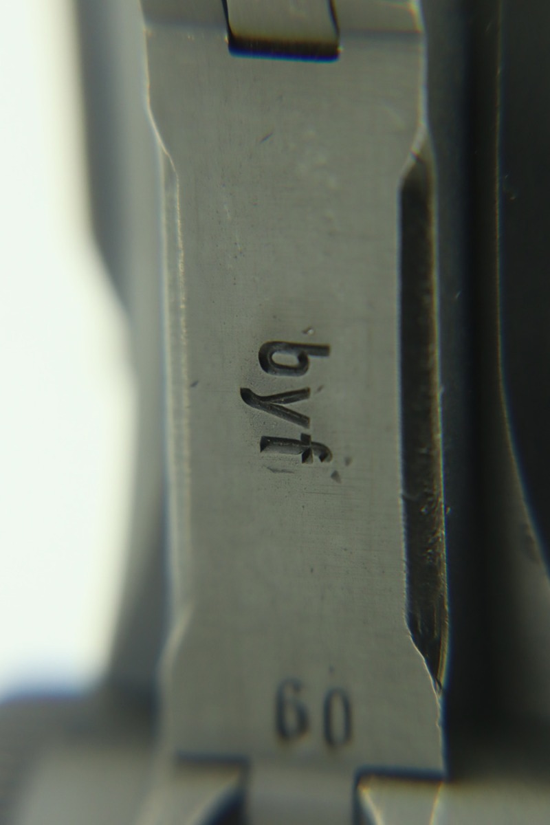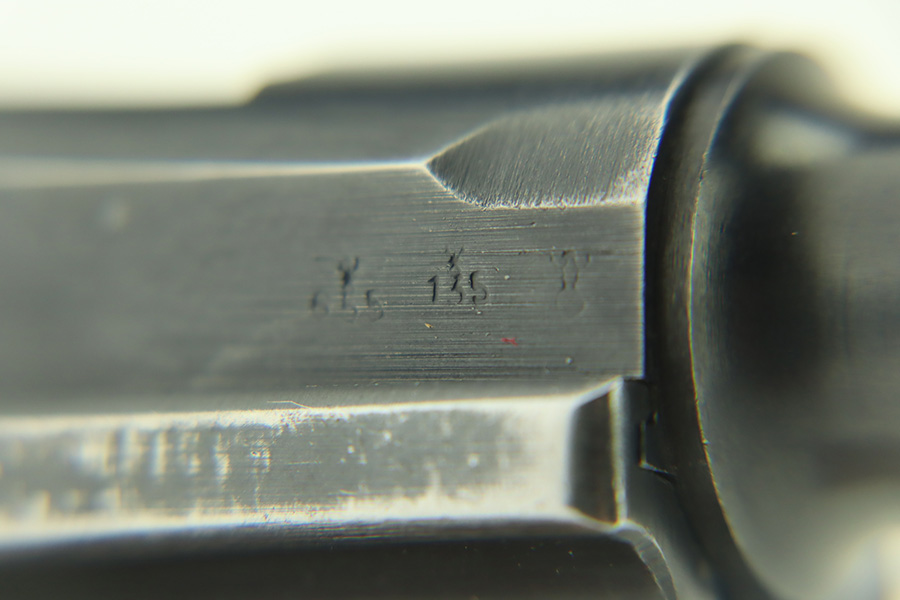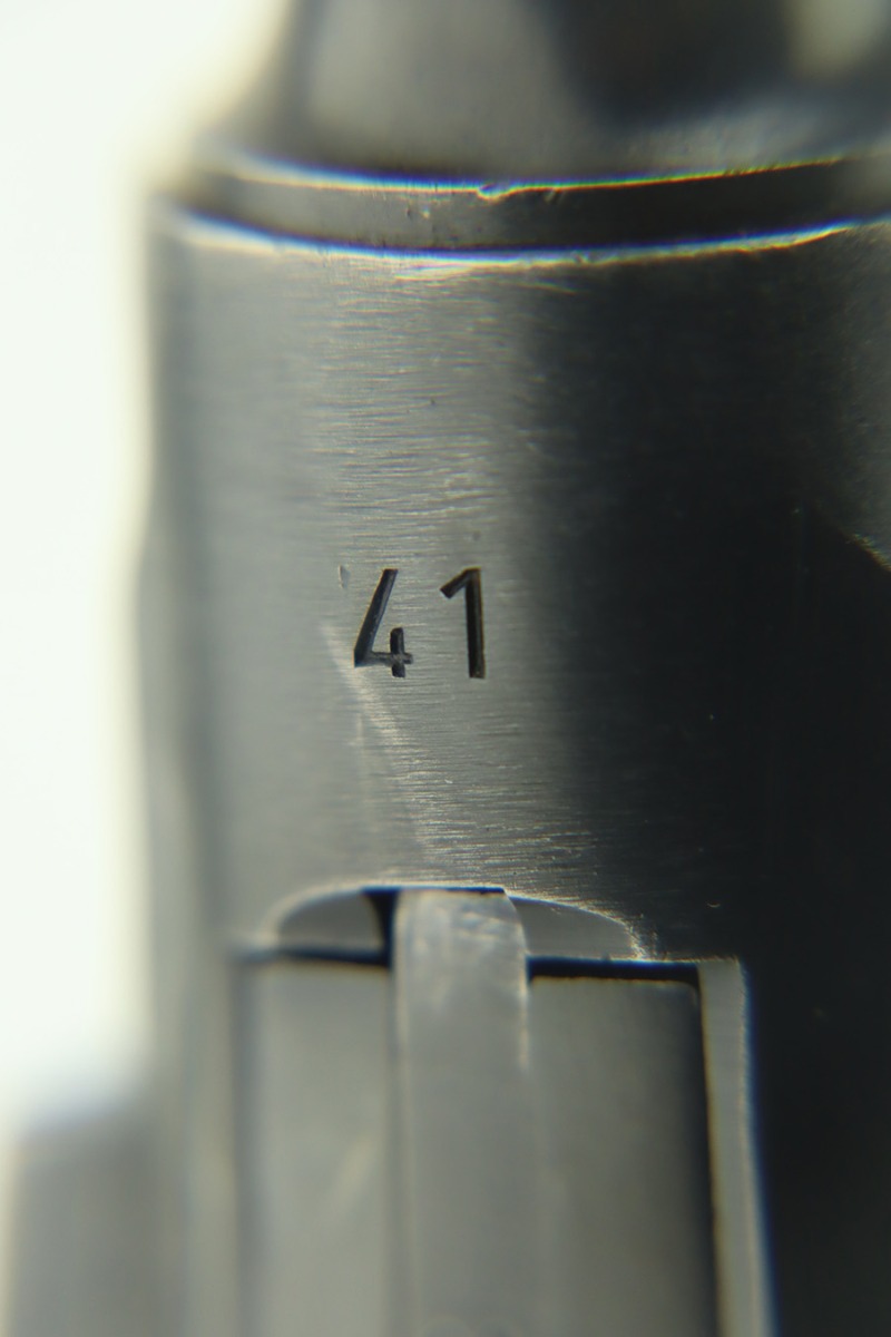 1/30/24 – This is a very nice BYF 41 Mauser Luger issued to the Nazi military in 1941. It is a rare mixed proofs variation with both E/655 and E/135 proofs on receiver. It is all matching. Its original finish rates about 93% with wear around the muzzle and general high edge wear. Fitted with matching-numbered “Eagle 655” marked wood grips – there is a repaired hairline crack on the right side only visible from the inside. Comes with a blank “Eagle 655” marked magazine. Excellent bore with great rifling.