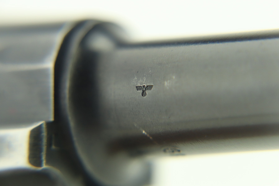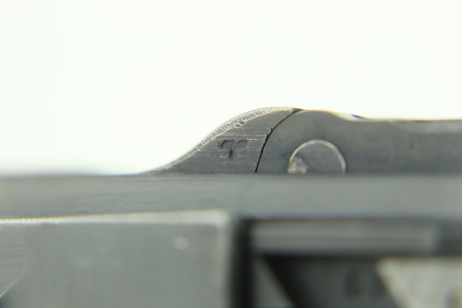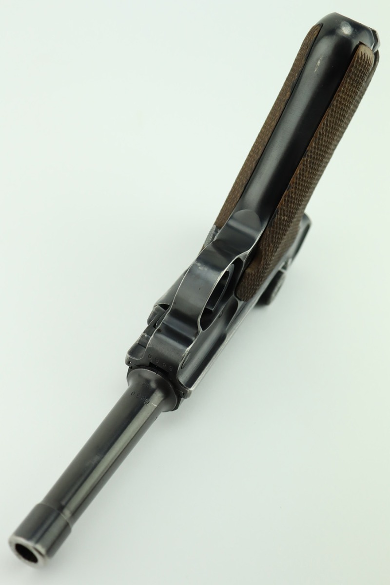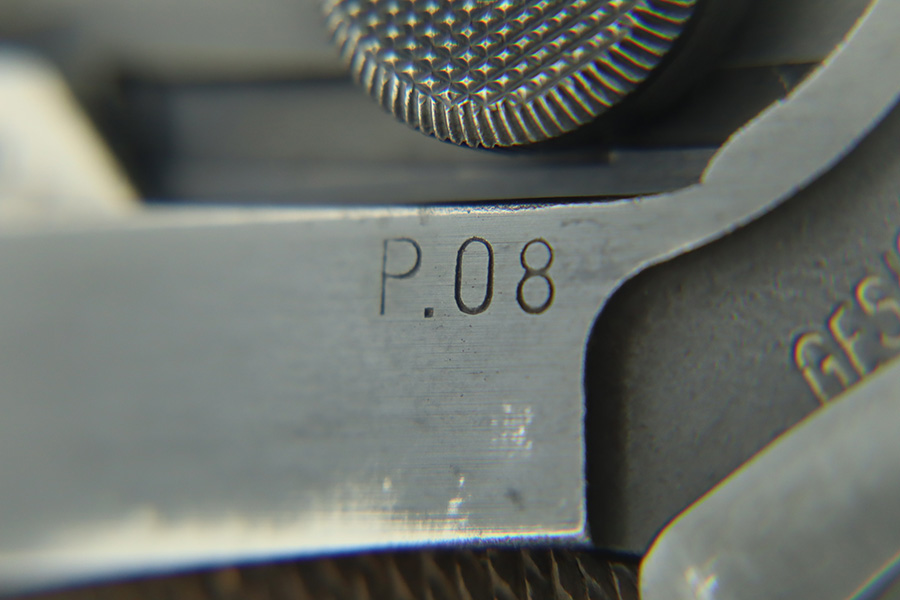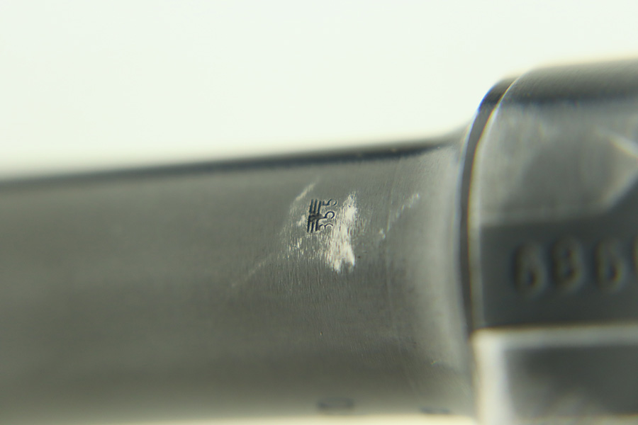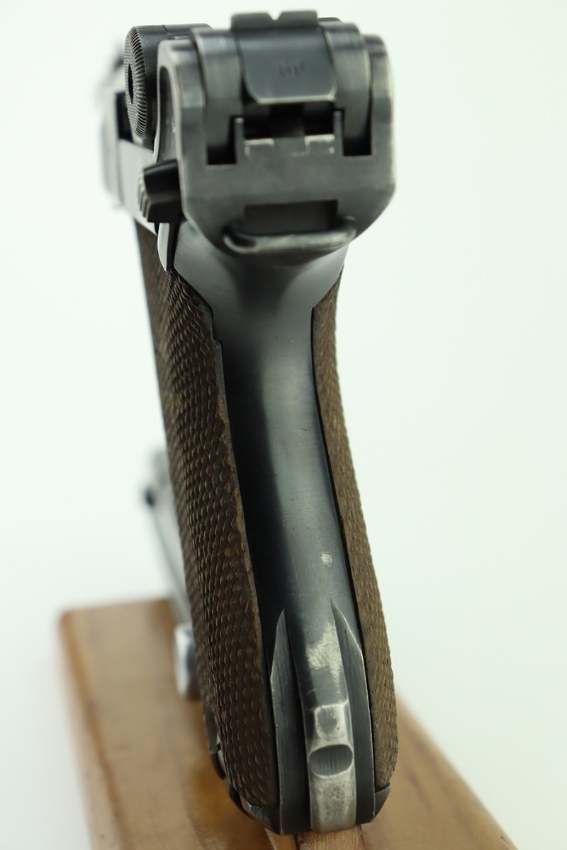 1/30/24 – This is a very nice BYF 41 Mauser Luger issued to the Nazi military in 1941. It is a rare mixed proofs variation with both E/655 and E/135 proofs on receiver. It is all matching. Its original finish rates about 93% with wear around the muzzle and general high edge wear. Fitted with matching-numbered “Eagle 655” marked wood grips – there is a repaired hairline crack on the right side only visible from the inside. Comes with a blank “Eagle 655” marked magazine. Excellent bore with great rifling.
