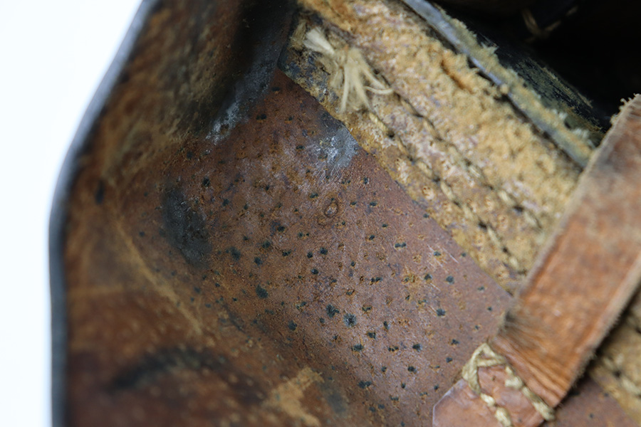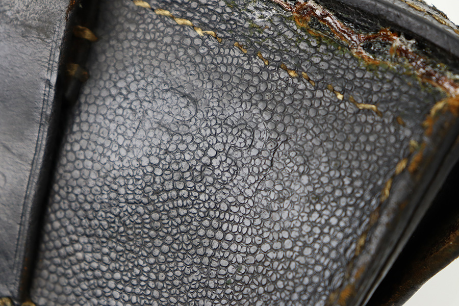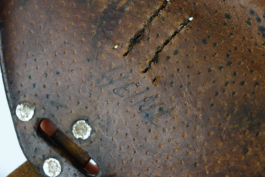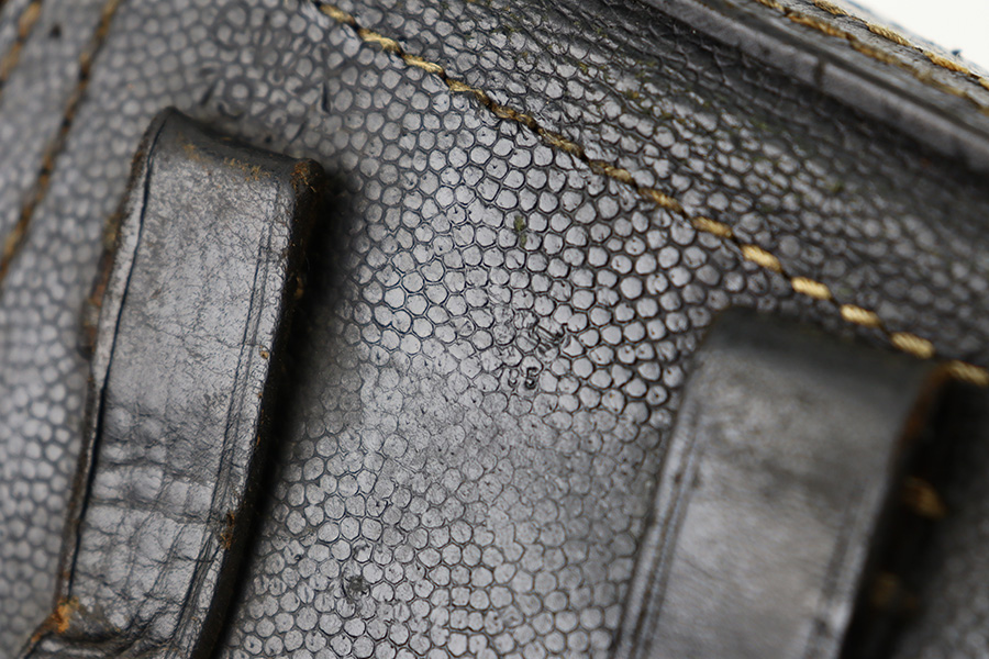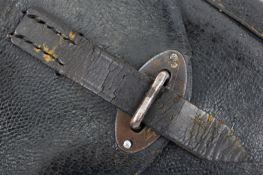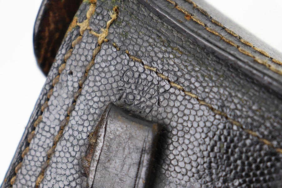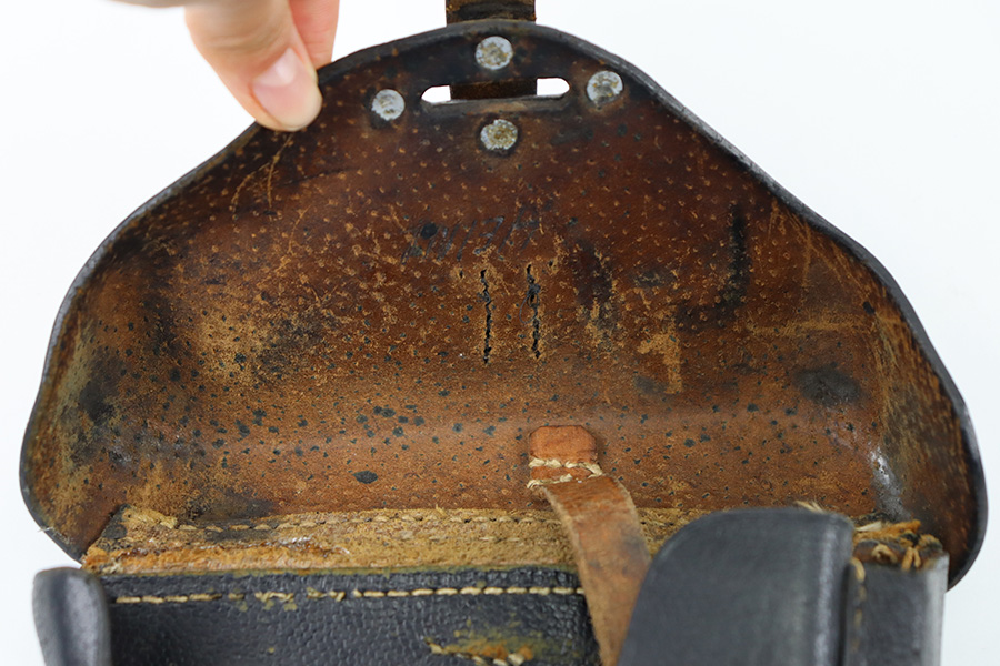 10/25/23 – This is a rare variation 1941 dated P.38 holster made from pigskin leather. The leather has a pebble grain exterior pattern, but the interior lid shows small pock-marks which is indicative of pigskin leather. There are very few examples of P.38 pigskin holsters, as the Germans were trying different materials to save / help the supply chain for cow leather. This holster is in good overall condition but there are a few noteworthy flaws. First, the back leather has a crack in the upper right corner. This has been repaired with glue, as shown. Second, the closure strap has replacement stitching, and there’s some cracking on the leather of the closure strap. Third, the horizontal line of stitching below the belt loops on the back leather is missing a few stitches. This doesn’t affect fit or function, but is noteworthy. The rest of the stitching is original and in great shape. The leather has normal pliability and exterior scuffing. There’s a small hole on the corner of the mag pouch. The back leather is maker stamped, dated, and waffen proof stamped. A “battle worn” example of a very scarce holster.