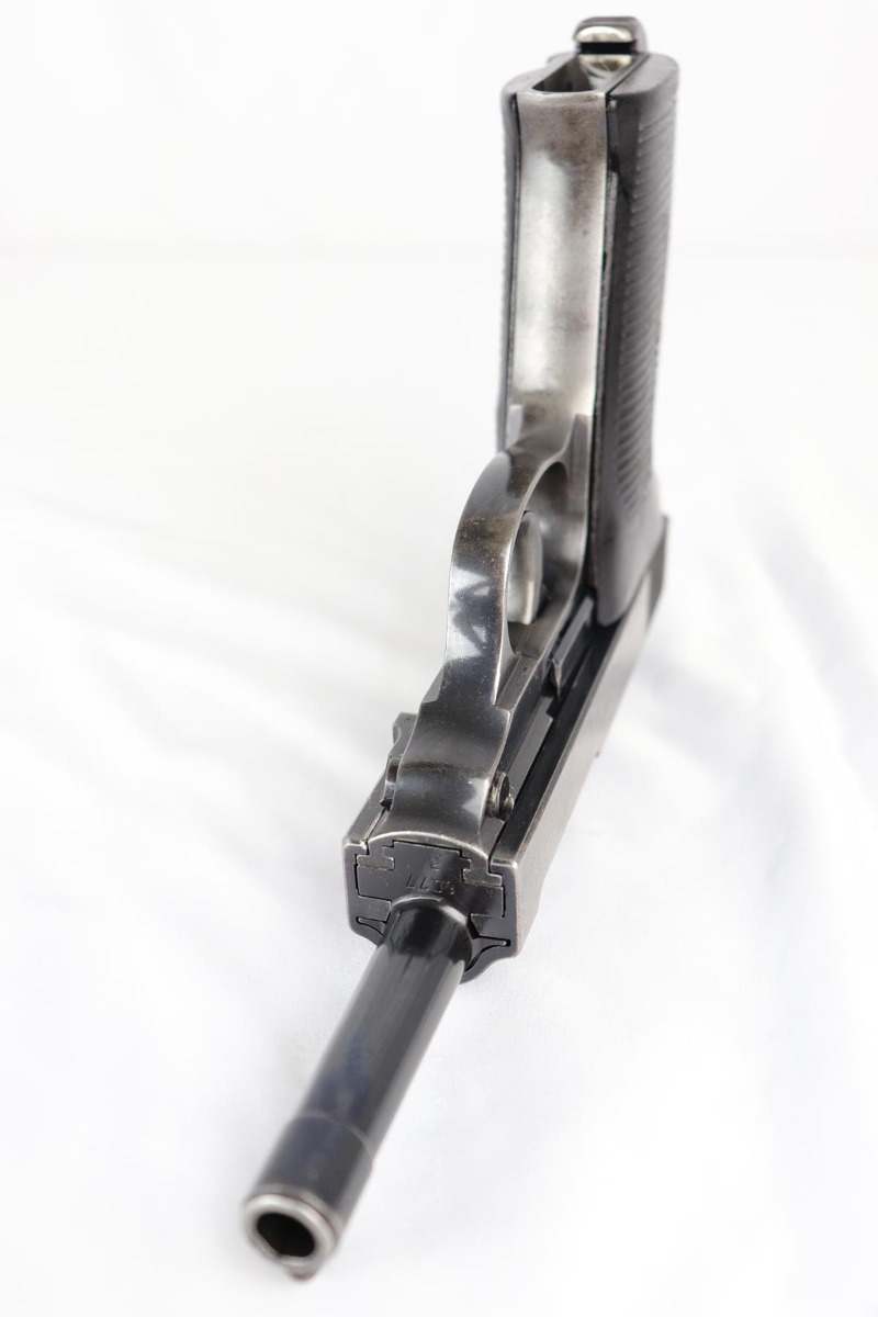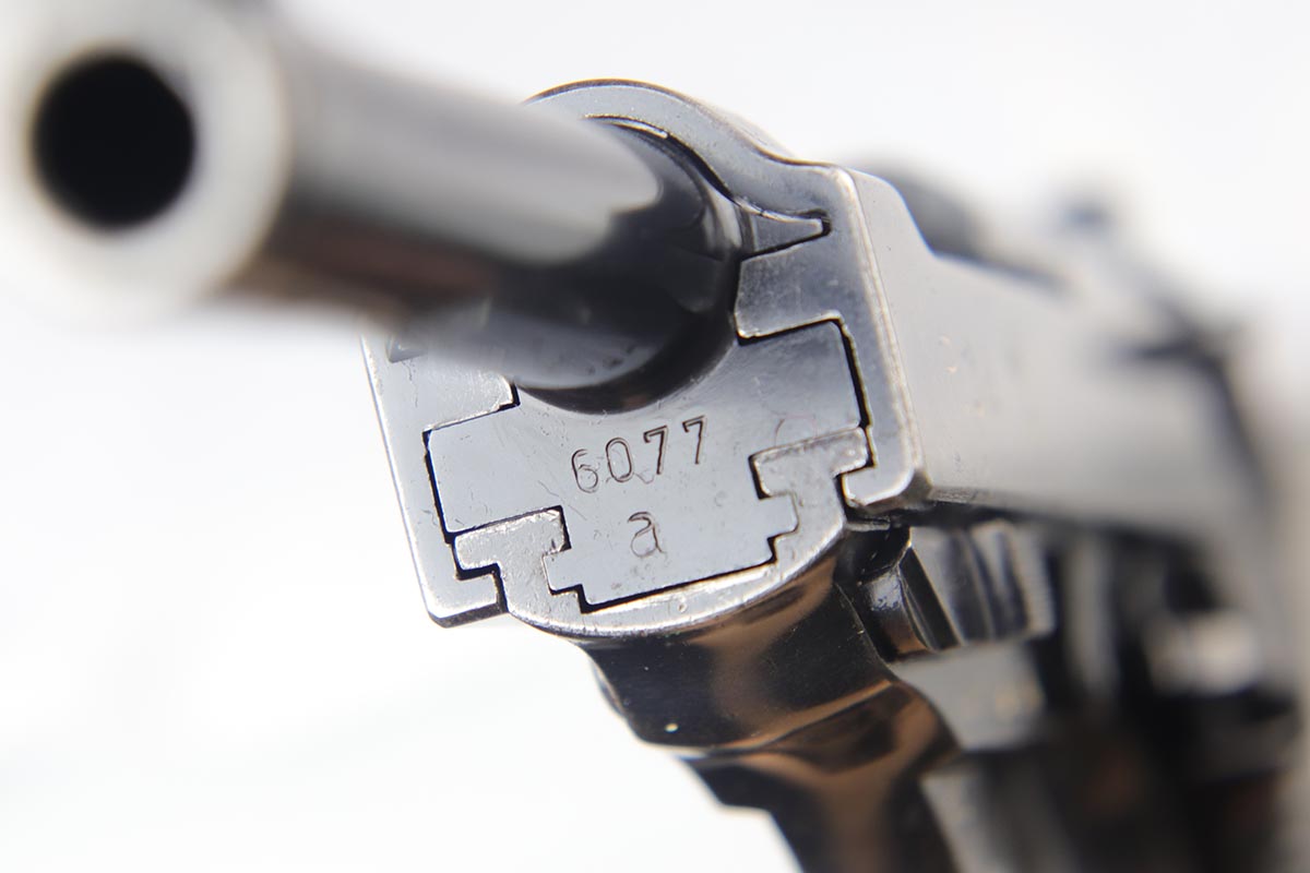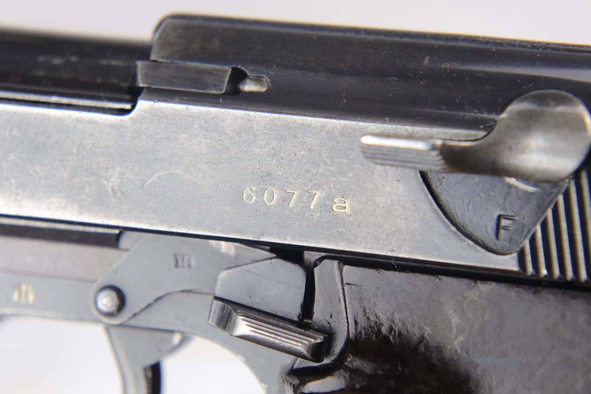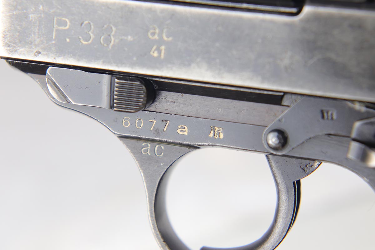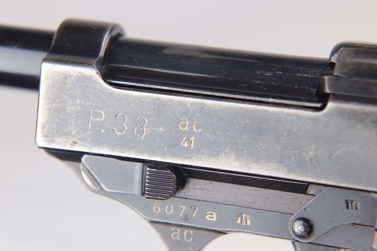 10/3/18 – This is a very rare Walther P.38 example – a first variation ‘ac 41’ with mixed acceptance proofs. This pistol is mentioned specifically by serial in Buxton’s P.38 book (volume III), as the lowest known serial for this variation. Buxton’s book states there are 185 of this variation produced, based off highest and lowest known serials. The pistol itself is all matching and original with a thin finish throughout. All small parts are properly waffen marked, and the grips are matching numbered to the gun. The right side slide shows both the standard E/359 proof, but also the seldom seen E/WaA359. While the pistol is worn, the bore is minty, showing it was well cared for.