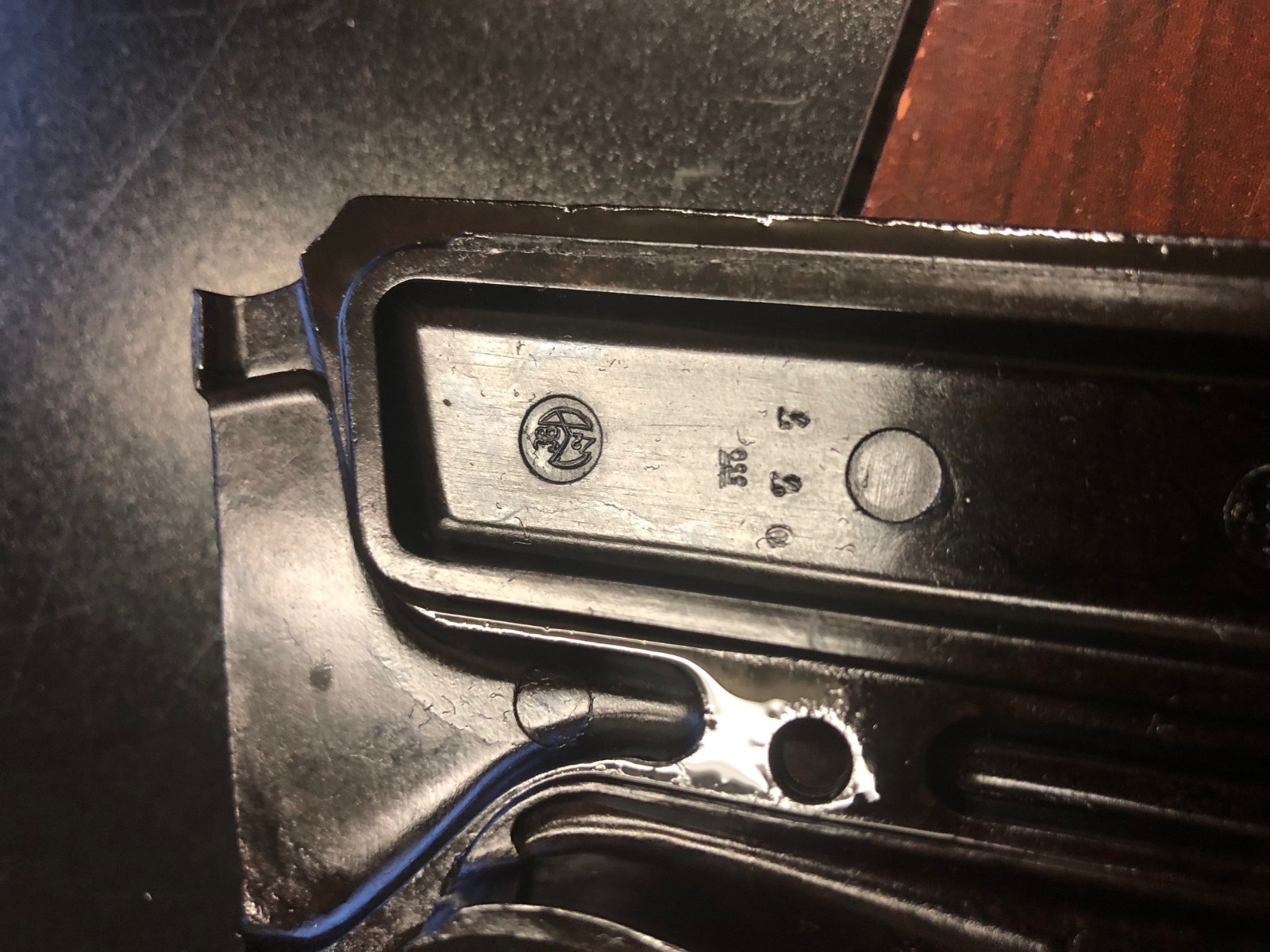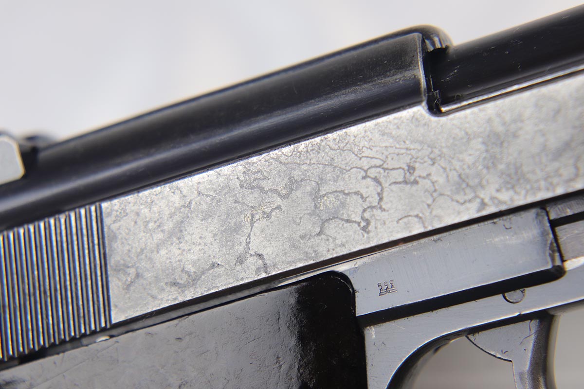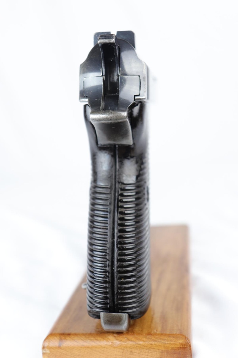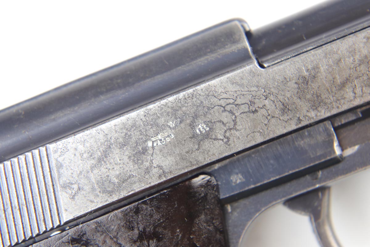 10/3/18 – This is a very rare Walther P.38 example – a first variation ‘ac 41’ with mixed acceptance proofs. This pistol is mentioned specifically by serial in Buxton’s P.38 book (volume III), as the lowest known serial for this variation. Buxton’s book states there are 185 of this variation produced, based off highest and lowest known serials. The pistol itself is all matching and original with a thin finish throughout. All small parts are properly waffen marked, and the grips are matching numbered to the gun. The right side slide shows both the standard E/359 proof, but also the seldom seen E/WaA359. While the pistol is worn, the bore is minty, showing it was well cared for.