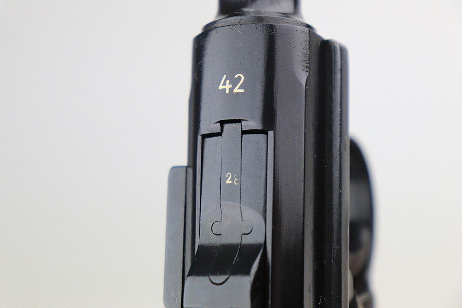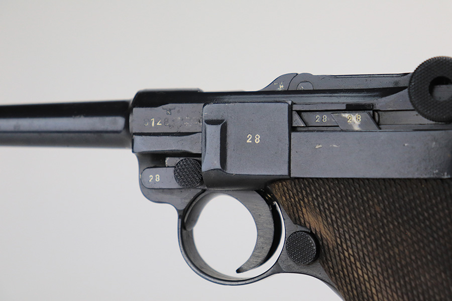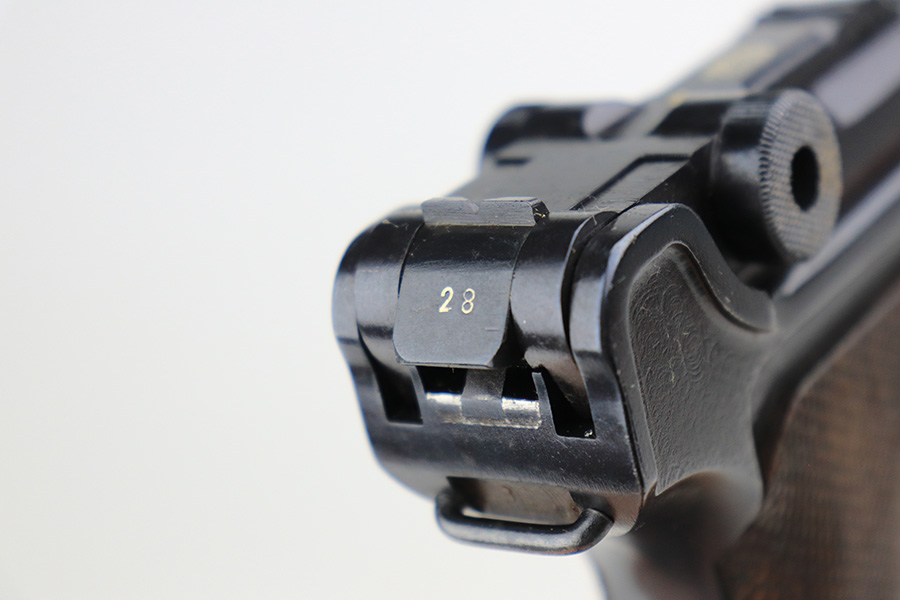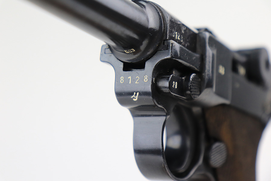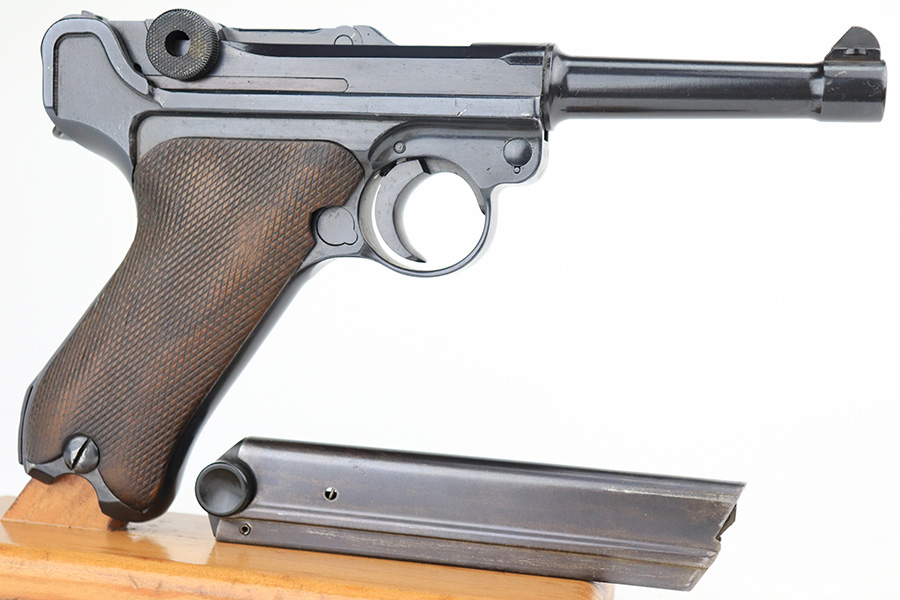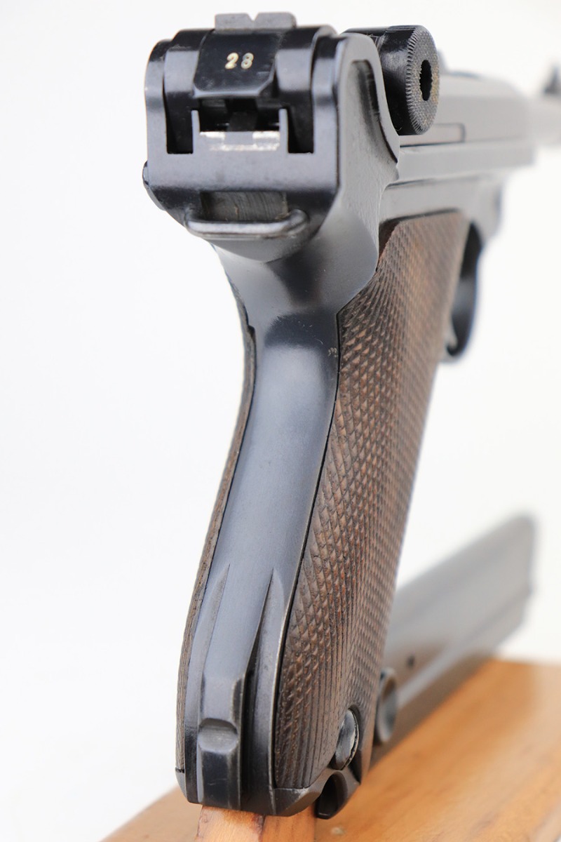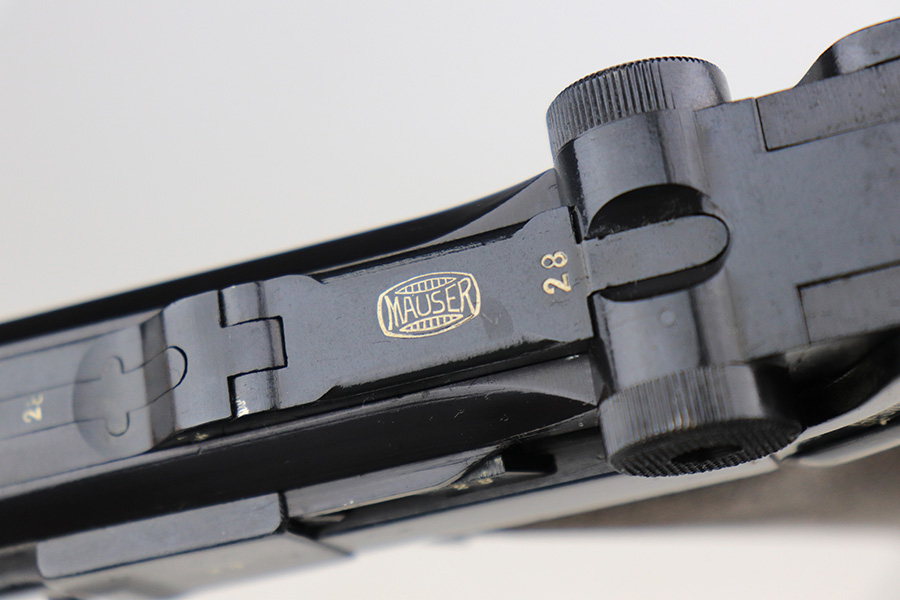 5/20/22 – This is a nice example of a rare commercial Mauser banner Luger sold in the commercial market in 1942. It is all matching and has the proper Mauser banner logo on the toggle. No military proofs. The small parts are not straw-colored, because the entire gun has been refinished. There is very little wear in its new bluing, but there is pin-pricking along the barrel and some light scratching on both grip straps. There is a small ding on the left side of the frame. Comes with wood grips that show general wear in the checkering. Also comes with a post-war plastic-bottom magazine. The bore has strong rifling with minor frosting in the grooves.