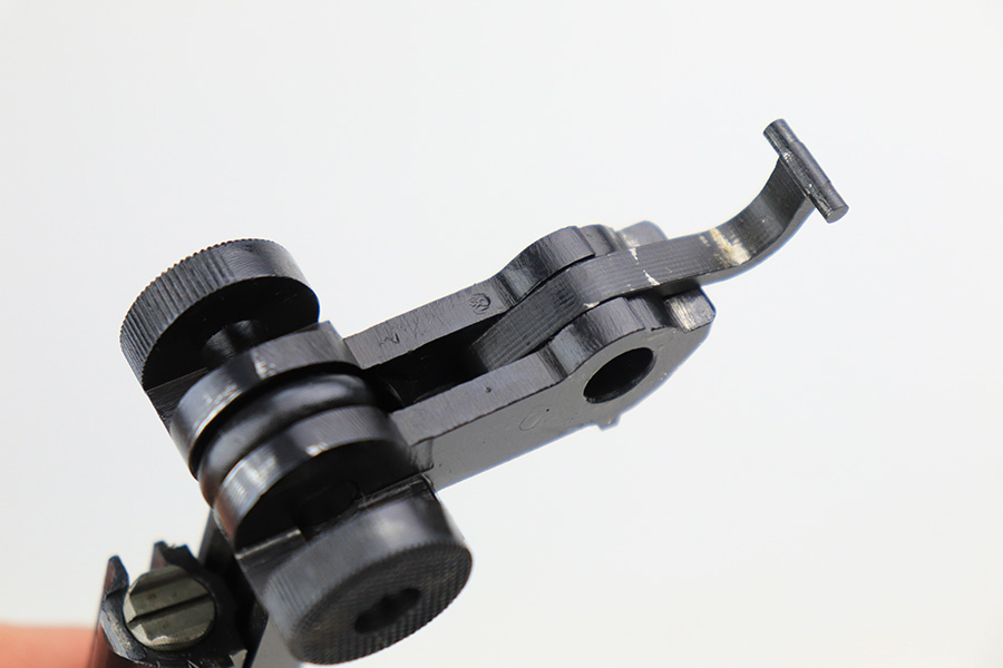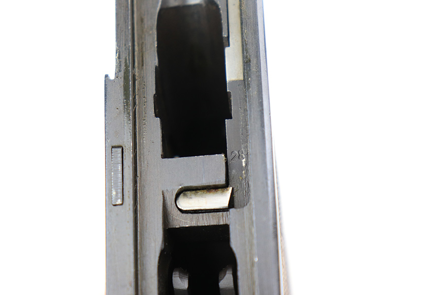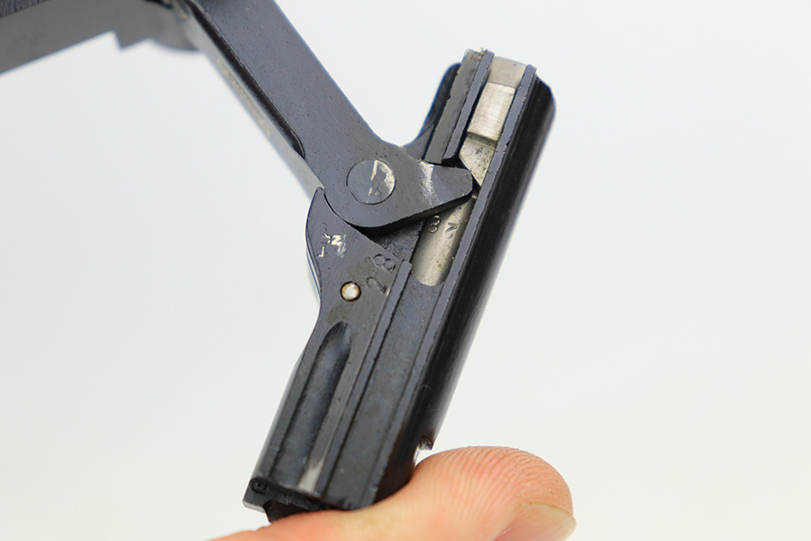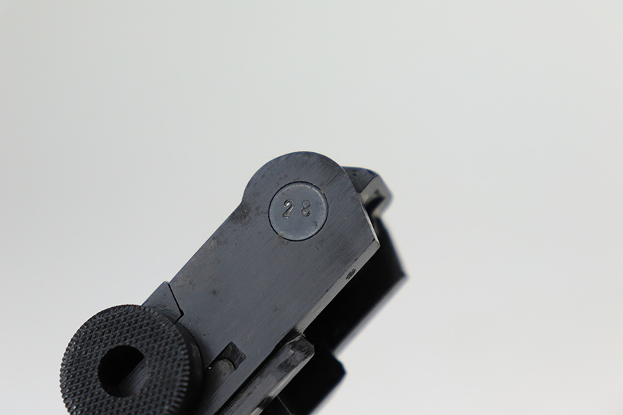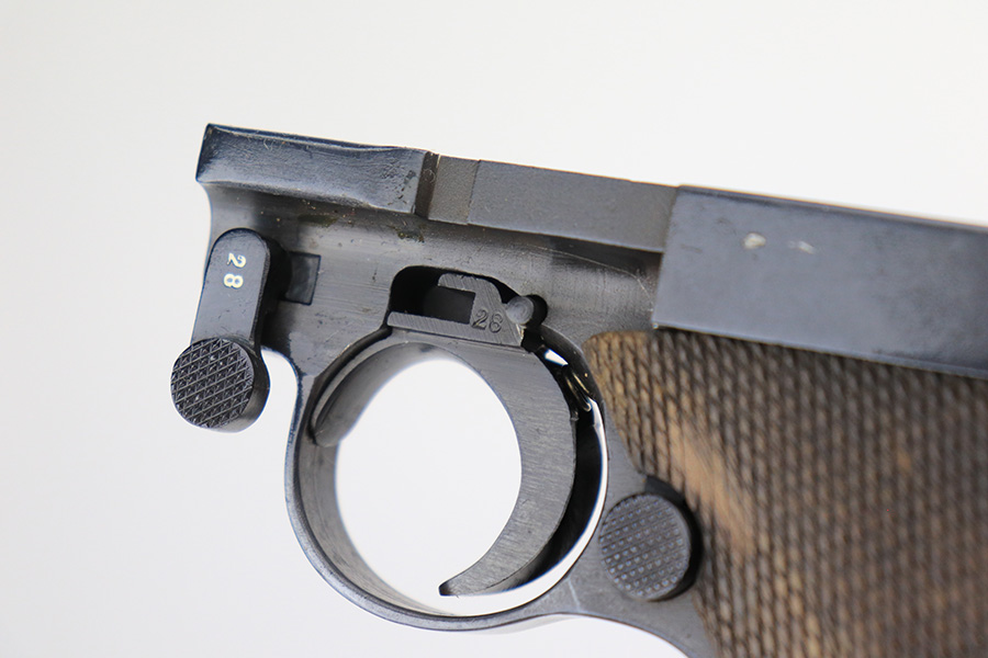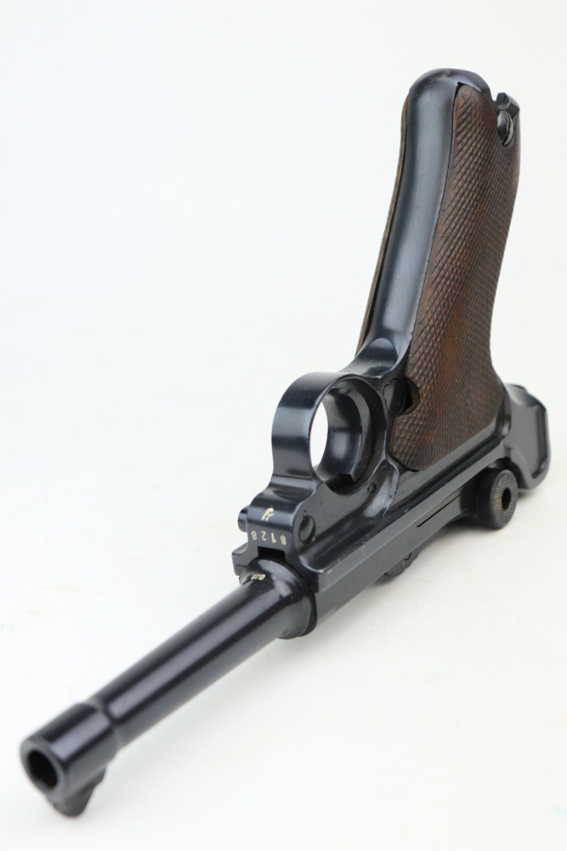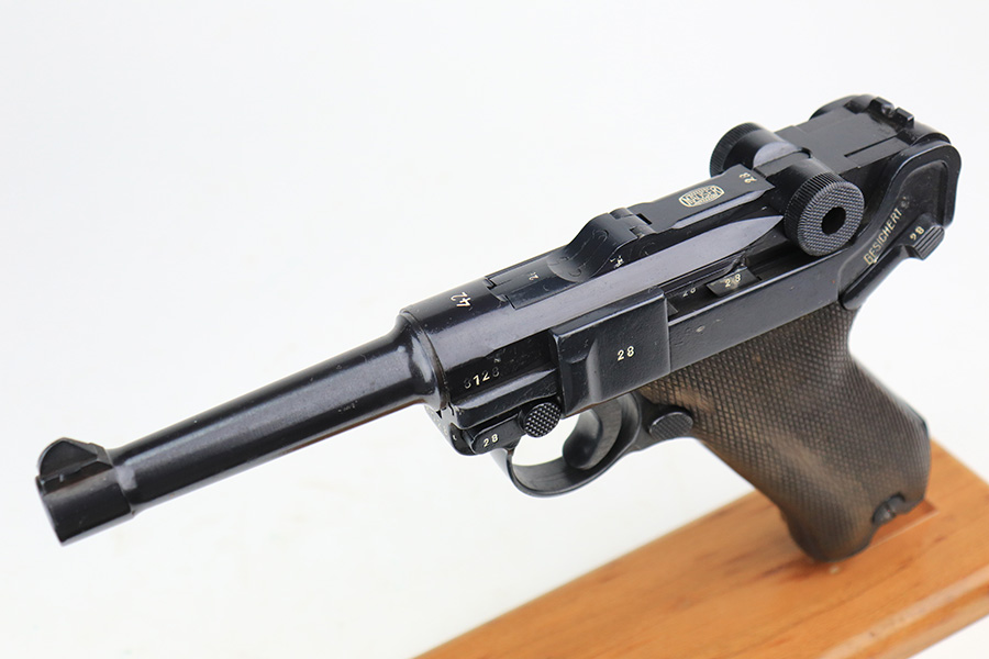 5/20/22 – This is a nice example of a rare commercial Mauser banner Luger sold in the commercial market in 1942. It is all matching and has the proper Mauser banner logo on the toggle. No military proofs. The small parts are not straw-colored, because the entire gun has been refinished. There is very little wear in its new bluing, but there is pin-pricking along the barrel and some light scratching on both grip straps. There is a small ding on the left side of the frame. Comes with wood grips that show general wear in the checkering. Also comes with a post-war plastic-bottom magazine. The bore has strong rifling with minor frosting in the grooves.