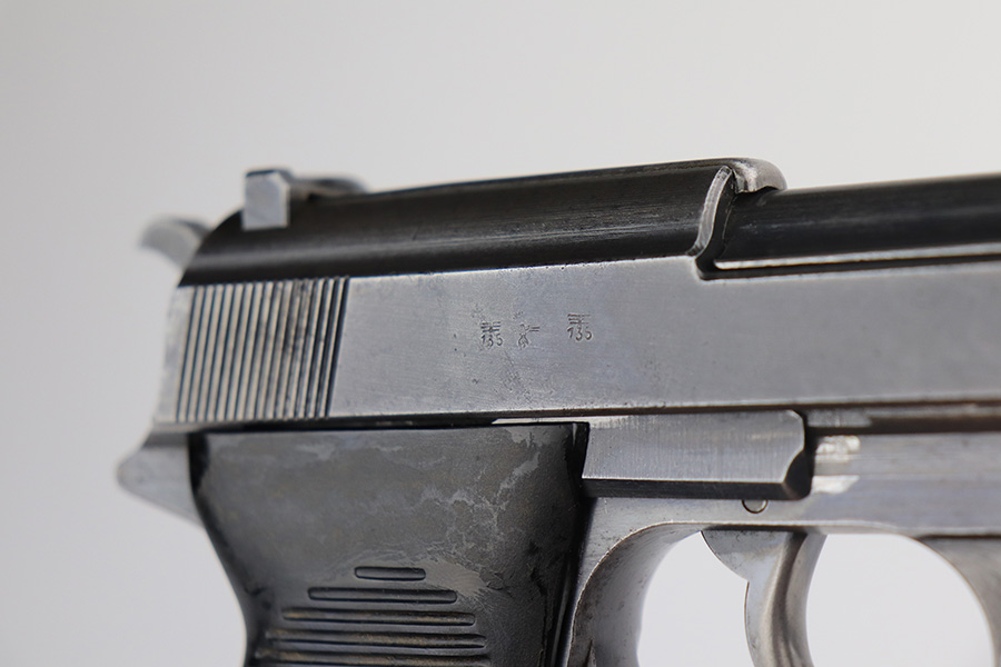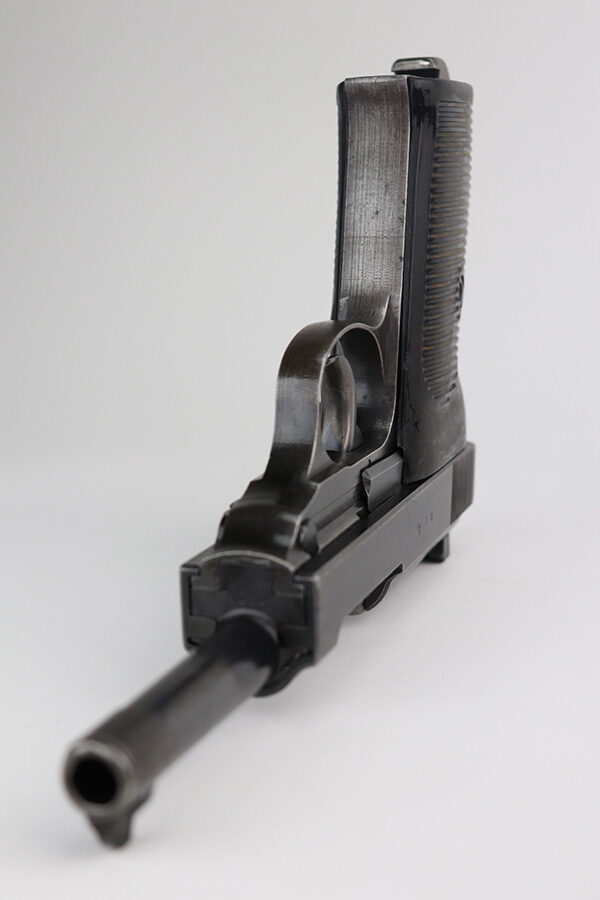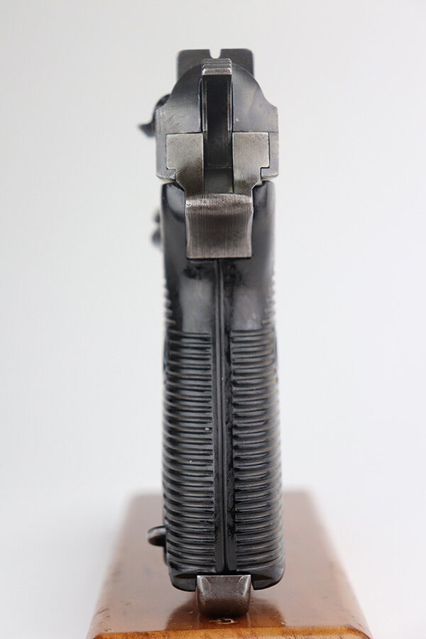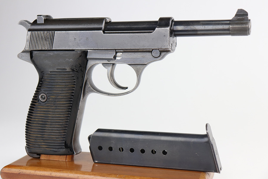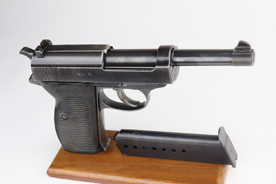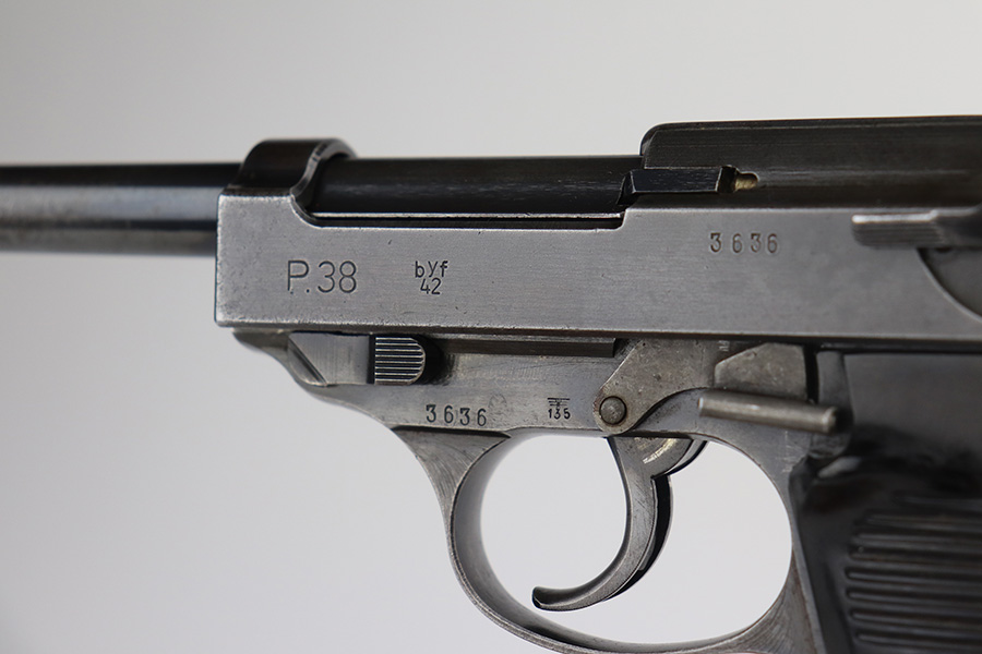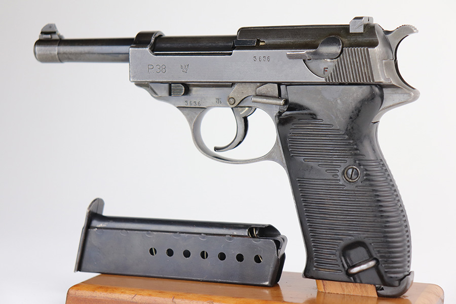 6/15/21 – This is a nice example of a rare Mauser P.38 issued to the Nazi military in 1942. It is a first-year Mauser production, where only 19,000 of these were made, making it only slightly more common than the zero series or Nazi-marked svw 45’s. This one is matching, but has a replaced later-variation slide stop. It has the correct “Eagle 135” military proofs and a dusty-blue finish. It has retained somewhere between 85-90% of this variation. Most of the finish loss is on the front strap, but there is also minor wear on the high edges of the slide and around the muzzle. Tiny dots of oxidation throughout. Comes with excellent grips and a period-correct Walther magazine. The bore has decent rifling with pin-pricking throughout. De-cocker is functional.