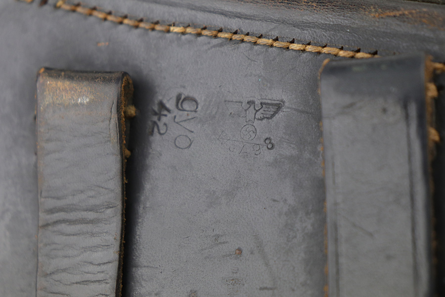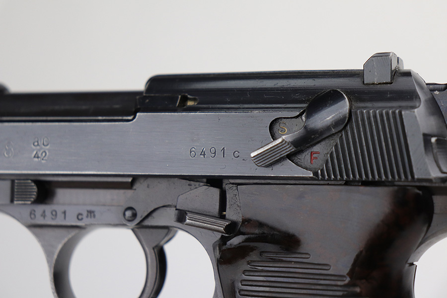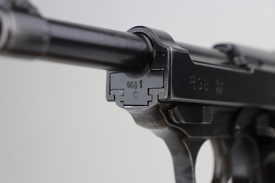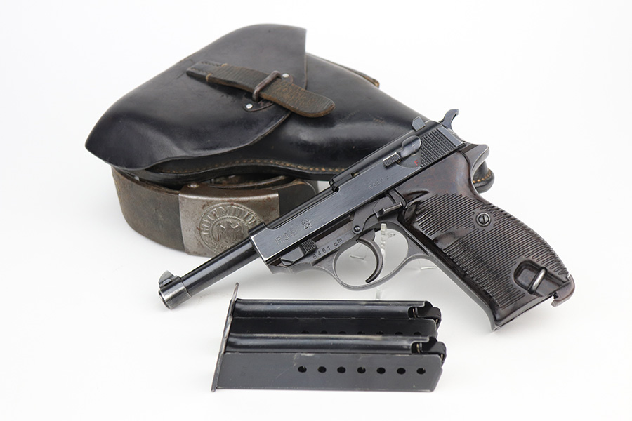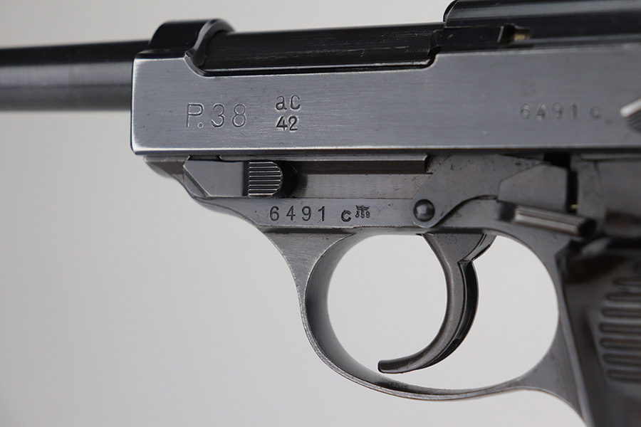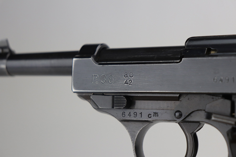 10/19/21 – This is a hard-to-find 1942 Nazi Walther P.38 with both of its original, matching magazines. It’s significantly less common to find an ‘ac 42’ with both magazines than an ‘ac 41’ as magazines were only numbered for the first few months (middle of the d-block). This example is all matching and original with about 94% of the original military blue remaining. Standard holster wear on the high edges of slide and muzzle, and minor thinning along front strap and underside of frame. Minty bore and grips. Rig includes an original 1942 hardshell holster that is ‘gyo’ maker marked. It’s also accompanied by the original belt and Gott Mit Uns buckle.