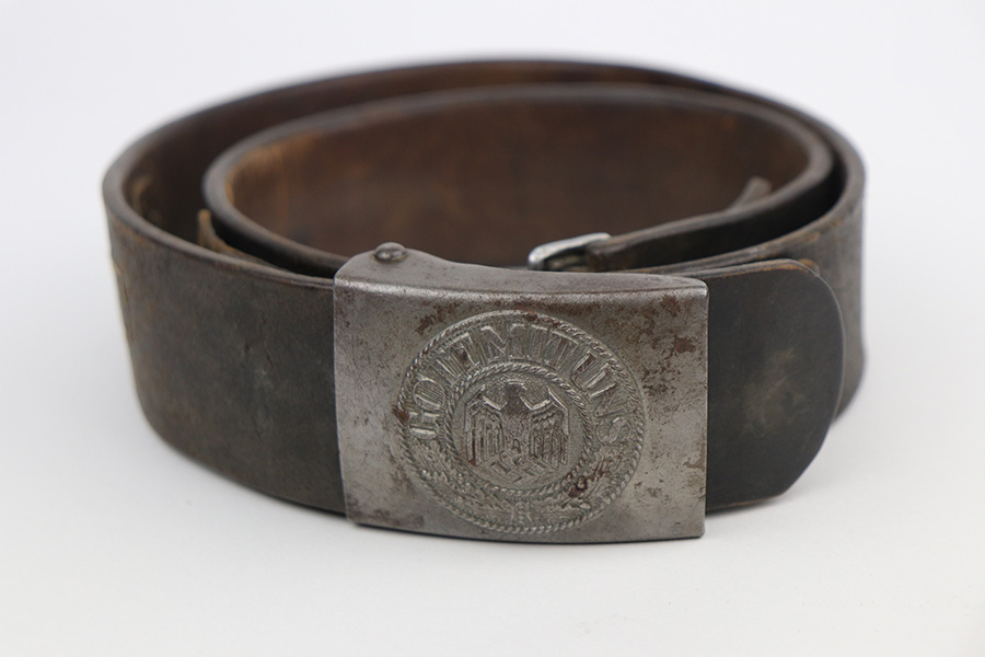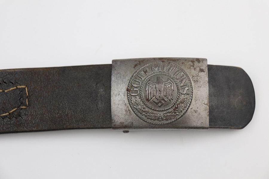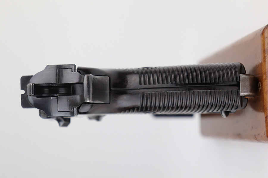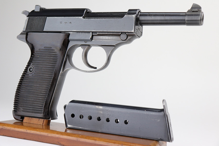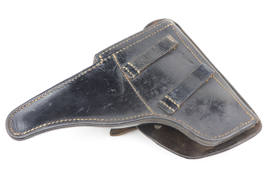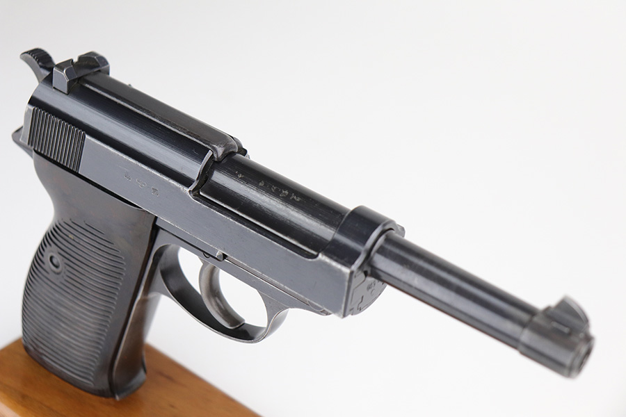 10/19/21 – This is a hard-to-find 1942 Nazi Walther P.38 with both of its original, matching magazines. It’s significantly less common to find an ‘ac 42’ with both magazines than an ‘ac 41’ as magazines were only numbered for the first few months (middle of the d-block). This example is all matching and original with about 94% of the original military blue remaining. Standard holster wear on the high edges of slide and muzzle, and minor thinning along front strap and underside of frame. Minty bore and grips. Rig includes an original 1942 hardshell holster that is ‘gyo’ maker marked. It’s also accompanied by the original belt and Gott Mit Uns buckle.