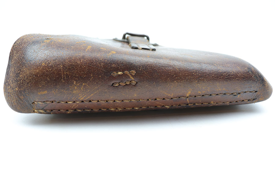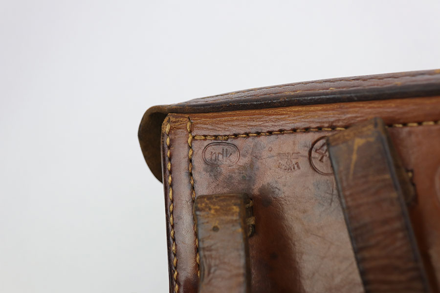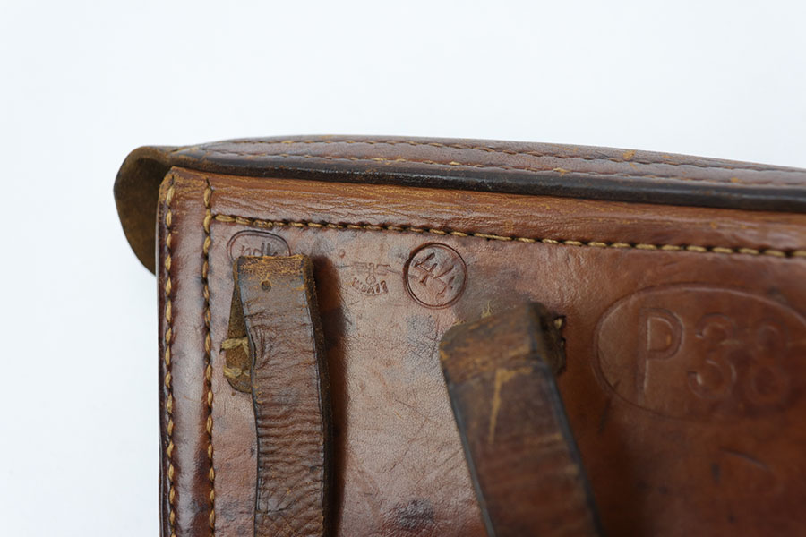 11/27/20 – This is an original, rare variation 1944 hardshell P.38 holster. The holster has brown leather and is speculated to have been made by slave-labor at the end of the war. Very desirable variation due to scarcity and history. The brown leather is soft and pliable but completely in tact with some light wrinkling and surface scuffing. These are often found in much worse condition. The stitching is all original and in tact. The back leather is maker stamped, dated, waffen stamped and P.38 stamped.