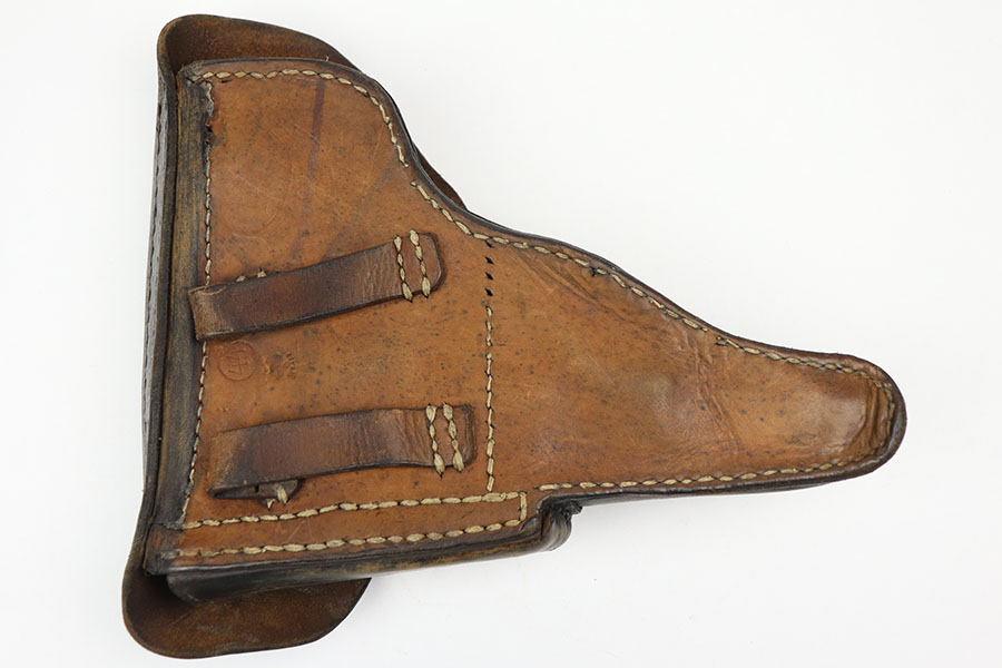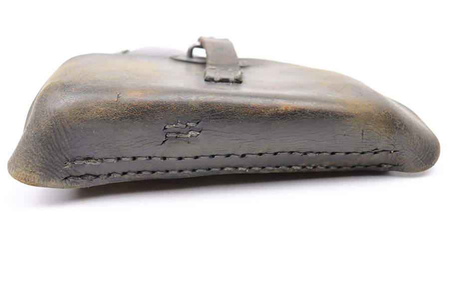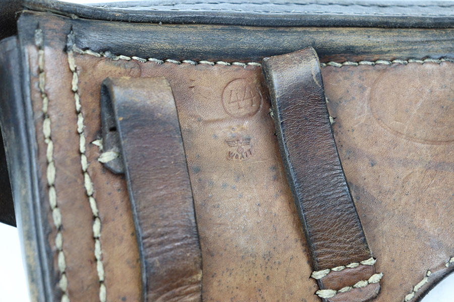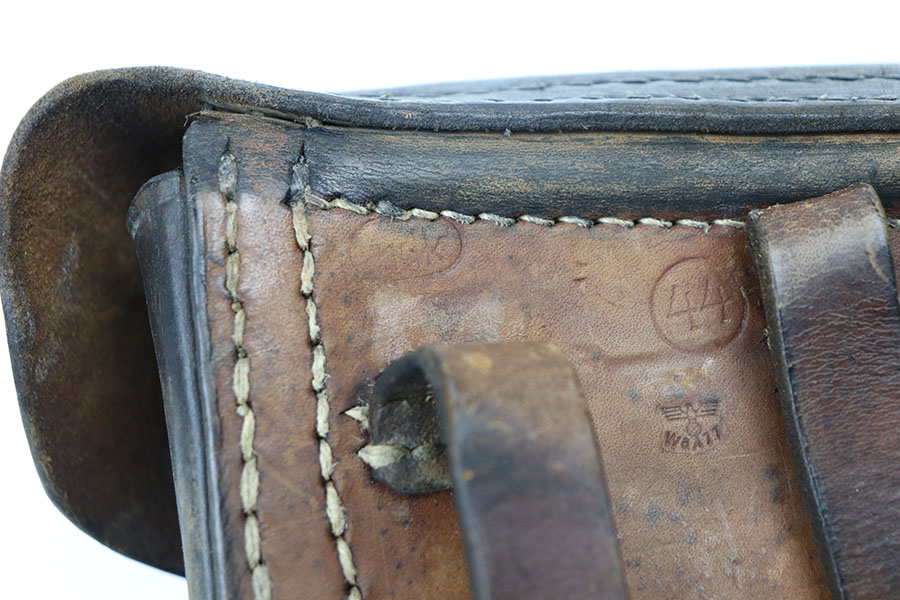 4/7/21 – This is an uncommon 1944 dated hardshell style P.38 holster. Most 1944 P.38 holsters are found in softshell style, and hardshell holsters are typically worn. This holster shows mild wear throughout and has very pliable leather showing sings of clear use. The leather is still in tact as is the stitching. The back leather is a lighter brown color, likely because a lot of these holsters were made from scrap leather. Maker stamped “ndk” and “44” dated with a waffen military proof.