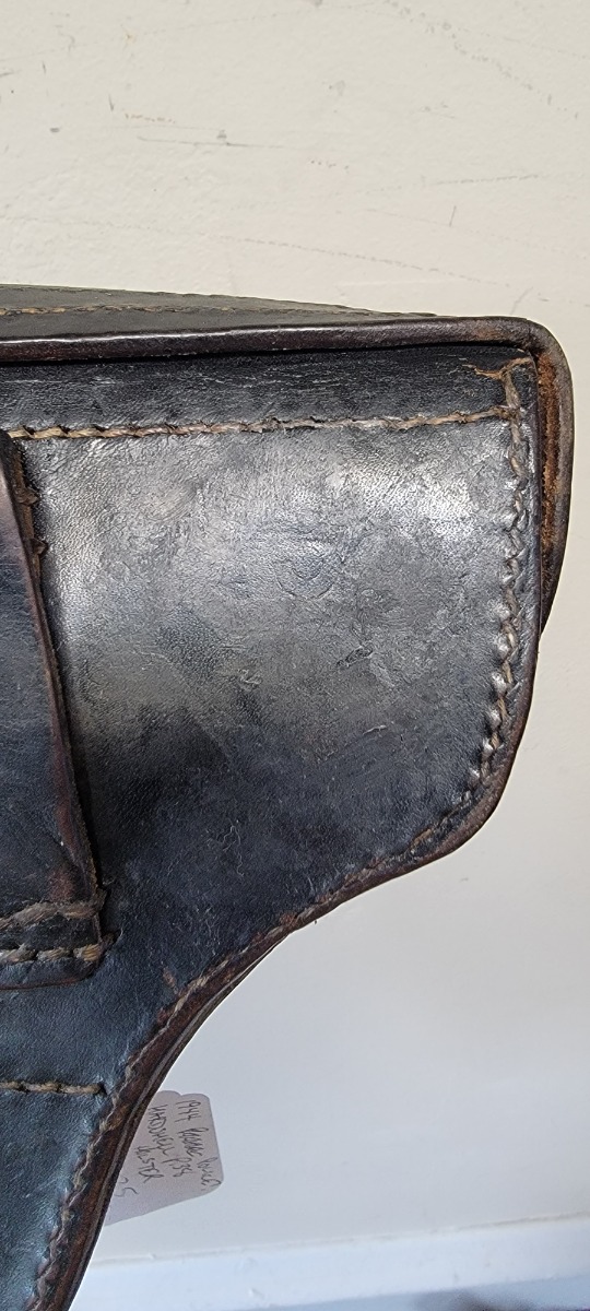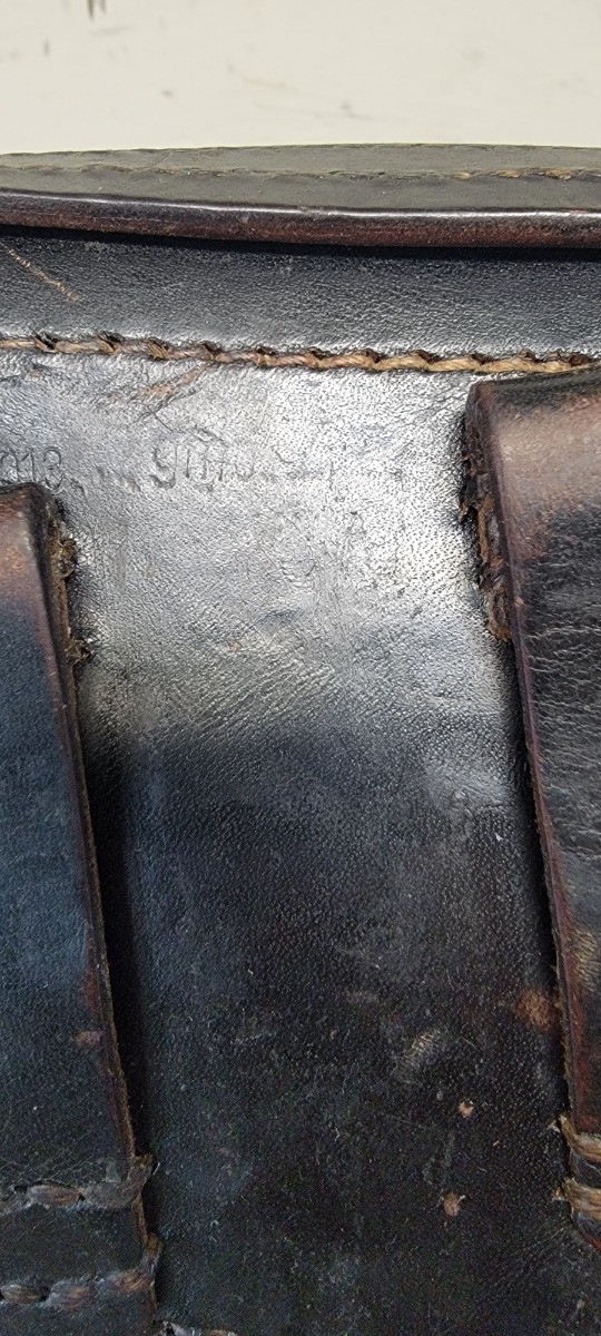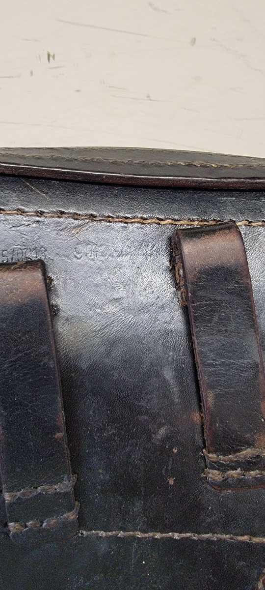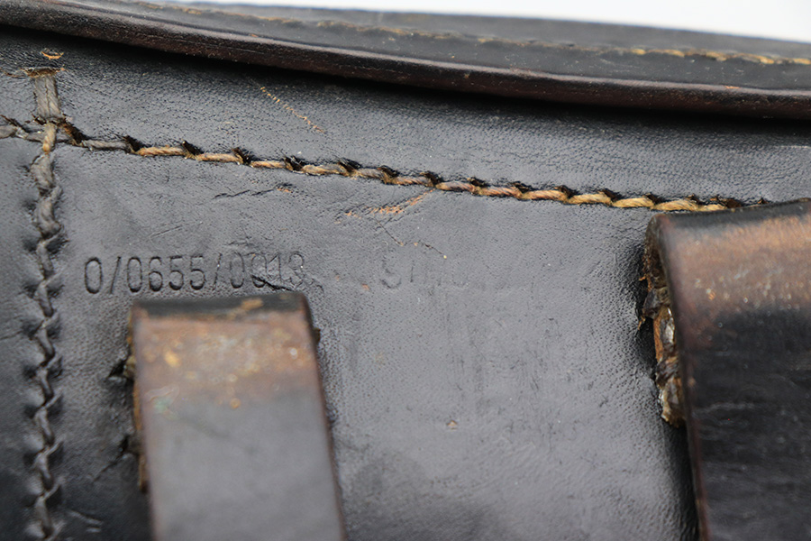 5/24/22 – This is a rare variation 1944 dated hard shell style P.38 holster from the end of WW2. The holster has a faint “gmo” maker stamp and “44” date code. Under this stamp is a very faint waffen eagle military proof stamp. To the right of the belt loops is the typical P.38 stamp, barely visible. Just above the left belt loop is a strong, distinct series of number stamps 0/0655/0013 as shown. These numbers were part of a later wartime coding system that collectors speculate retains to district numbers or sorting facilities. The holster is in good overall condition with treated leather that shows some mild scuffing and surface wear, but holds nice shape and has normal pliability throughout. No notable stitching issues.