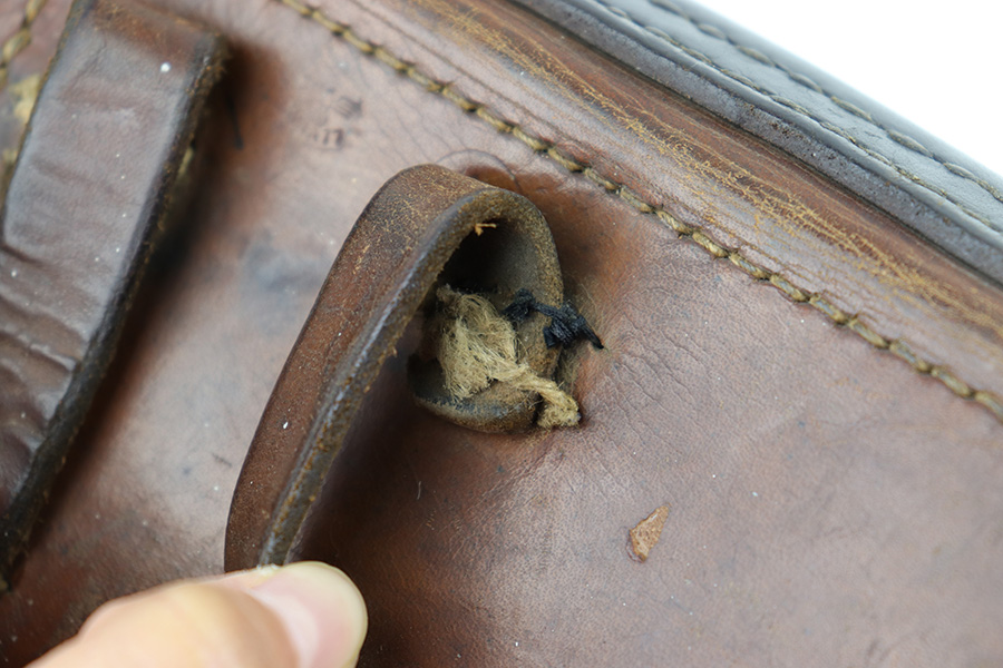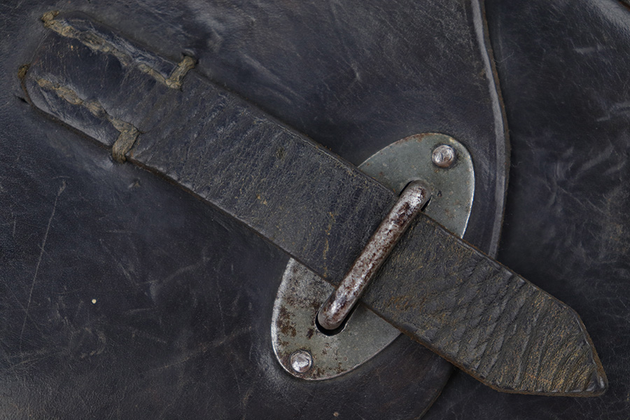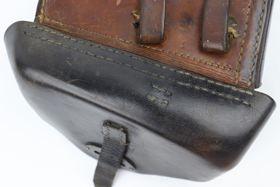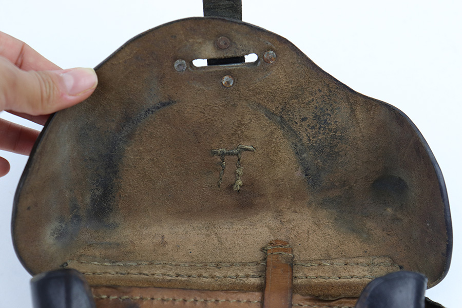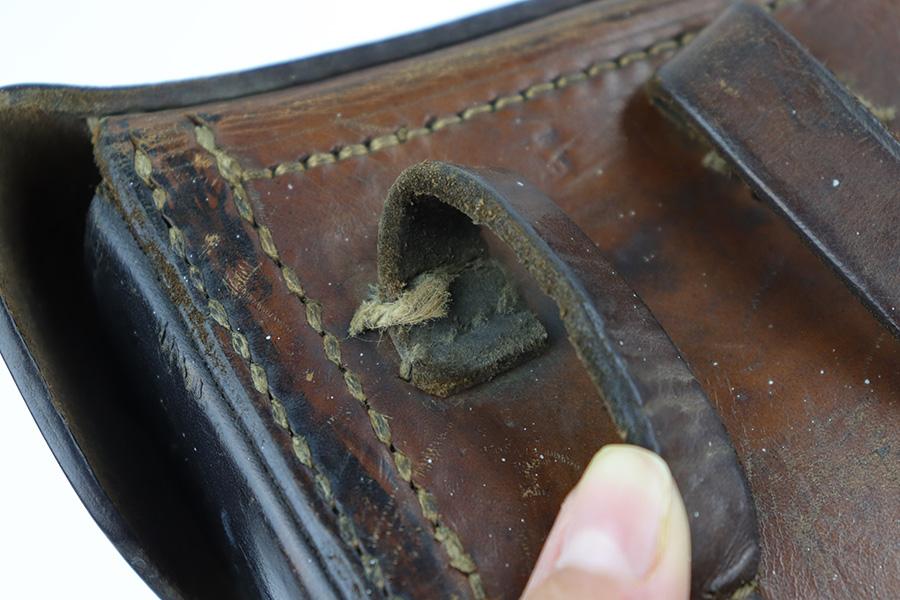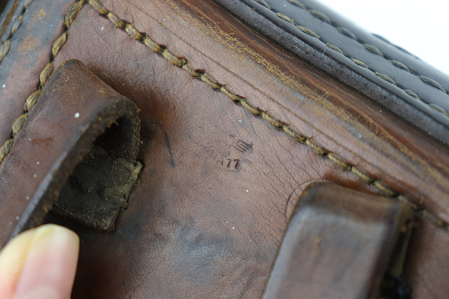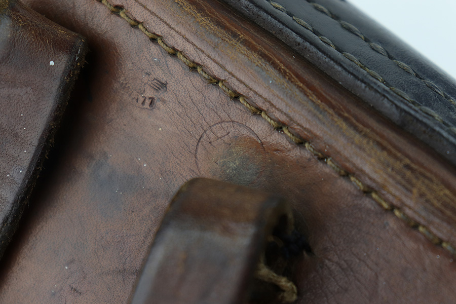 7/17/23 – This is an original, rare variation 1944 hard shell P.38 holster. The holster is rare not only for the date (most 1944 holsters were soft shell style), but also because of the WaA77 proof stamp, which is a military proof out of Poland. The thin and pliable leather is another telltale characteristic of these Polish made holsters, as many speculate these were made under slave labor. The back of the holster is waffen proof stamped, and stamped with a “4” within a circle. This style of date stamp is found on other “ndk” made examples. The leather is soft and pliable but completely intact with normal use wear. The stitching is all original except for the upper portion of the right belt loop – this is replaced stitching. Great condition and a rare example!