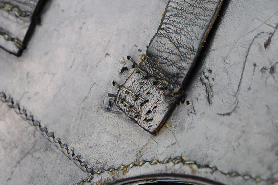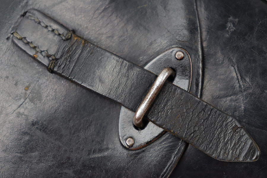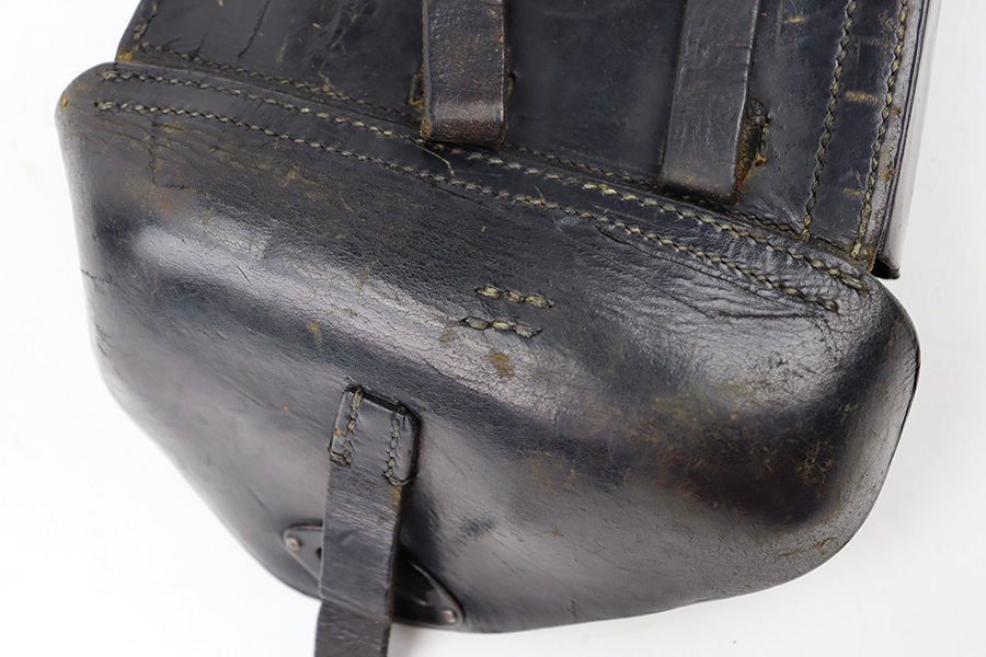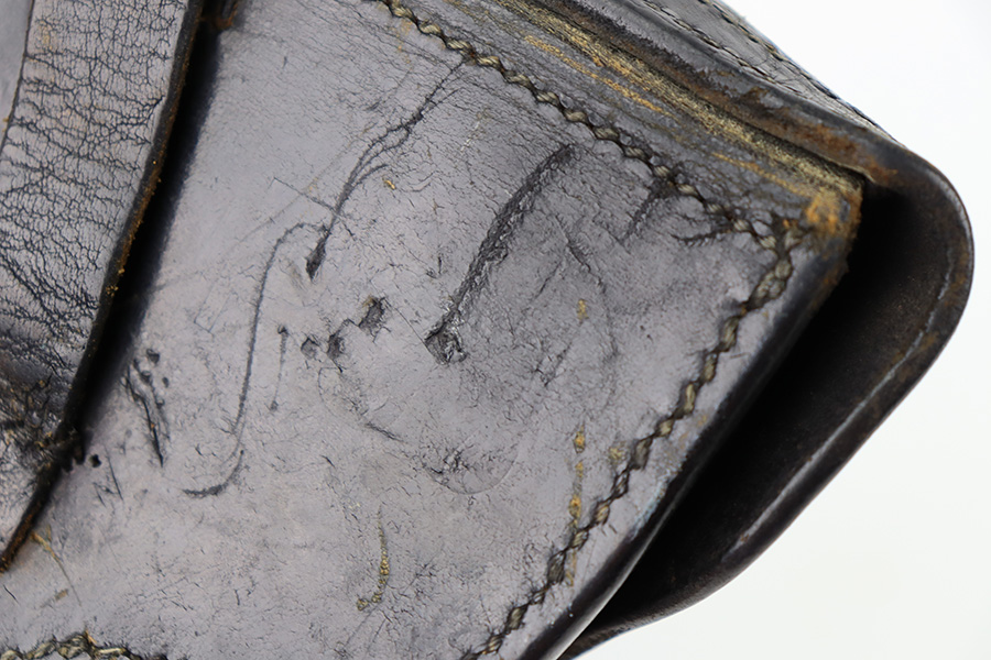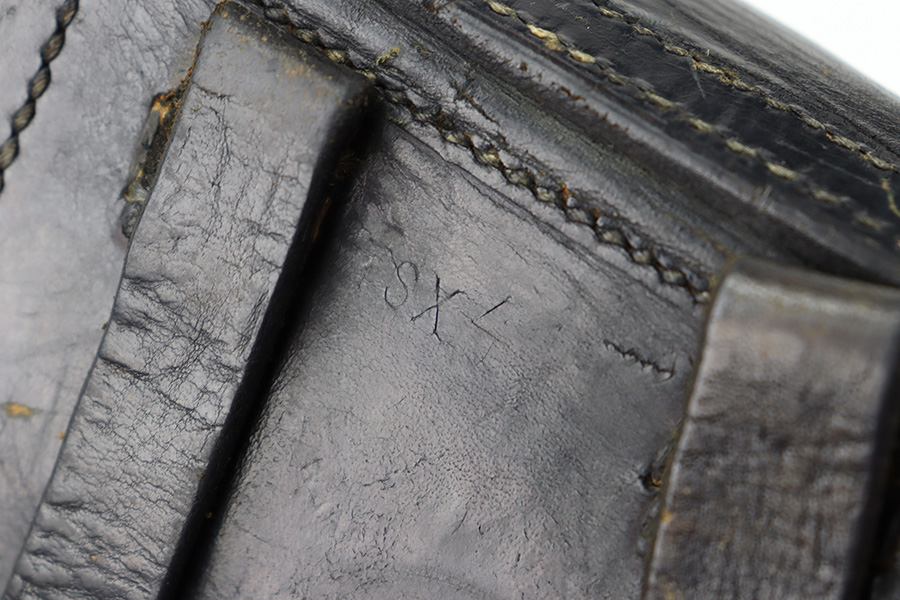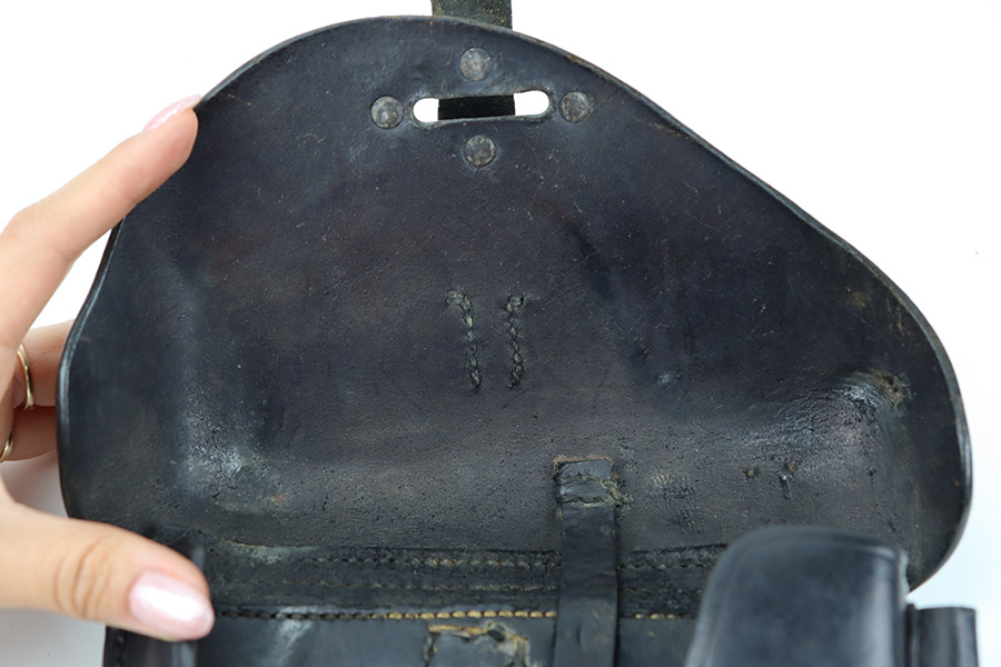 12/18/23 – This is a rare variation 1944 dated hard shell style P.38 holster. The holster is in great condition but the interior leather appears to have been dyed black, and one of the back belt loops has been re-stitched / repaired, as shown. Price reduced accordingly. These are desirable and highly collectible as most 1944 P.38 holsters were made in soft shell style. The back leather is maker and date stamped, though faint these are still visible. There’s also a faint waffen proof and a P.38 stamp. Normal pliability and light surface wear throughout.