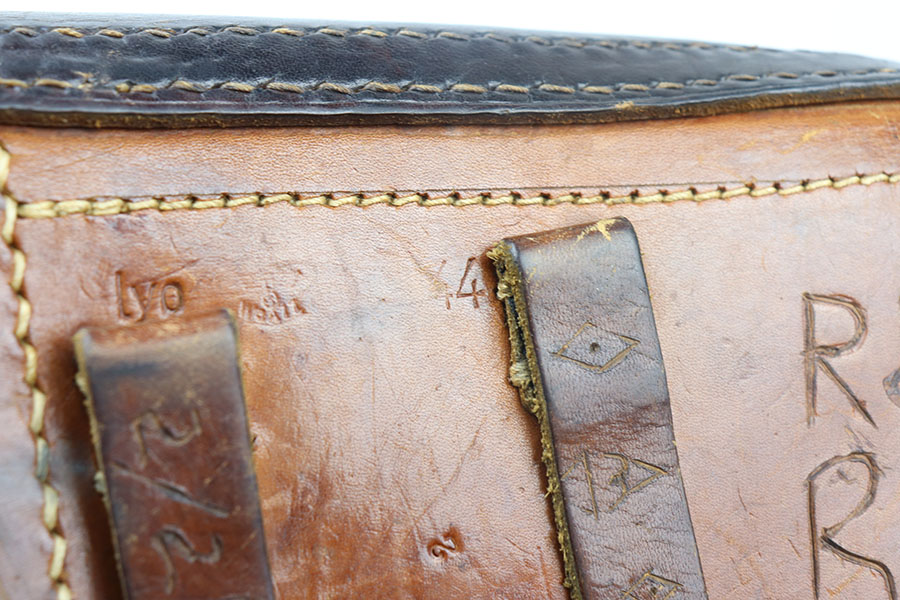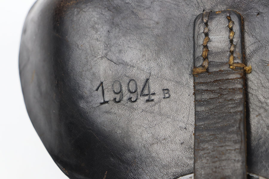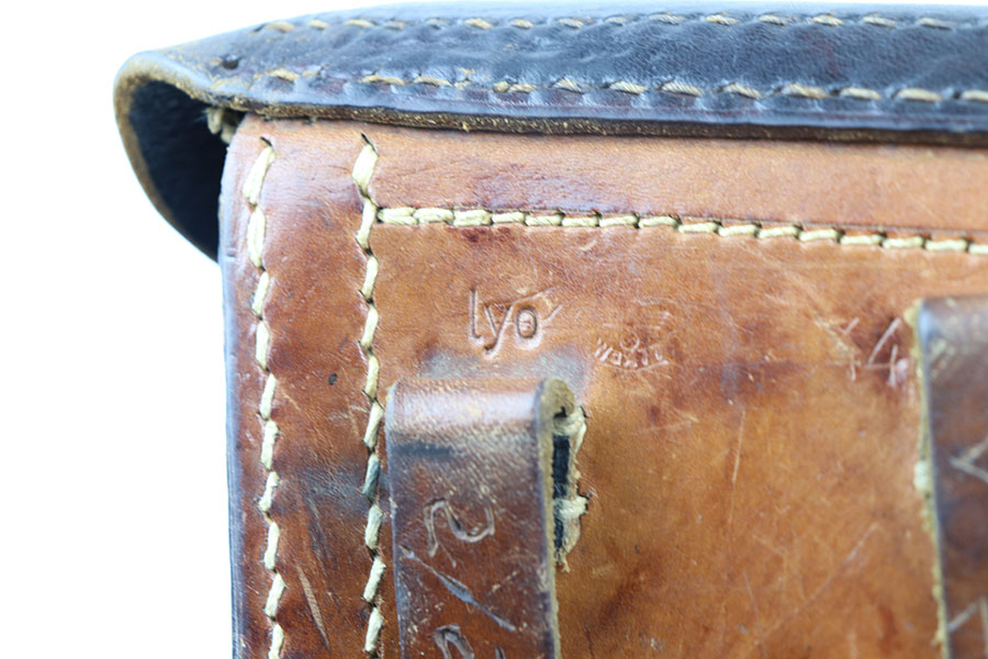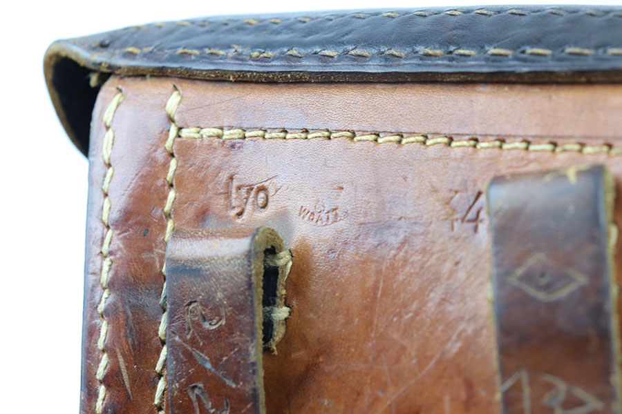 6/14/21 – This is a rare variation 1944 dated P.38 hardshell style holster. The holster is “lyo” maker stamped, which is a stamp associated with a work camp in Poland during WW2. Made from scrap leather and often found in very poor condition with multi colored pieces of leather. The back leather is maker stamped, dated, and waffen proof stamped. Unfortunately there are a few issues with this holster. First is the initials and date scratched into the back leather and numbers stamped into the front leather. Second, the left belt loop is not attached at the base – see photos. Third, there is surface cracking on the magazine pouch. Overall intact however, and a rare find at a reasonable price.