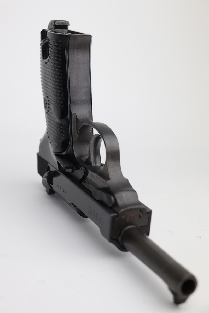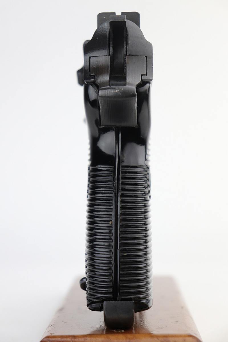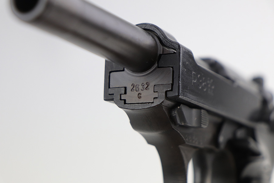 12/21/22 – This is an excellent example of a rare Mauser P.38 issued to the Nazi military in 1944. It is all matching and has the proper “Waffen 135” military acceptance proofs. This one is rare because it has a rare FN-made slide. The finish looks dark, so believe it has been professionally restored. It has retained virtually all of its finish with very minor handling marks/light scratches here and there. It comes with excellent grips and a period original but unmarked magazine. The bore is shiny with very strong rifling with areas of very minor freckling in some of the grooves. De-cocker is functional. NOTE: The magazine shown in the photos is not the one included with the listing. It was replaced with an unmarked magazine that does show some corrosion on the spine.