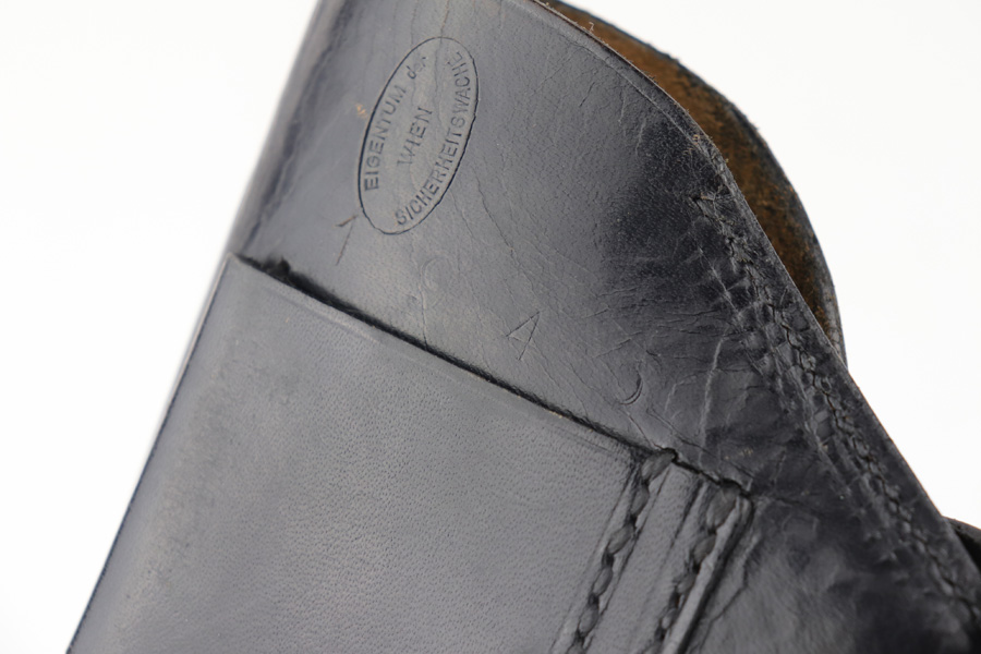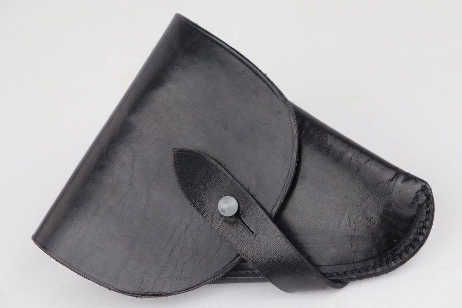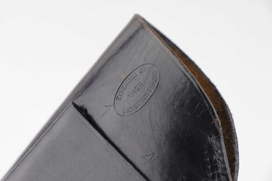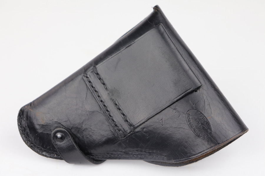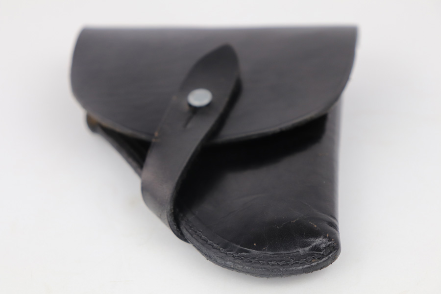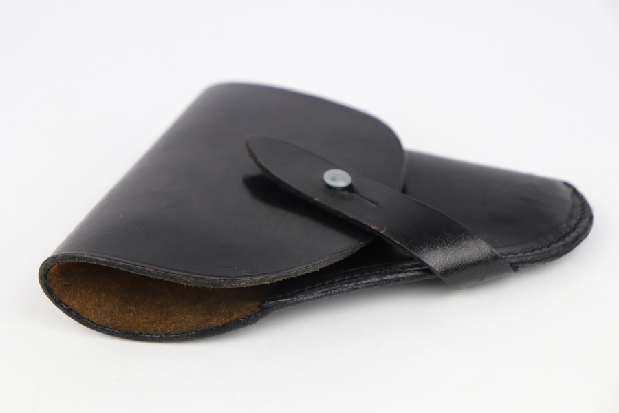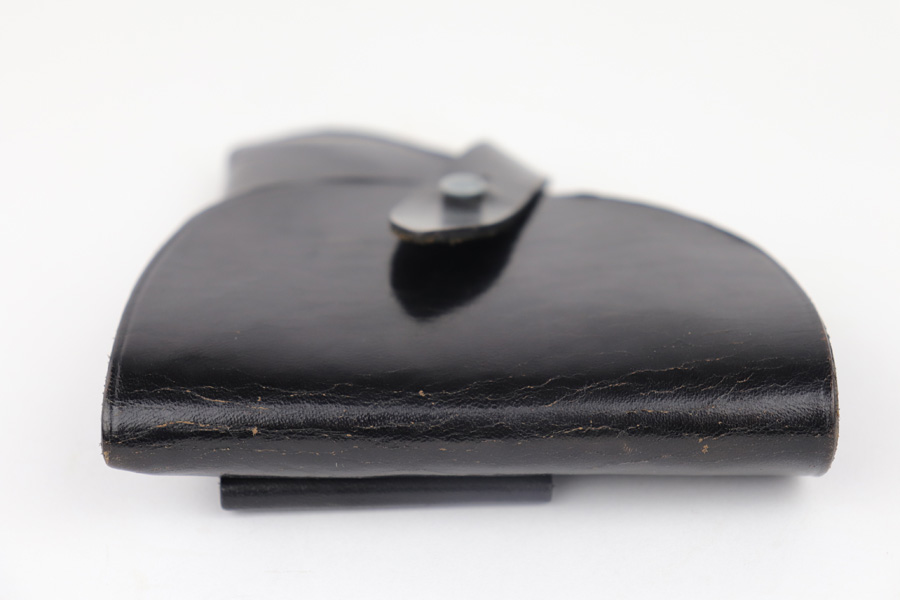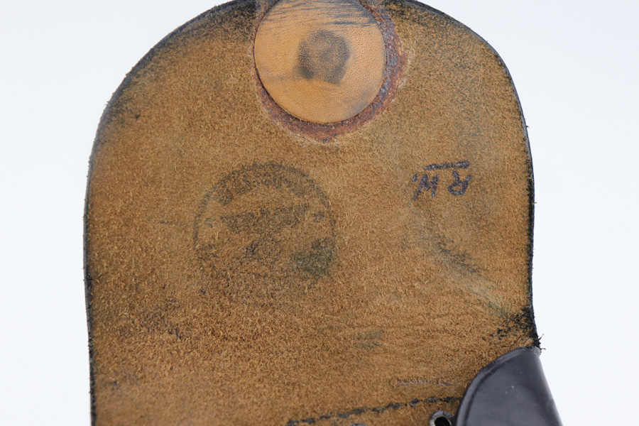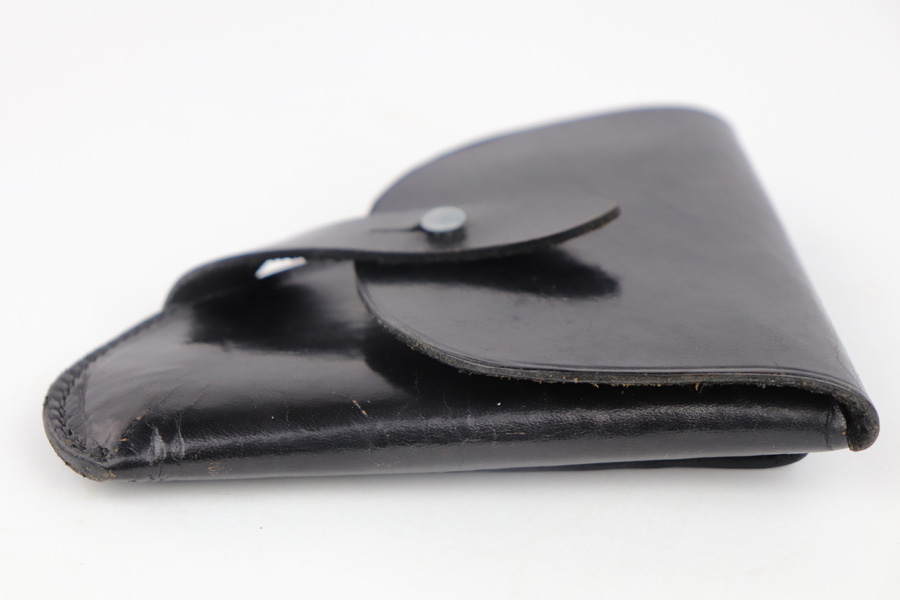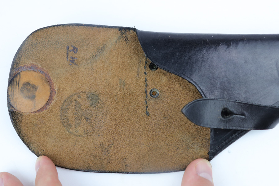 7/22/19 – We have what appears to be a very rare, end-of-war Walther model 9 holster. The holster is maker stamped on the back leather with a faint “1945” date stamp running sideways up the holster near the belt loop. The interior leather has faint nazi military ink stamps. The leather is excellent and appears all original, as does the stitching.