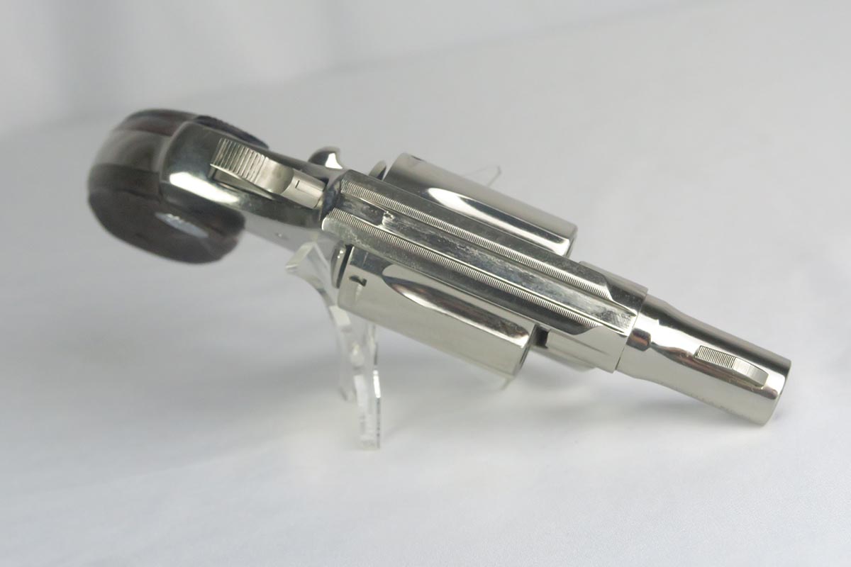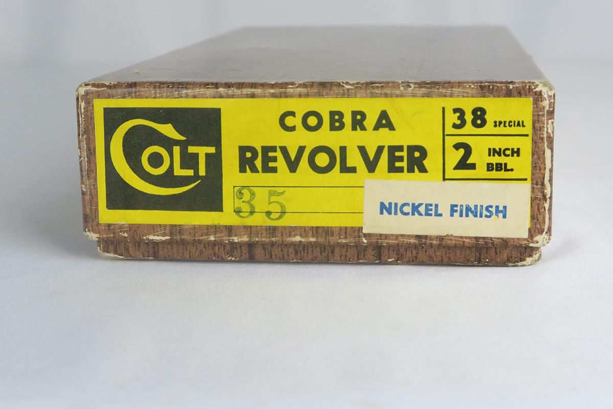 2/12/18 – This is a mint, “as new in the box” Colt Cobra lightweight revolver made in 1965.  It has a rare nickel finish, and very few Cobra revolvers were factory nickeled.  This particular gun shows no visible wear, and has an excellent bore and grips. It comes with an original box, serial numbered to the gun.  The Cobra revolver was a light weight version of the Colt Detective revolver and had an aluminum frame. It was first introduced in the late 1950s and became a very popular carry and back-up law enforcement gun.  A great boxed example of rare nickel finish gun that would be impossible to upgrade.