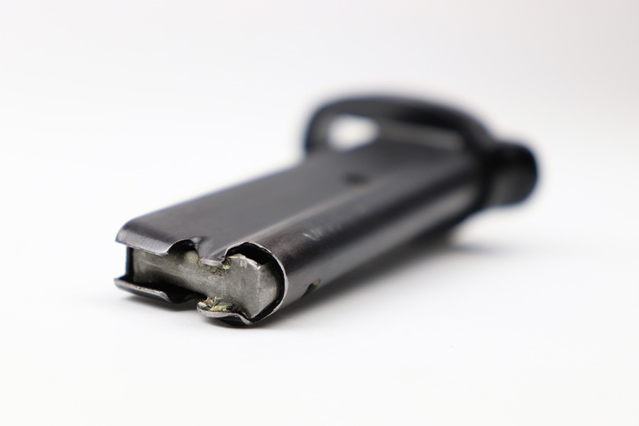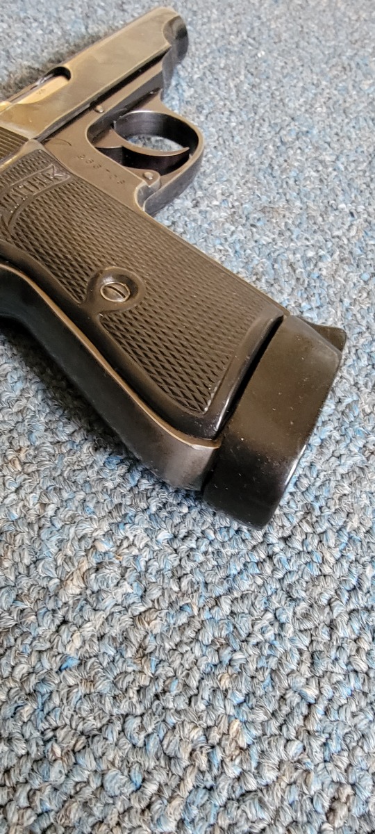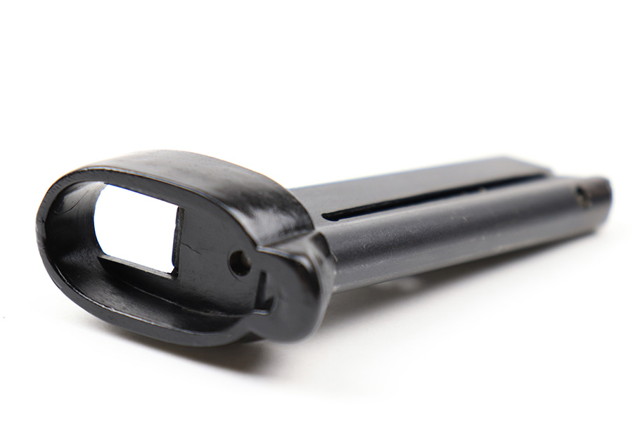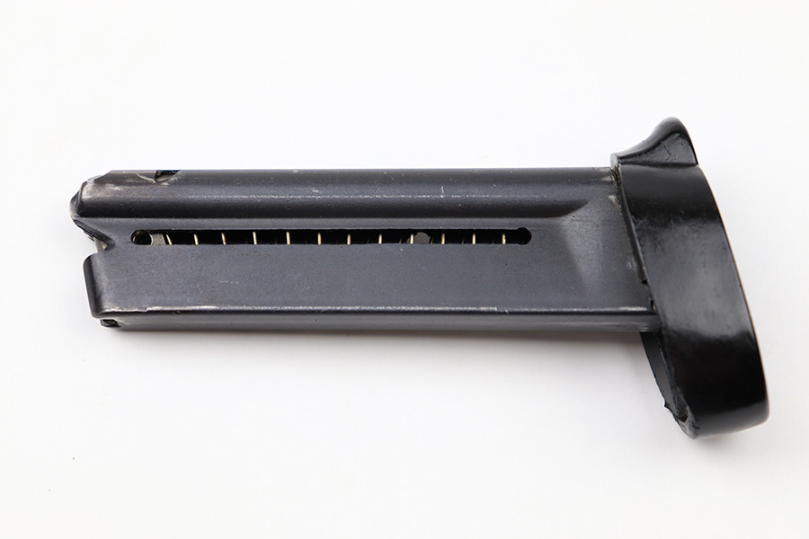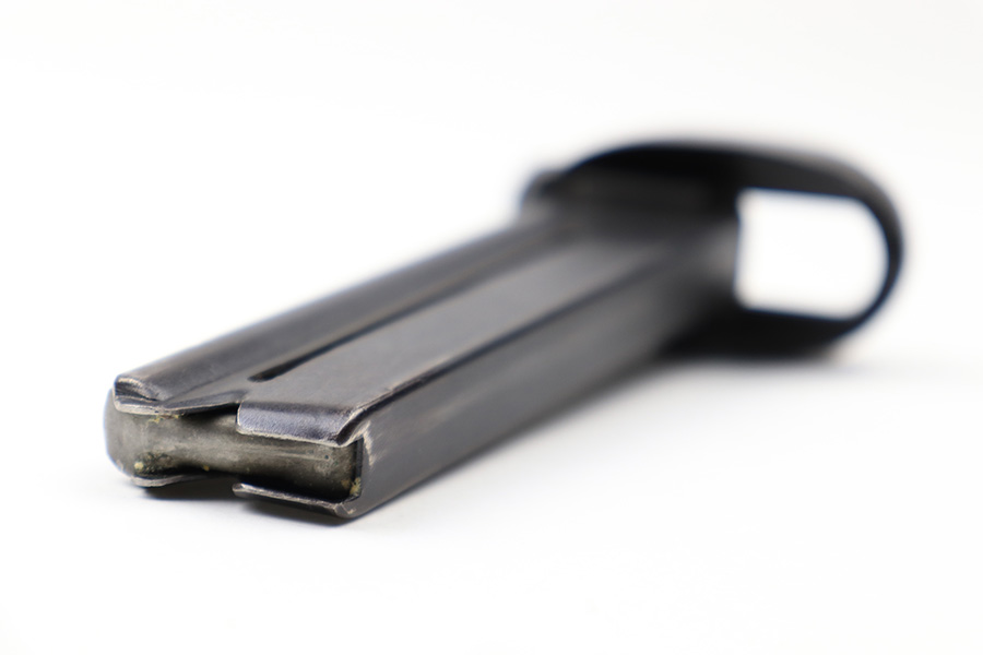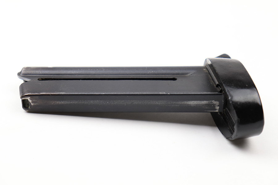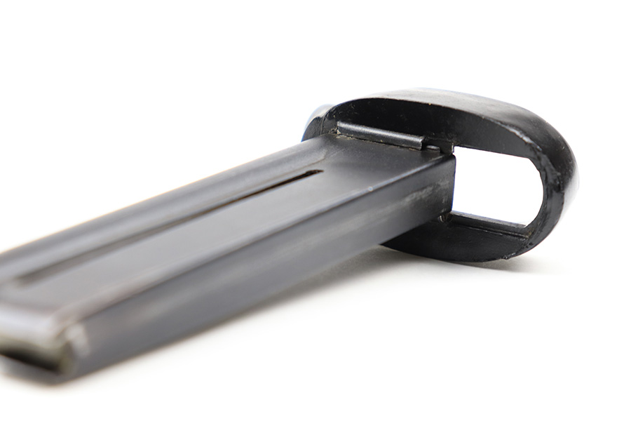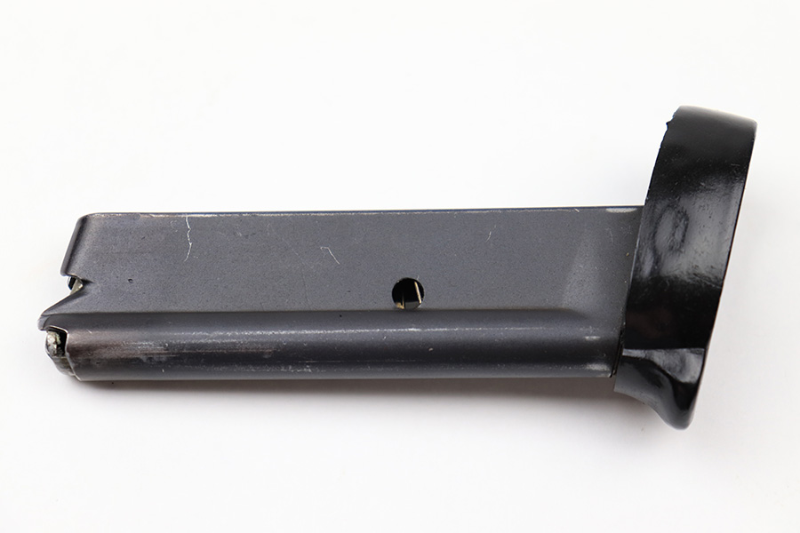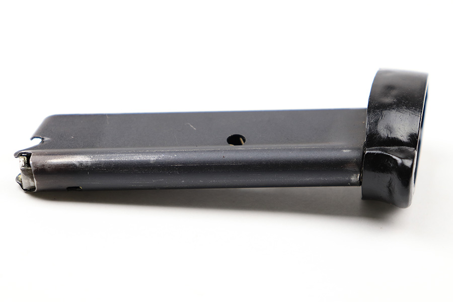 7/14/22 – This is an original, rare variation WW2 production Walther PP magazine in .22 caliber. The magazine is also rare because it has a black bakelite “boxed” finger extension. The finger extension is in great condition but the back “fin” has chipped off as shown in photos. The left side of the bakelite has a small indent as well (we believe this is a small spot of warping). The magazine tube is in excellent condition and the spring is fully functional.