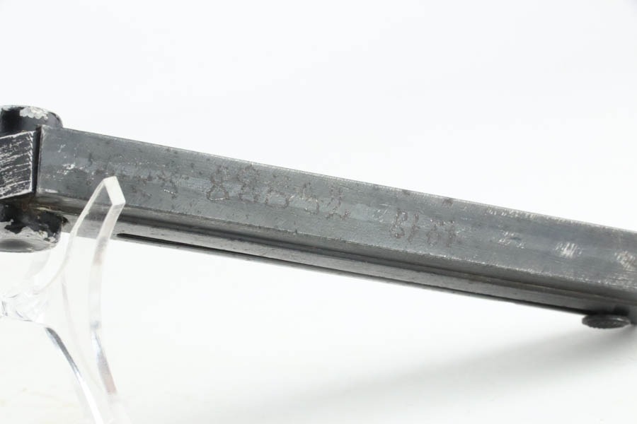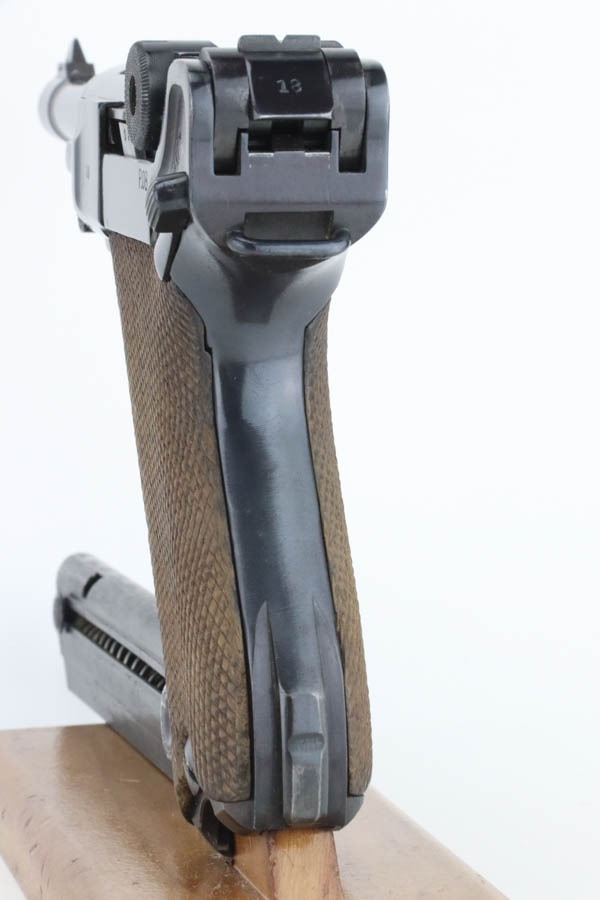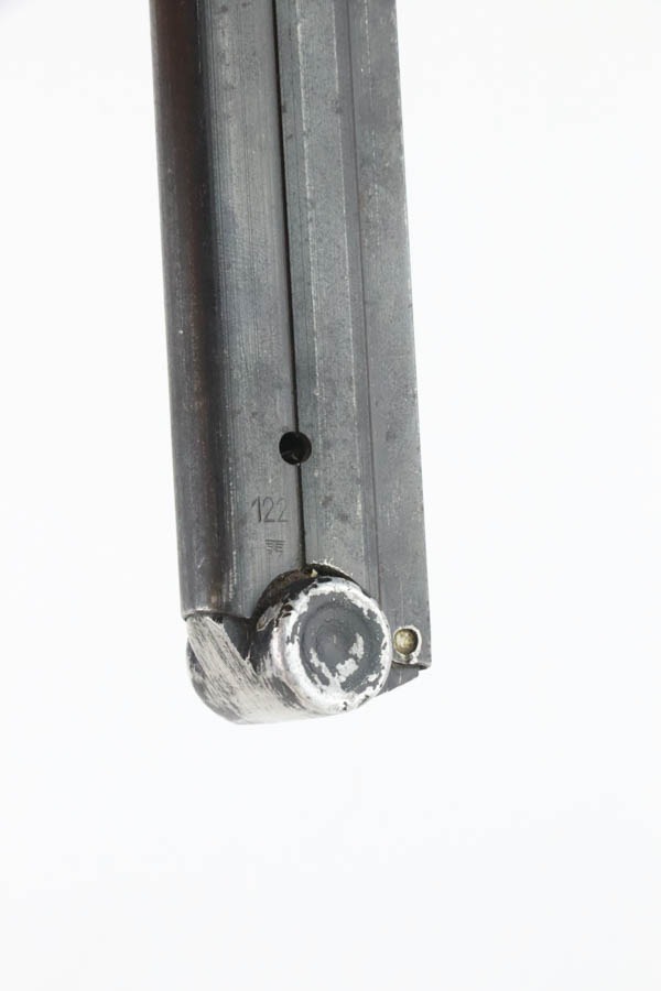 10/29/24 – This is a shooter-grade example of a rare and desirable Luger variation – the 1941/42 Mauser Luger. Only about 7,000 made, making them even rarer than the K date Luger. This one is mostly matching, but the sear bar, firing pin, and hold open are mismatched. It has the proper “Eagle 655” Nazi military proofs. There is very little actual finish loss, but the entire gun has been re-blued. Fitted replacement wood grips. Comes with a “122” “Eagle 37” magazine with a blank bottom that has been painted black. Electro-pencil numbering on the spine. The bore has decent rifling, but there is pitting throughout.