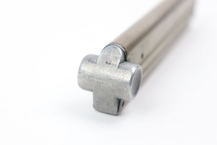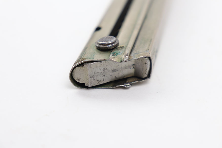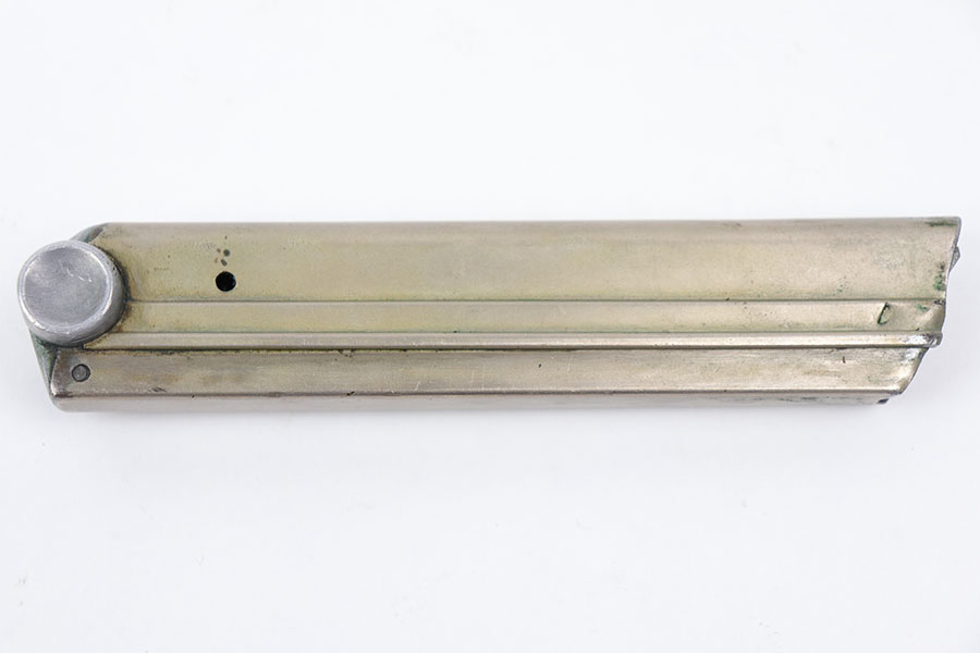 8/18/20 – This is a very rare “42” code luger magazine from WW2. This magazine is especially rare because of the earlier nickled frame. The frame is excellent with minimal wear / aging. The base is stamped with a “42” and no other markings, meaning this was an early factory replacement Mauser magazine. Strong, fully functional spring.